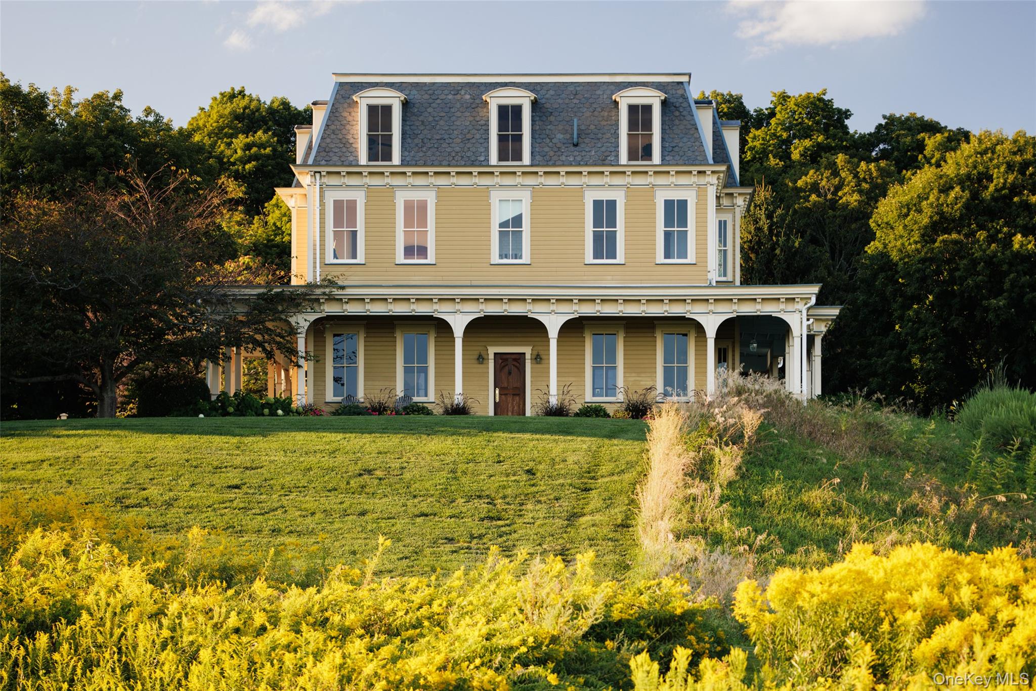 Just a mile and a half south of Millbrook Village, along the scenic stretch of Route 82 where farmland unfolds and county views stretch for miles, a tree-lined driveway winds back from the road to reveal a distinguished country estate. Built in the mid-1990s yet styled with timeless character, this Second Empire Victorian home showcases a sweeping wraparound porch, a classic mansard roof, and intricate dentil molding that capture a bygone elegance. Robust double entry doors open to a grand center hall with soaring 12-foot ceilings. To the right, an office frames sweeping views of the surrounding farmland; to the left, a gracious living room centers on a wood-burning fireplace. A cozy den offers a retreat for quiet evenings, while the formal dining room flows seamlessly to the back patio—perfect for al fresco gatherings. The spacious kitchen features abundant cabinetry, an island, and sun-filled windows framing uninterrupted green vistas. Upstairs, the primary suite includes an ensuite bath, complemented by two additional bedrooms, a full bath, and a second office. A third-floor bonus room offers endless versatility—ideal for a media lounge, playroom, gym, or game space—all surrounded by panoramic views. Set on over five acres, the property is complete with a three-car garage, fenced garden, and meandering walking paths. Less than 90 miles from Manhattan, this home offers the best of country living with easy access to Millbrook’s beloved amenities, including retail and antique shopping, restaurants like Cafe Les Baux, and the much-talked-about House of Stefas, and activities like Innisfree Garden and the Cary Institute.