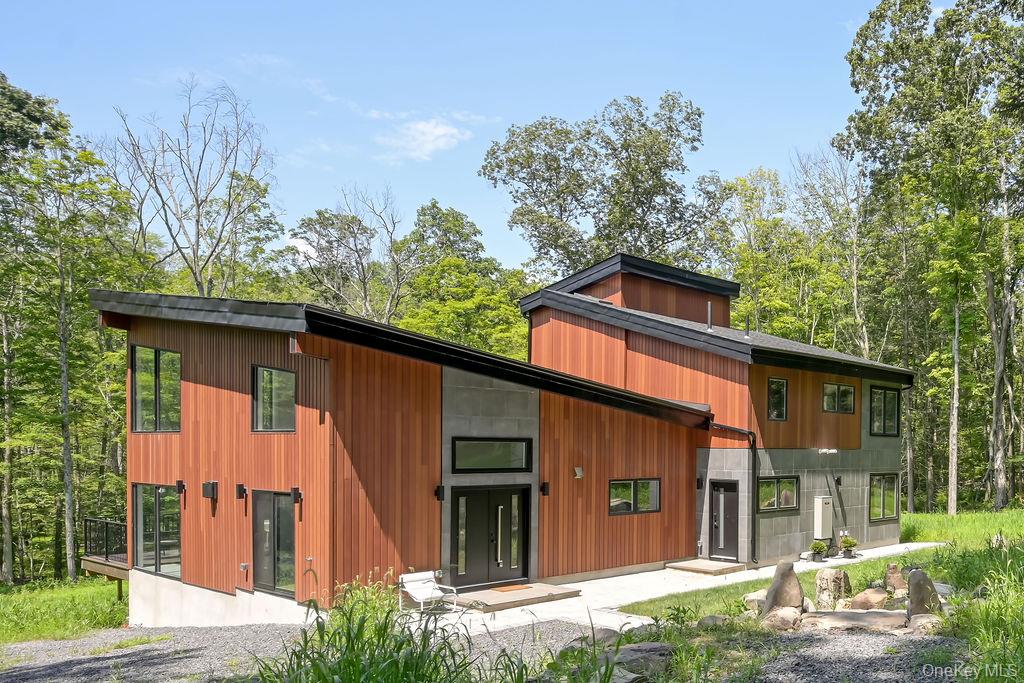 Welcome to Ashokan Forest Haven, a one-of-a-kind escape located between the heart of Stone Ridge and the Ashokan Reservoir. Constructed in 2024, the Haven is composed of clean lines, carefully considered finishes, and an ecological ethos creating a backdrop for adventurous, effortless living harmonized with its forest surroundings. This property can cater to a variety of lifestyles, whether you're envisioning this as your primary residence, an active vacation getaway, or a savvy investment. Situated on 7 private acres, the flawless craftsmanship and attention to detail values clean spaces, eco-friendly attributes and a clutter-free environment, rooted in minimalist principles for mental and physical well-being. The living area boasts double-height ceilings creating a bright and airy ambiance, while two stunning walls of windows seamlessly connect you to the woods. The sunken living area has radiant heat and a fireplace, perfect for warm gatherings on chilly evenings. The open kitchen features sleek rift cut oak cabinets with a rich shou shugi ban finish, quartz countertops, an island with prep sink, beverage refrigerator and a full suite of high end appliances. Wide plank white oak floors are a stylish choice and the multiple pitch shed rooflines create dramatic architectural angles in each room. The primary bedroom suite has an adjoining flex space that can be a walk-in closet or home office, as well as a lofted area with windows and skylights that impart a delightful tree house feel, perfect for yoga, contemplation or artistic pursuits. The two full baths are Korean in style, each has a wet room that contains both the soaking tub and rain shower for everyday luxury, with windows that overlook the private forest. The home’s energy-efficient HVAC electric heat pump system, paired with meticulous insulation, ensures comfort year-round with minimal environmental impact. Every aspect, inside and out, is coherently designed for warm beauty and easy care, using the highest quality materials. The exterior is clad in MAC architectural steel designed to be maintenance-free for years to come. The Trex deck and hot tub are surrounded by breathtaking wooded views and meandering stone walls. Location: It is 5 minutes to the Ashokan reservoir, perfect for a stroll or bike ride. Just minutes from Woodstock/Kingston/Stone Ridge and a mere 2-hour drive from NYC, you'll have easy access to the restaurants, shops, activities and skiing that make this area so special. Embrace the turn-key convenience of this exceptional residence and enjoy the best of upstate living.