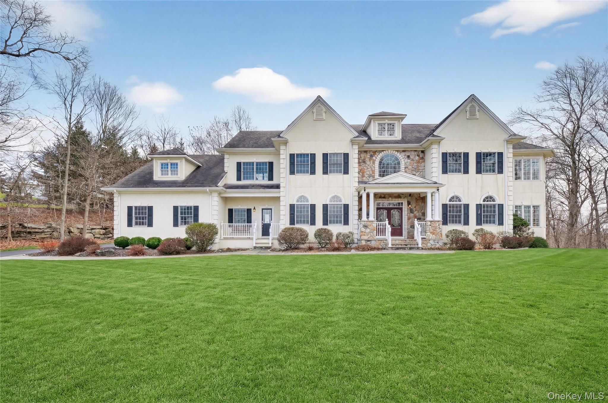 Welcome to Willow Ridge! This gracious and elegant stone-and-stucco colonial is majestically sited on the most favorable cul-de-sac lot. There are 1.2 acres of professionally landscaped property with lush lawns and specimen plantings. Enjoy distant lake/mountain views and beautiful sunsets. The sophisticated and stunning interior boasts attention to detail throughout, featuring custom millwork, gleaming hardwood floors, high ceilings (10 ft. ceilings on the main level and 9 ft. ceilings on the upper level), walls of windows, French doors, and beautiful imported tile flooring. The open floor plan is perfect for entertaining and offers a top-of-the-line gourmet kitchen, a warm and inviting family room with a fireplace and wet bar, a spacious dining room, a formal living room, an expansive conservatory/music room filled with an abundance of natural light, and a home office/au pair/guest room. The luxurious primary suite with a spacious sitting room, four additional bedrooms/three with private bathrooms, a computer work area, and a rear staircase completes the upper level. There is an additional 1,200 sq. ft. of finished space on the lower level, with a full bathroom, perfect for a home theater, playroom, and exercise room, plus plenty of storage. Additional features include two-zone air conditioning, a security system, exterior lawn sprinkler system, town water and sewer, natural gas heat, FIOS connected, and a 200-amp high-current power supply that would be ideal for connecting an electric car charging station. The Carmel community includes parks, sports fields, playgrounds, basketball courts, and the North County Bike Trail. It is a short drive to schools, shopping, the Metro-North train to Manhattan, and Interstate 84 and 684. A truly special place to call home!