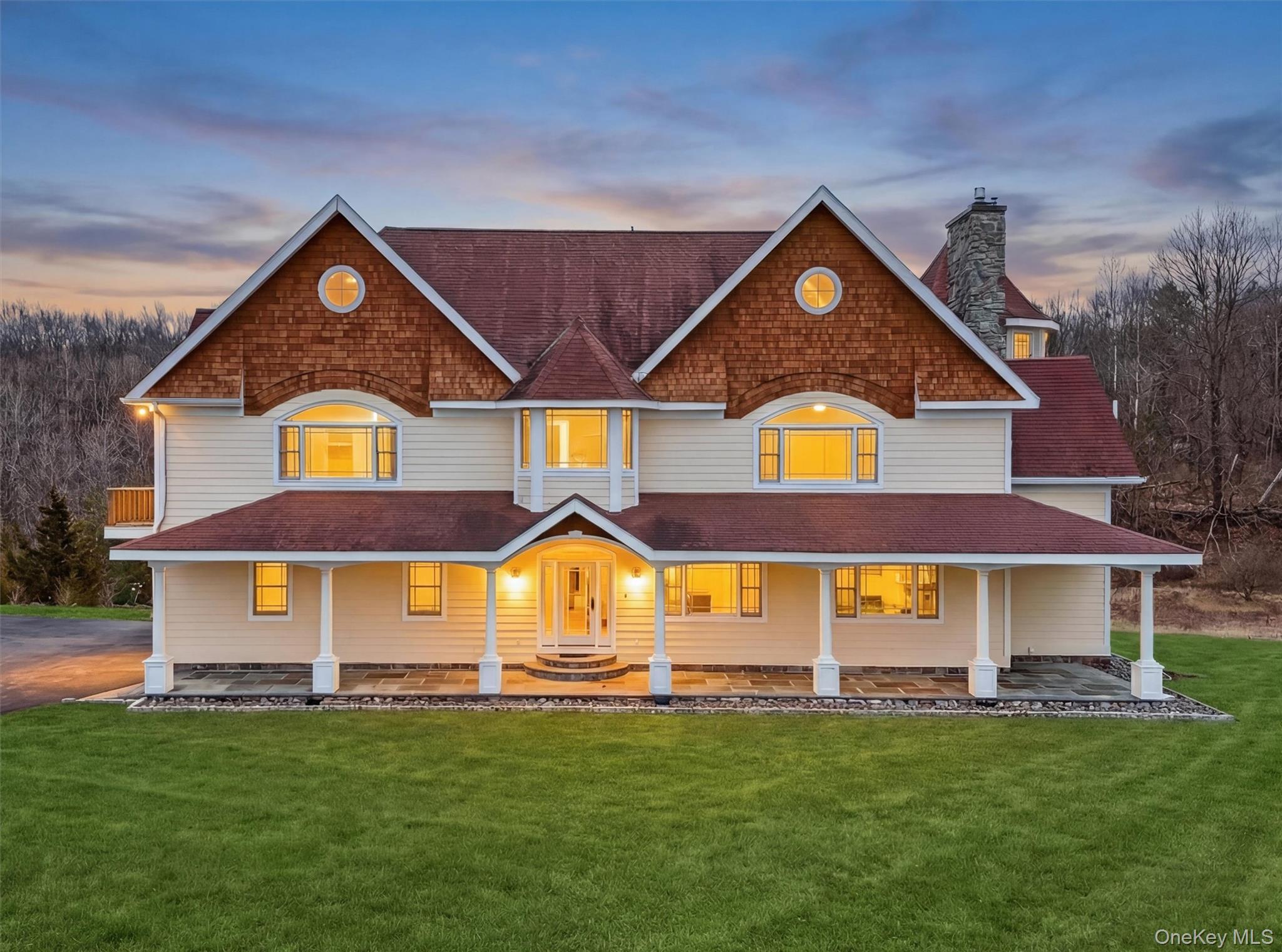 This exceptional estate encompasses nearly eight acres of meticulously landscaped grounds, offering an outstanding Hudson Valley residential experience. Constructed in 2007, the residence exemplifies superior craftsmanship and features a thoughtfully designed floor plan that emphasizes both comfort and functionality. Ideally situated in a scenic rural setting, this premier Hudson Valley location is conveniently located in the acclaimed Red Hook school district, just a short drive from the Taconic State Parkway, NYS Thruway, the Village of Red Hook, and the renowned town of Rhinebeck. From the main foyer, enter the impressive great room, distinguished by exposed wood beams that highlight the high yet welcoming ceilings, and a substantial stone fireplace serving as a focal point suitable for gatherings on cool Hudson Valley evenings. Large windows provide ample natural light throughout the day, enhancing both the spacious living area and the refined formal dining space. The adjoining kitchen is well-appointed with honey-toned shaker cabinets, quartz countertops, and premium appliances, creating an excellent environment for culinary activities and informal hosting. A graceful, curved staircase leads to the second level, home to three private bedrooms. The primary suite is a true retreat, showcasing sweeping panoramic views, Dual walk-in closets, and a spa-like ensuite bath complete with a classic soaking tub, a large step-in steam shower, and a dual marble vanity. Two additional bedrooms provide comfortable accommodations for family or guests; each thoughtfully designed for privacy and relaxation. The primary washer and dryer is located on this floor as well. The third floor boasts a spacious, light-filled open area, perfect for a playroom, studio, or home office with abundant storage options or possible fourth bedroom. On the lower level, a fully self-contained living and dining area includes a modern kitchen with a granite-topped island, ample seating, and a full bath, making it ideal for a media lounge, game room, or guest suite. The French doors lead to a covered paver patio making this area ideal for a future swimming pool. A secondary washer and dryer are also located on this floor. Outdoor living is equally impressive at 48 Eastview Lane, where a sun-drenched back deck offers abundant space for lounging and entertaining, while the welcoming front porch is the perfect spot to unwind and savor breathtaking sunsets against the Catskill Mountain view-scape. Notable additional features of this home include a high-capacity generator, large climate-controlled garage with durable poly enamel flooring, and a 10x10 storage shed. All appliances in both kitchens, laundries, water treatment, and HVAC related equipment are included in the sale. This remarkable property is worth viewing, offering comfort, sophistication, and timeless appeal to elevate your living experience.