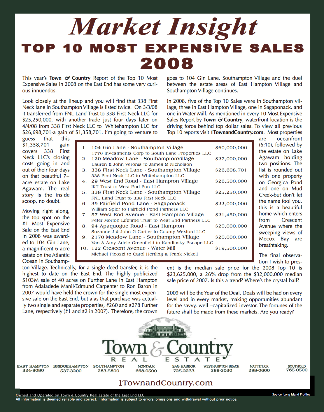 We develop four Hamptons Quarterly Home Sales Reports and four North Fork Quarterly Home Sales Reports. To gauge the real estate market we produce a Mid-Year Hamptons Home Sales Market Report and a North Fork Home Sales Market Report. Finally, we round out the year with a Hamptons Year End Home Sales Market Report, a North Fork Year End Home Sales Market Report, and The Top 10 Most Expensive Hamptons Sales Report.