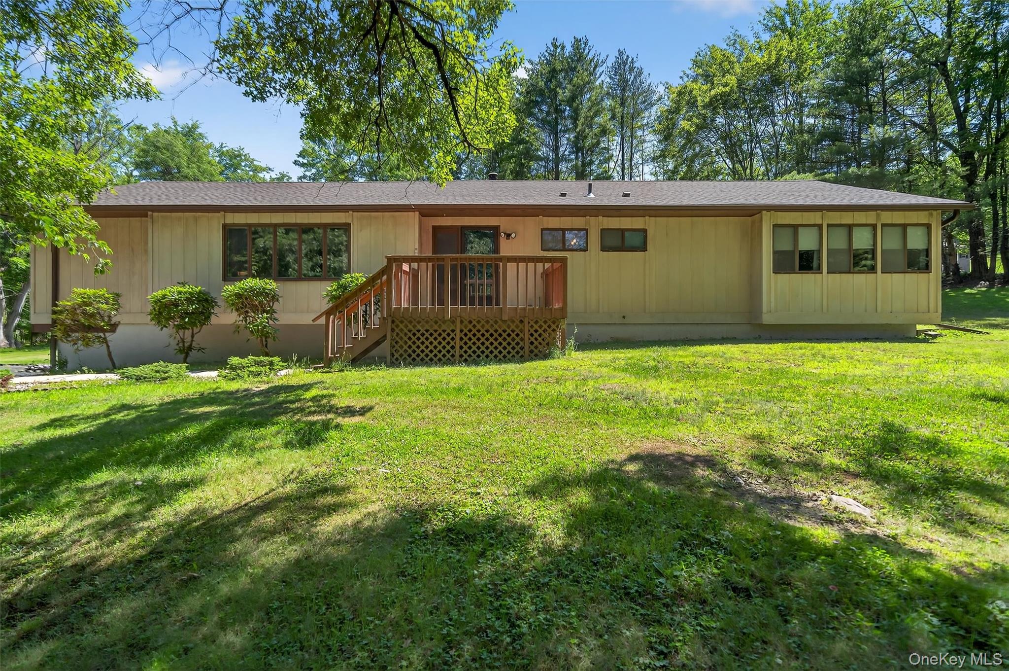 Looking for single story living? You won't want to miss this four-bedroom, two-bath ranch retreat in the heart of picturesque Bloomingburg. Set on a serene, tree-lined lot with winding stone pathways, this 2,250+ sq. ft. ranch has all the space you will ever need, just bring your best design ideas to create your dream forever home! Step inside to a sun-drenched living room where oversized windows frame lush greenery. Discover a snug den anchored by a wood-burning stove nestled in a timeless brick surround—an irresistible spot for curling up with a book or hosting movie nights. Entertaining is effortless thanks to a custom-built bar, while sliding glass doors beckon you onto the expansive back deck—ideal for al fresco dinners or starry-night gatherings. Enjoy the cozy dining area and bright eat-in kitchen, where generous cabinetry and a built-in breakfast nook with bench seating create the perfect space for casual meals. Household chores are made easy by a convenient laundry area, which also features a second door opening onto the deck. Practical touches include an oversized two-car garage with extra storage, ample driveway space, and mature landscaping accented by tasteful stonework. Solidly built and brimming with potential, this home invites your personal style and cosmetic updates to truly make it yours. Extra perk - the home has a brand new roof and gutters with transferrable warranty! Don’t miss your chance to craft lifelong memories in this cozy, classic-charm ranch—schedule your private tour today and explore the possibilities!
