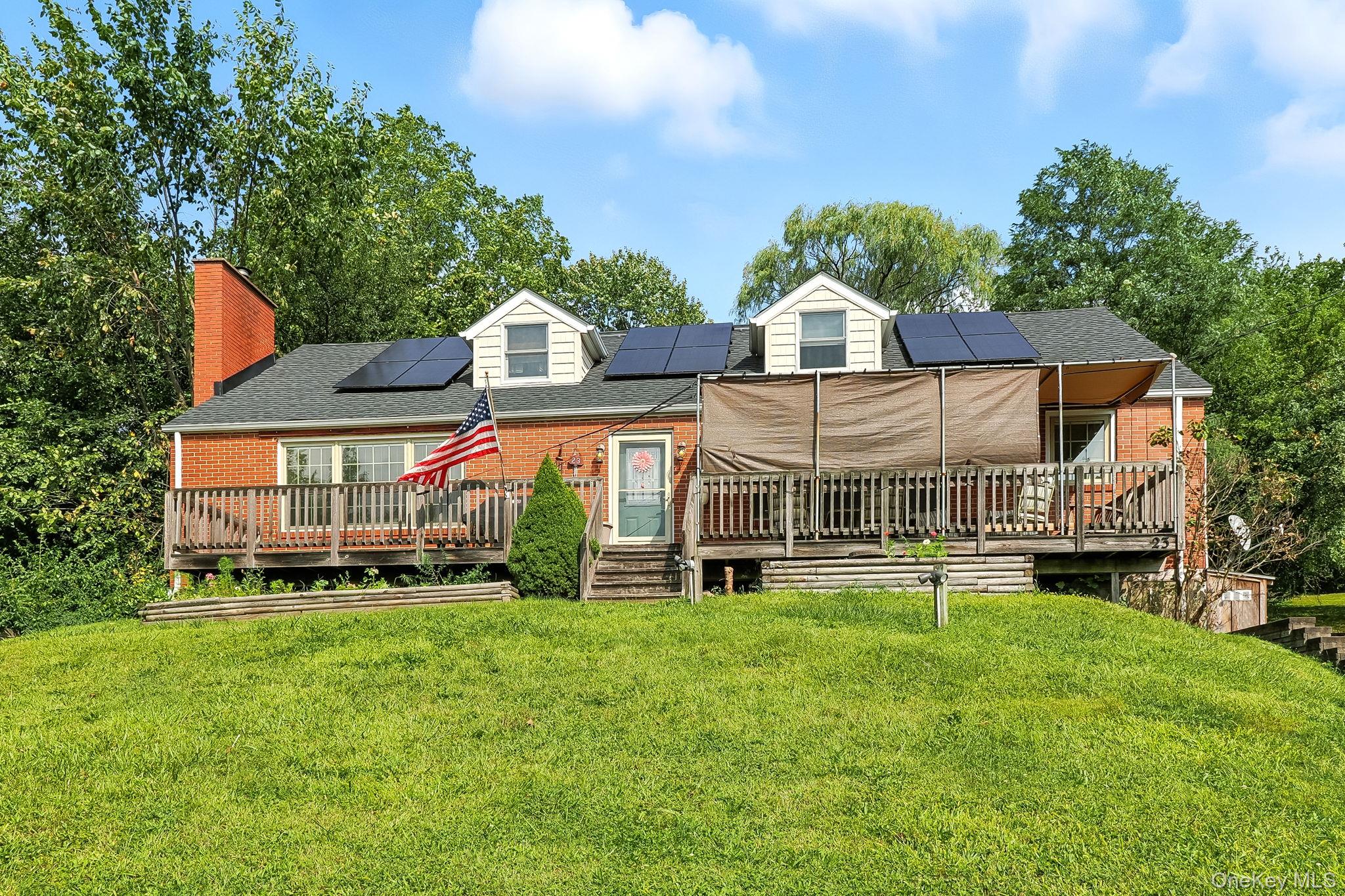 Stylish and unique ranch style home featuring the ultimate open-concept living experience. Enjoy a bright and airy feel with a kitchen showcasing white cabinets and a breakfast bar flowing into the dining room and an inviting living room complete with charming French doors and a cozy brick fireplace. The main floor boasts two comfortable bedrooms accompanied by a full bath. Upstairs, you will find an additional bedroom and versatile office space or family room, as well as another full bath, making it perfect for entertainment. Bask in the picturesque vistas of the Hudson Valley landscape, visible from many areas of the home. This home is quipped with city water, cedar closets, 3 zone heating, new architectural roof and solar panels that the seller is paying off prior to closing. Enjoy the serenity of your new home with Pella and Anderson windows ensuring both aesthetic appeal and energy efficiency. Relax and entertain on the 50 ft expansive cedar deck perfectly positioned to enjoy the views. Close proximity to TSP, shopping and more.