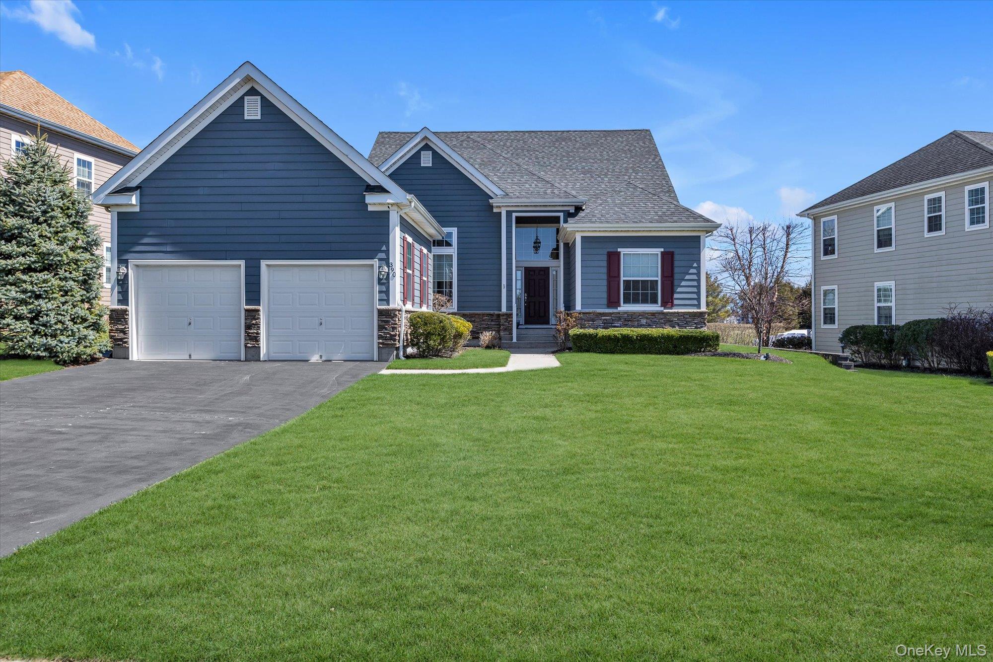 Welcome to 390 Stonecrop Rd. located in The Highlands Club at Aquebogue. This is the Channing Model built in 2014. Original owners. Meticulously maintained. 3 bedrooms and 2 bathrooms. The total living space is 2337 Sq. Ft. and all on one level. The primary En-suite has a 10' step ceiling, double sink vanity and 2 walk-in closets. The open concept floor plan offers a great room with a gas fireplace and a spacious dining/eating area both with 13' ceilings! Hardwood floors throughout. Ample closets and storage. Natural light abounds throughout the living space. An open ended kitchen allows for easy flow and a full view of the living space for ease of entertaining. A bright and airy sunroom leads out to the backyard surrounded with mature plantings and a stone patio. The unfinished basement is 1889 Sq. Ft. and has the required egress for potential rec/living space with proper permits. Attached 2-car garage for direct access to the house and the laundry room. The community center offers a clubhouse with an exercise room, game room and a kitchenette. There is also tennis/pickleball court and an inground heated pool. Conveniently located to all the North fork has to offer...fine restaurants, several golf courses and clubs, shopping, wineries and breweries, farm stands, LI Sound beach and Peconic Bay beach. 2% CPF Tax applies.