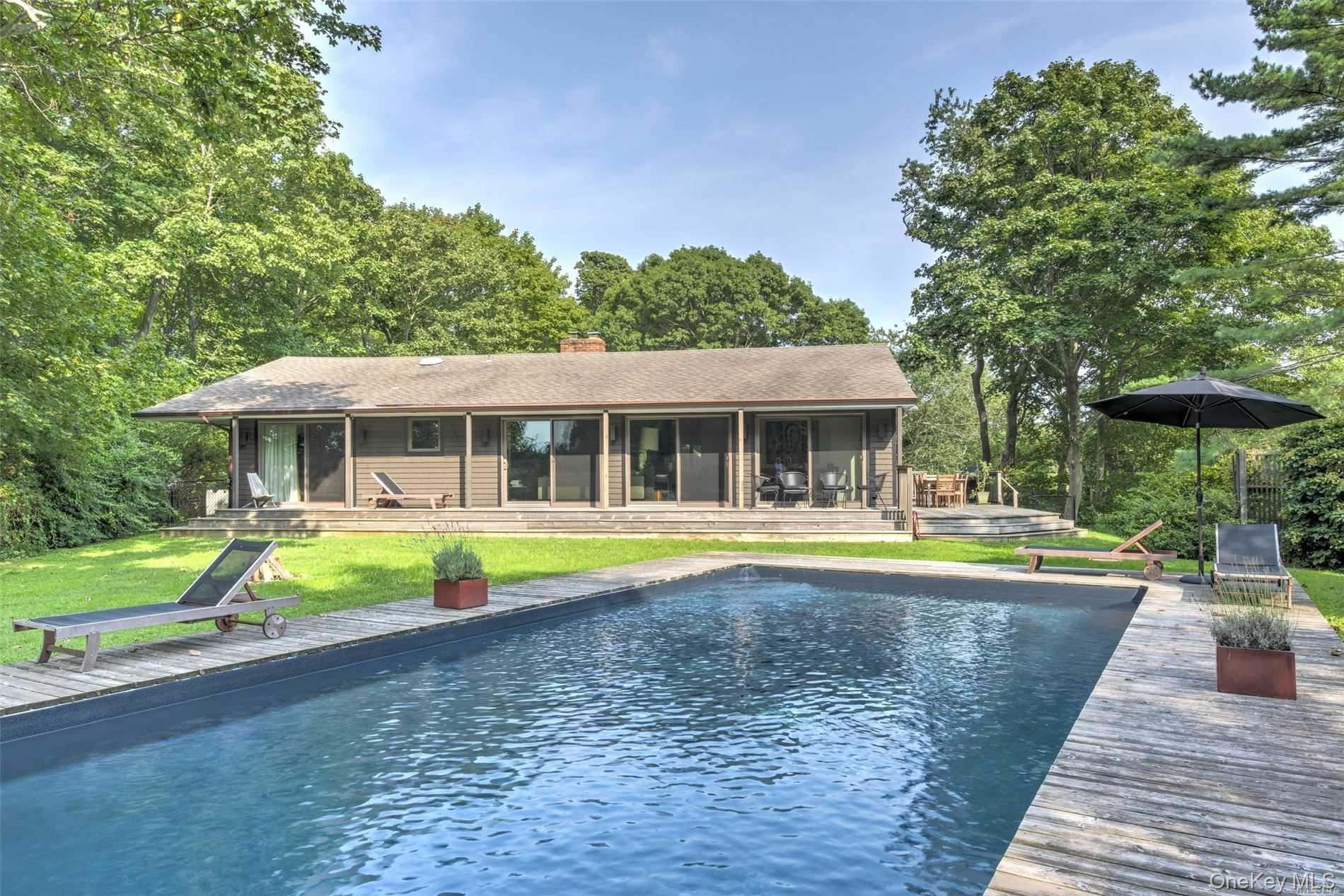 Entertain poolside in this stylish Mid-C Modern set on 2 acres, with views of Orient Harbor & the Sound. Handsomely furnished with master bedroom with full bath plus 2 additional bedrooms & full bath, large gourmet kitchen, den, spacious living room/dining room/common space opening to wrap-around deck overlooking pool. Walk to Village, Latham's farm stand. July 16-30 $15,000; Aug 1-15 $17,500; Aug-LD $35,000. Permit# 0321.