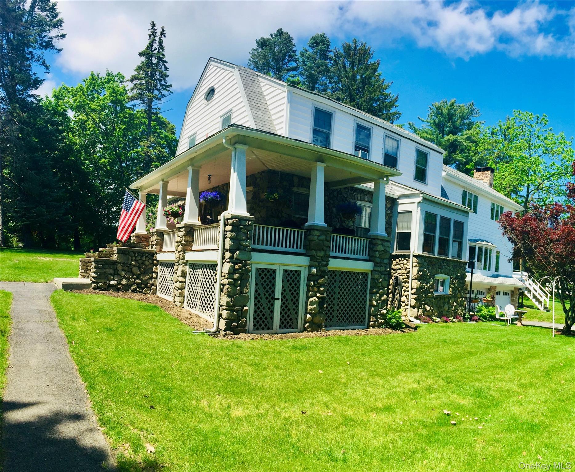 Steeped in character and timeless appeal, this 1930 Colonial invites you in with its striking stone façade and a graceful partial wrap-around porch—an ideal spot to enjoy quiet mornings or unwind at the end of the day. Inside, the home blends classic craftsmanship with modern comfort, featuring rich wooden floors that flow seamlessly throughout the main level. The first floor offers a warm and welcoming layout: a bright living room, an elegant dining room, and an eat-in kitchen equipped with stainless-steel appliances. A convenient half bath adds practicality, while the expansive family room becomes the heart of the home, complete with abundant natural light and a cozy wood-burning fireplace perfect for gatherings. Upstairs, the spacious primary suite feels like a retreat, offering an en-suite bathroom and a generous walk-in closet. Three additional large bedrooms and two more full bathrooms ensure everyone has room to spread out comfortably. A full stand-up attic provides exceptional potential—imagine a game room, additional bedrooms, a studio, or a private office. The possibilities truly are endless. Outside, an outbuilding with electricity opens the door to even more creativity—workshop, hobby space, storage, or a future guest cottage. The long driveway provides ample parking and leads to a two-car garage for added convenience. Located just minutes from shopping and dining, and a short drive to beloved destinations like Bethel Woods, Legoland, and more, this home offers the perfect blend of charm, space, and accessibility. It’s a rare opportunity to own a property with history, character, and room to grow.