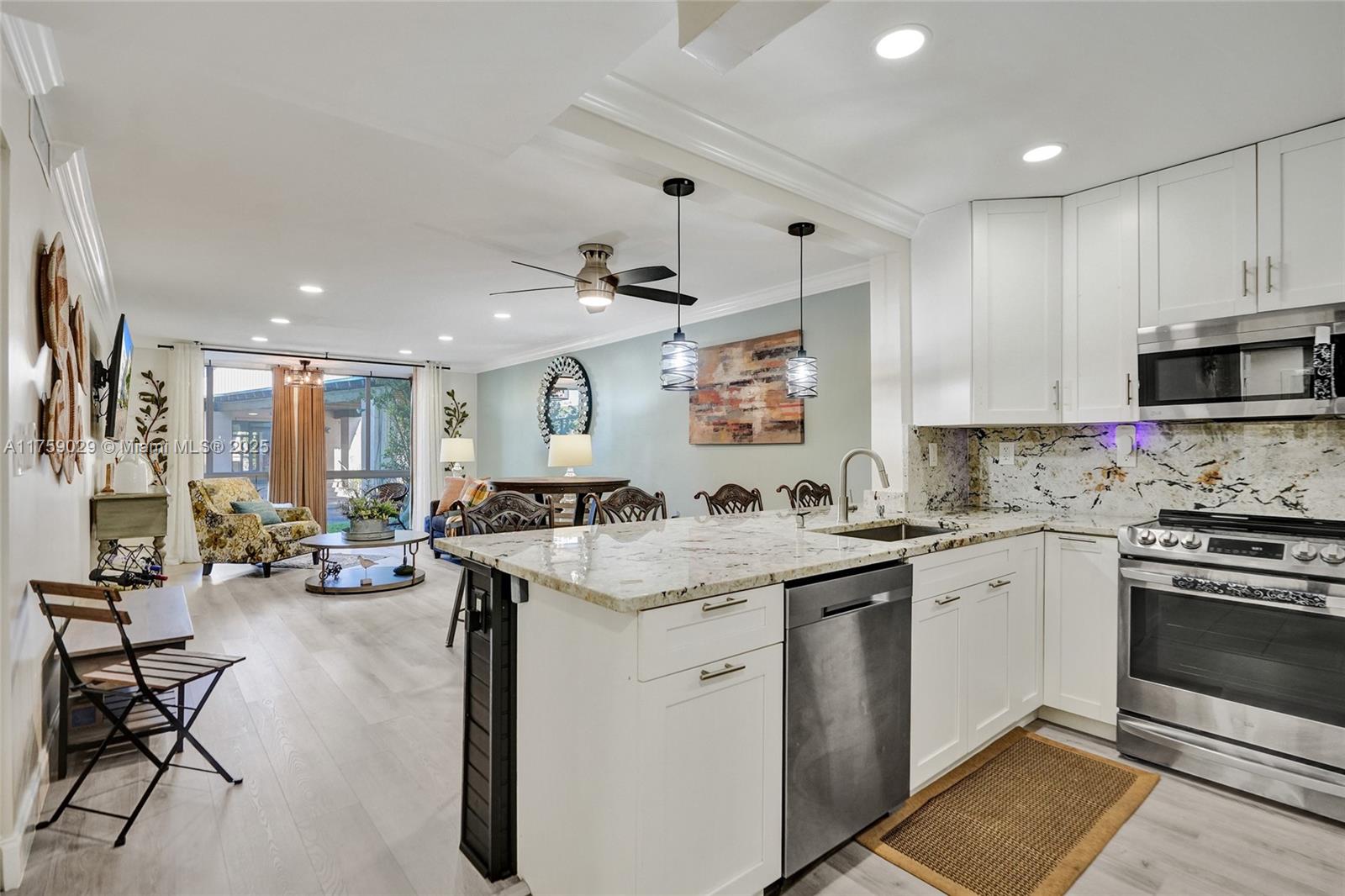 Make this piece of heaven on earth your home! Nestled on the 1st floor enjoy the peace of ease. This modern yet homey corner unit home is designed for ultimate comfort and style, featuring hurricane-proof windows and doors throughout. Gorgeous wood accents, including tongue and groove details, add warmth and character, while crown molding and recessed lighting elevate the entire space. The gourmet kitchen is a chef's dream, with stainless steel appliances and a beautiful marble island. Enjoy the serene enclosed patio with a Bluetooth audio fan, perfect for relaxing or entertaining. The updated electrical system, 2018 A/C, and organized closet ensure modern convenience, while ceiling fans in every room provide year-round comfort. This home is truly customized for your lifestyle!