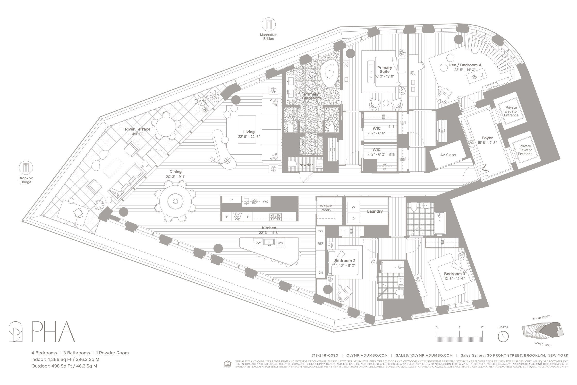 Immediate Occupancy. On-site model residences now available to tour by appointment. Presenting Penthouse A: The crown jewel of Dumbo. With 360 views and a private 498 SF river-facing terrace, this four-bedroom, three-and-a-half bath penthouse is 4,266 SF of entertaining perfection. Perched atop of Olympia Dumbo, PHA spans across the entire top floor, boasting breathtaking views from the 33rd floor, and ceiling heights up to 13’. Arriving home via elevator to a private landing, the formal foyer and gallery lead to the sun-filled living and dining areas, highlighting remarkable views of the Brooklyn Bridge, Manhattan and New York Harbor. The living area is finished with a wet bar featuring white maple cabinetry, Calacatta Vagli Oro marble backsplash, stainless sink and a Thermador wine cooler. The Workstead-designed kitchen is stylishly separated from the main living area and features a spectacular island with Calacatta Vagli Oro marble and chamfered edges, white maple cabinetry paired with satin nickel hardware, Gaggenau appliances and a separate walk-in pantry. A laundry room with side-by-side LG W/D, and the powder room are discreetly located off the main hallway. The powder room features a custom vanity with a stone top, and Federal Blue tile floors. The Manhattan Bridge-facing primary suite features double walk-in closets, a linen closet, and an exceptional en-suite bathroom. With Agglo Ceppo honed stone walls, flooring and countertops, a custom double vanity with satin nickel pulls, deck-mounted faucets and controls, dual water closets, dual showers, and a freestanding soaking tub. As a spacious, separate room just off the foyer, the den/fourth bedroom features curved windows and multiple closets, the perfect space for working or unwinding. In their own wing, the additional two bedrooms feature en-suite bathrooms with Federal Blue tile flooring, undermount tubs with brushed nickel fixtures and custom maple vanities. Olympia is a modern interpretation of its surroundings. With exteriors by Hill West Architects and interiors by Workstead, the 76 homes reflect a sense of scale and rhythm that are grounded in the maritime and industrial heritage of Dumbo's waterfront. Olympia is designed to maximize comfort and convenience, boasting over 38,000 SF of indoor and outdoor services and amenities spread over 3 levels. The Garden level features ground-floor amenities. Through a private entry court, a porte coche`re welcomes you to a sheltered vestibule, and to the building’s triple-height lobby. The fully serviced lobby features a sculpture by Jacob Hashimoto and floor-to-ceiling window walls. Adjoining the lobby is the private garden lounge, perfect for reading a book, while overlooking the MPFP-landscaped Gair Gardens. Located in the building’s lower level, The Club is all about fun and fitness, complete with a game lounge, bar, bowling alley, fitness center, spin studio, boxing gym, private locker rooms and maritime-themed kids’ playroom. The Bridge level of Olympia is located on the 10th floor and offers a variety of indoor and outdoor amenities. Features include a 60’ indoor lap pool, wellness amenities, a 58’ outdoor pool and hot tub, cabanas, barbecue areas, children’s playground, and a full-size tennis court overlooking the Brooklyn Bridge, lower Manhattan & beyond. Additional services include private on-site parking available for rent or purchase, 24-hour doorman and concierge, package room with refrigerated storage, bicycle storage and private residential storage available for purchase. Sponsor: Fortis Dumbo Acquisition, LLC, 45 Main St, Suite 800, Brooklyn, NY 11201; Sponsor makes no representation or warranties except as may be set forth in the offering plan filed with the NYS Department of Law. The complete offering terms are in an OP available from sponsor. NYS Department of Law File No. CD20-0174. Equal Housing Opportunity. Co-exclusive.
