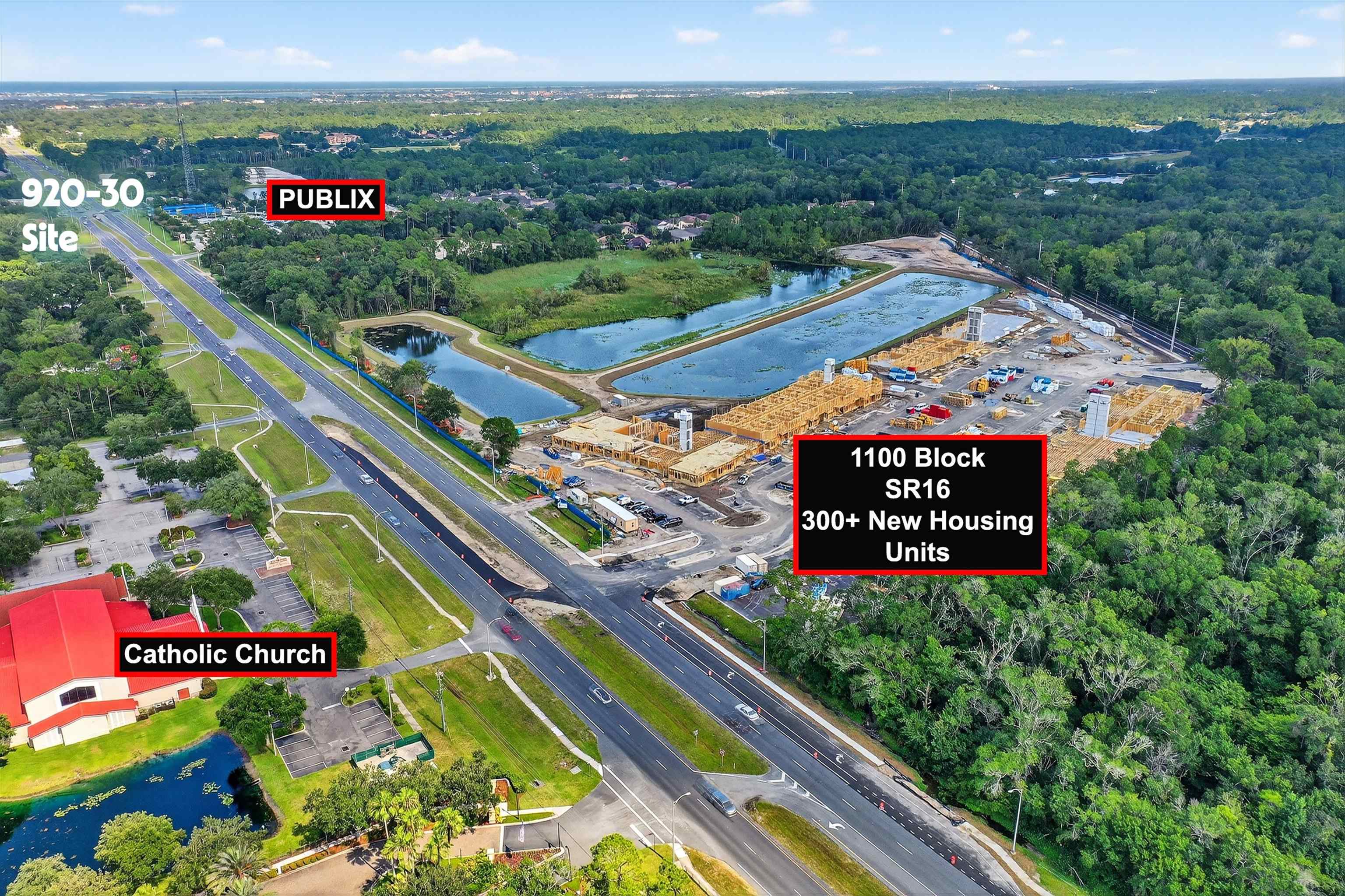 Location, Location, Location. Two sites 920 & 930 selling as one. Developers and business owners looking for quality sites on main highways take note. Don't miss your opportunity to acquire this Ultra Prime Location. Literally one of the Last Quality Sites in this extra high growth corridor surrounding SR 16 and Woodlawn Rd. Synergy is at an all time High. In the last 2 years every site available has sold and is in construction phase or will be soon. Traffic count (ADT) in the area is increasing for several reasons. First, Holmes Blvd to the S. of 16 has recently had the first mile of the 312 extension completed. Second, Woodlawn Rd to the N. of 16 is in the process of being widened. Third, there are approx 550 new housing units coming to the immediate area not counting the Tapestry which recently opened a mile to the West. Tapestry is a top end rental community with around 300 units. Please note the aerial pics will detail the location of the developments around this site for sale There are literally 6 new developments in various stages within a 1/4 mile of this site. Development #1 is 234 housing units in the 800 block of SR 16. They plan to start construction soon. Development #2 is another housing project in the 1100 block of 16 approved for over 300 units. They are under construction. Development #3 is a 6 acre project at 1065 SR 16 directly W. of Publix where clearing just completed. Development #4 is an emergency medical clinic at 890 SR 16 which is the NE corner of 16 and Woodlawn. Bldg is under construction. Development #5 is a dental office combined with a drive thru coffee shop. The group should start construction in the next few months. Development #6 is a 10, 000 sqft veterinarians office directly N. of South State Bank on Woodlawn Rd. which is still in planning (see pics for the 5 development sites) To make it easy for your clients to know if the Commercial General Zoning (CG) meets their needs the following is copied from the county documents detailing what is allowable under this zoning category. ARTICLE II ZONING DISTRICTS AND SPECIAL USES E. General Business and Commercial Uses 1. Land Use activities in this category are those which serve the surrounding neighborhood, a small group of neighborhoods, or are community serving. Uses typically require direct access to Collectors and Arterials, may operate primarily in daytime or early evening hours. Development may generally include a predominance of one-story and low-rise Buildings outside of activity centers. Uses tend to be in individual Structures or in community scale shopping centers. This category does not include large-scale discount supercenters or big box retailers. In addition, not all Uses are allowable by right in every zoning district. Refer to Section 2. 03. 00 which describes allowable Uses and Special Uses by zoning district. 2. Typical Uses in this category include commercial recreation, archery facilities, entertainment, retail, hospitality, and general business, such as retail goods stores; financial institutions with or without drive-through facilities; pharmacies with or without drive-through facilities; free-standing ATM’s; funeral homes and mortuaries; crematoriums; indoor farm and garden supply centers; outdoor plant sales; outdoor storage; neighborhood Convenience Stores with or without gas pumps; gas stations without auto service or repair; car wash facilities; automobile oil change facilities; tire service centers; small car rental offices with associated rental fleet; grocery stores, specialty food stores, and supermarkets; bowling alleys, billiards and pool parlors, spas, gyms, and health clubs; community hospitals; commercial, vocational, business or trade schools; Bed and Breakfast establishments and guest lodges limited to a maximum of ten (10) rental units; personal property mini-warehouses; Recreational vehicle/boat storage; service businesses such as blueprint, printing, catering, travel agencies, mail and package services, small appliance repair shops, upholstery, and laundries; personal services such as beauty shops, barbers, employment services, bail bond agencies, photography studios, psychics in accordance with St. Johns County Ordinance 9818, as may be amended, Adult Care Centers, Child Care Centers, Nursing Homes; psychiatric care and treatment facilities with or without housing, alcohol rehabilitation centers with or without housing, Restaurants with or without drive-through facilities; Brewpubs and Microbreweries; Community Marinas, Marinas; general offices, medical offices, veterinary offices without outside boarding facilities and enclosed within a sound proof building with no more than ten (10) outside runs which shall not exceed a total area of six hundred forty (640) square feet, animal care facilities, Professional Offices, and government offices; golf driving ranges; schools for the performing or fine arts and for martial arts; movie theaters with three (3) or less screens.
