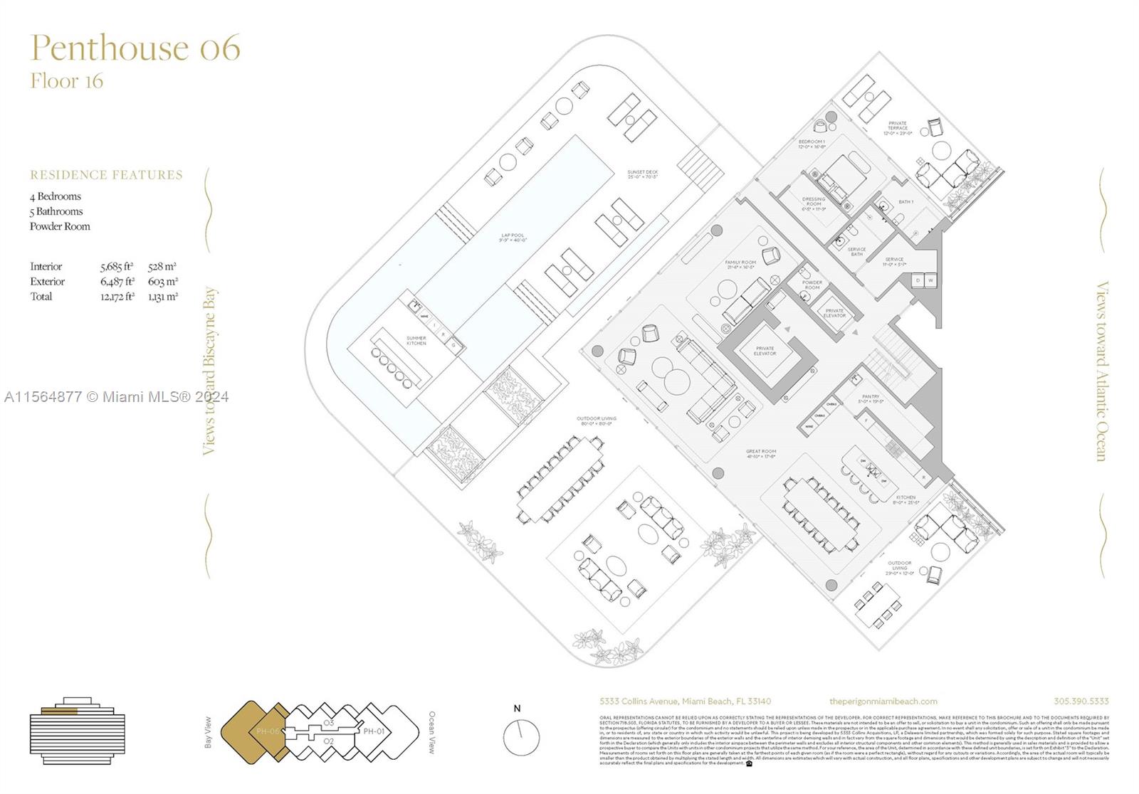 Rising from the most peaceful and expansive stretch of sand on Miami Beach’s coastline, The Perigon is an unprecedented collaboration between three global design icons. The rare seclusion, matchless amenities, and impeccable service of this unique private enclave promises residents an exclusive Miami Beach lifestyle. This PH 4 bedroom residence with over 5685SF of living space and 6487SF of terraces makes this one of the best PH options on the market. Buyer chooses - Kitchen cabinets, flooring options, closets installed - Developer inventory is subject to change based on activity of sales. Gas cooking, Wolf & SubZero appliance, stone countertops Parking is self park or valet park (owners choice) - Contact the Sales Gallery to learn more about the finest new building in Miami Beach.