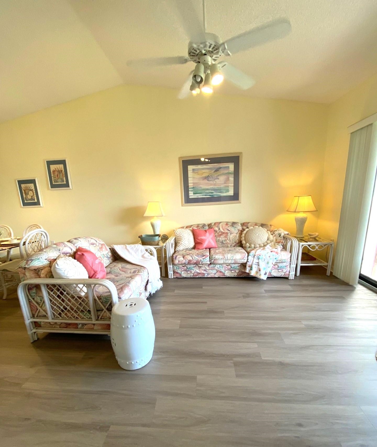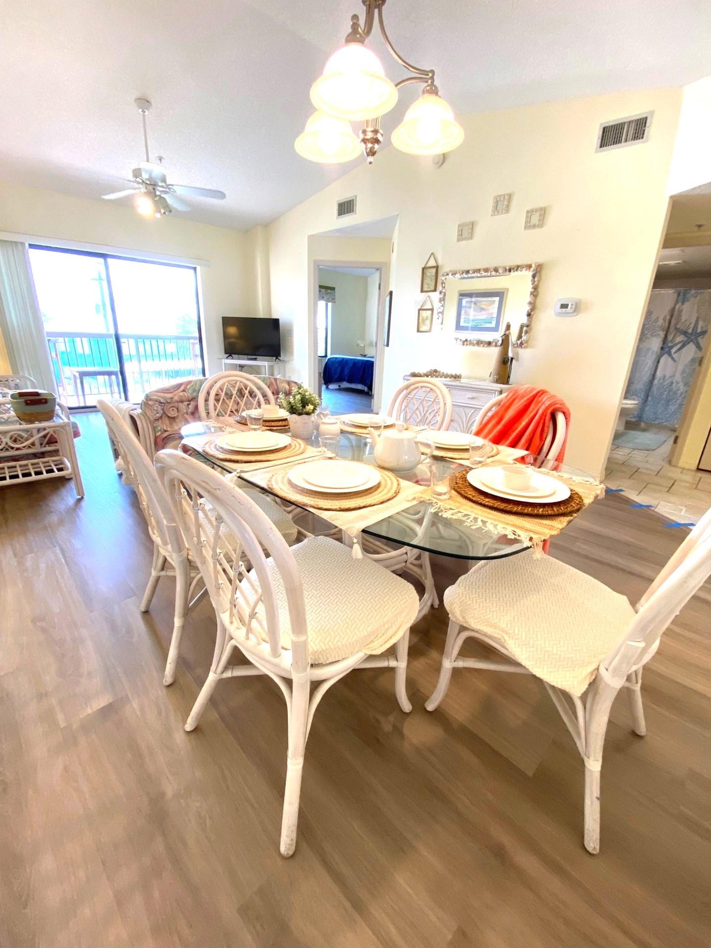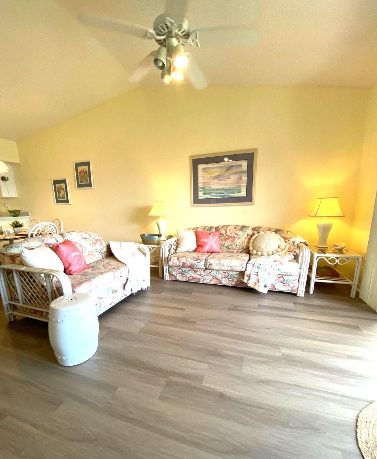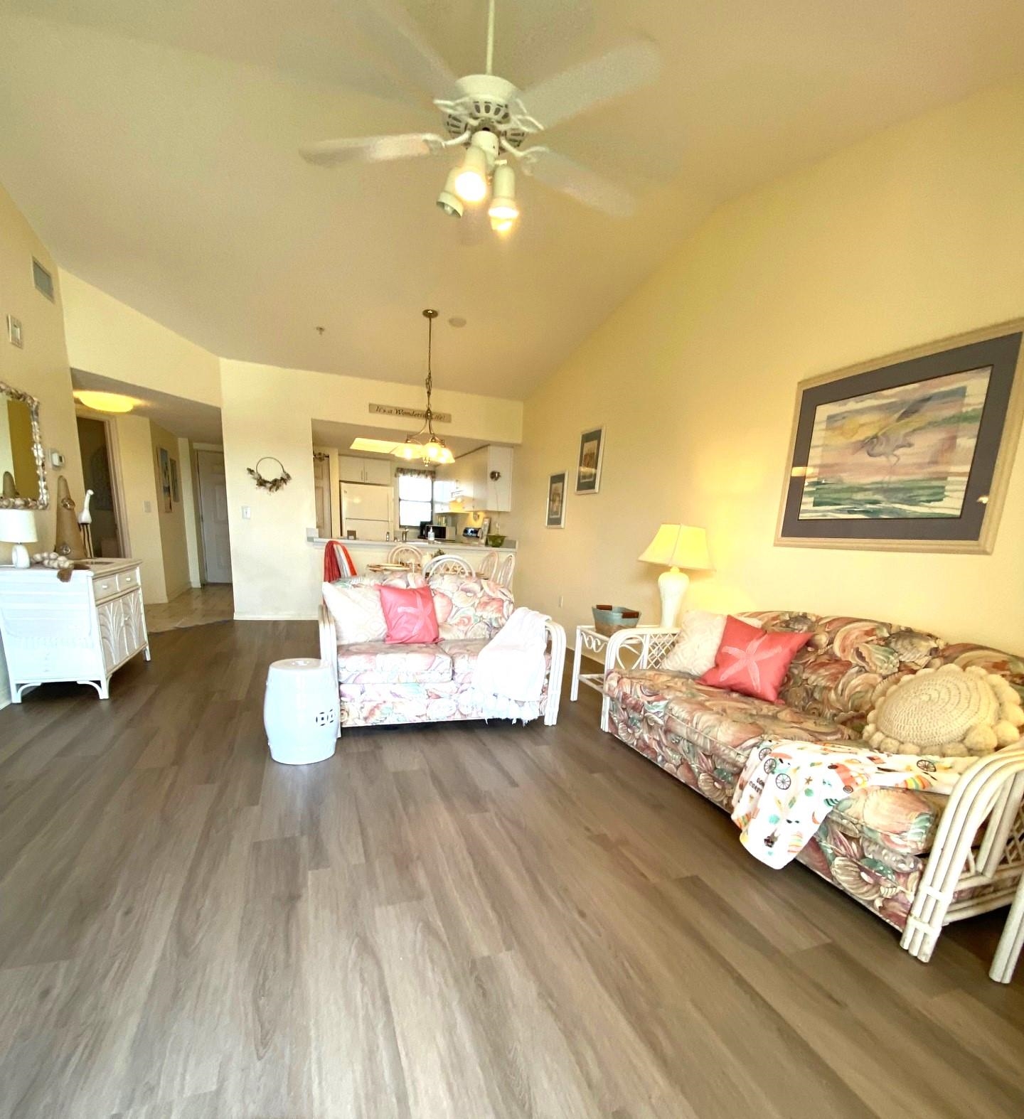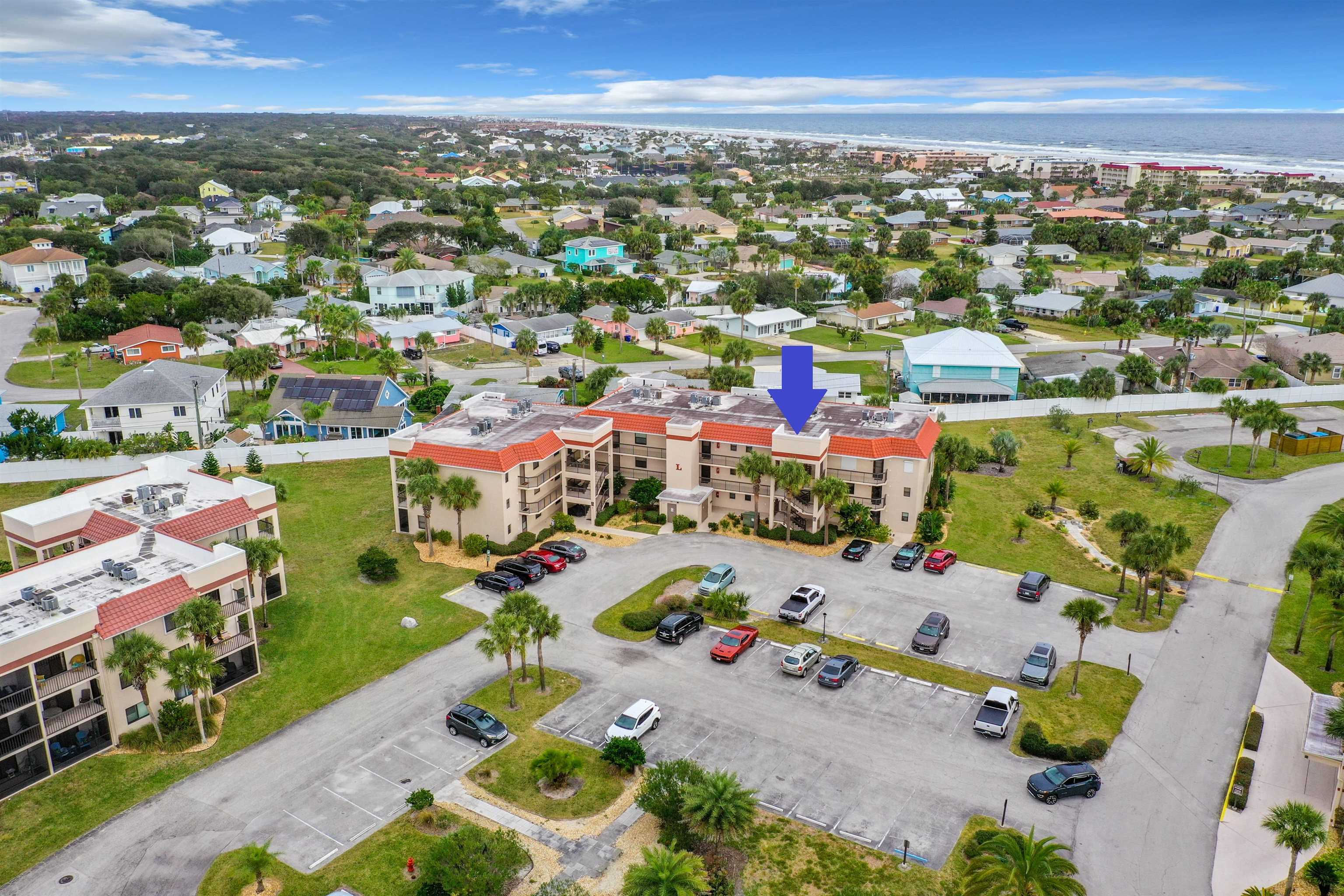 2BR/2BA condo in Elevator Building is the largest and most spacious floor plan at the oceanfront community of Ocean Village Club. Third Floor unit feels like a tree house at the beach and this building is one of only 5 that offers an elevator, so no stairs required. This unit has new luxury vinyl plank flooring in all rooms but kitchen and baths. Rare to the market, this beauty also features the high vaulted ceilings that only some 3rd floor units offer. Ocean peeks from Master Bedroom and Lanai. Located across from the clubhouse, fitness center and heated pool. The oceanside pool and beach are just a short walk. Conveniently located near the community grills and outdoor dining pavilion. Ocean Village Club also offers tennis courts, gated entrances, car washing area and plenty of community activities. Located in the heart of St Augustine Beach at the corner of A1A and Dondanville Road. You can park your car and walk or bike to coffee shops, restaurants, entertainment, grocery stores, salons, farmers market and more. From sunrise to sunset there's plenty of fun. This is a pet-friendly complex allowing owners to have two pets with no weight or size restriction, but only excluding aggressive breeds per their master insurance policy. Monthly condo dues include cable, WI-Fi, water, sewer, master insurance, community maintenance and access to all amenities. Owners make a 13th payment of $450 towards Reserve Funds with the next payment due October 30, 2024. Buyer will assume all future payments. Measurements are rounded down per MLS constraints. Buyer to verify all pertinent information such as room sizes, condo association information, etc.