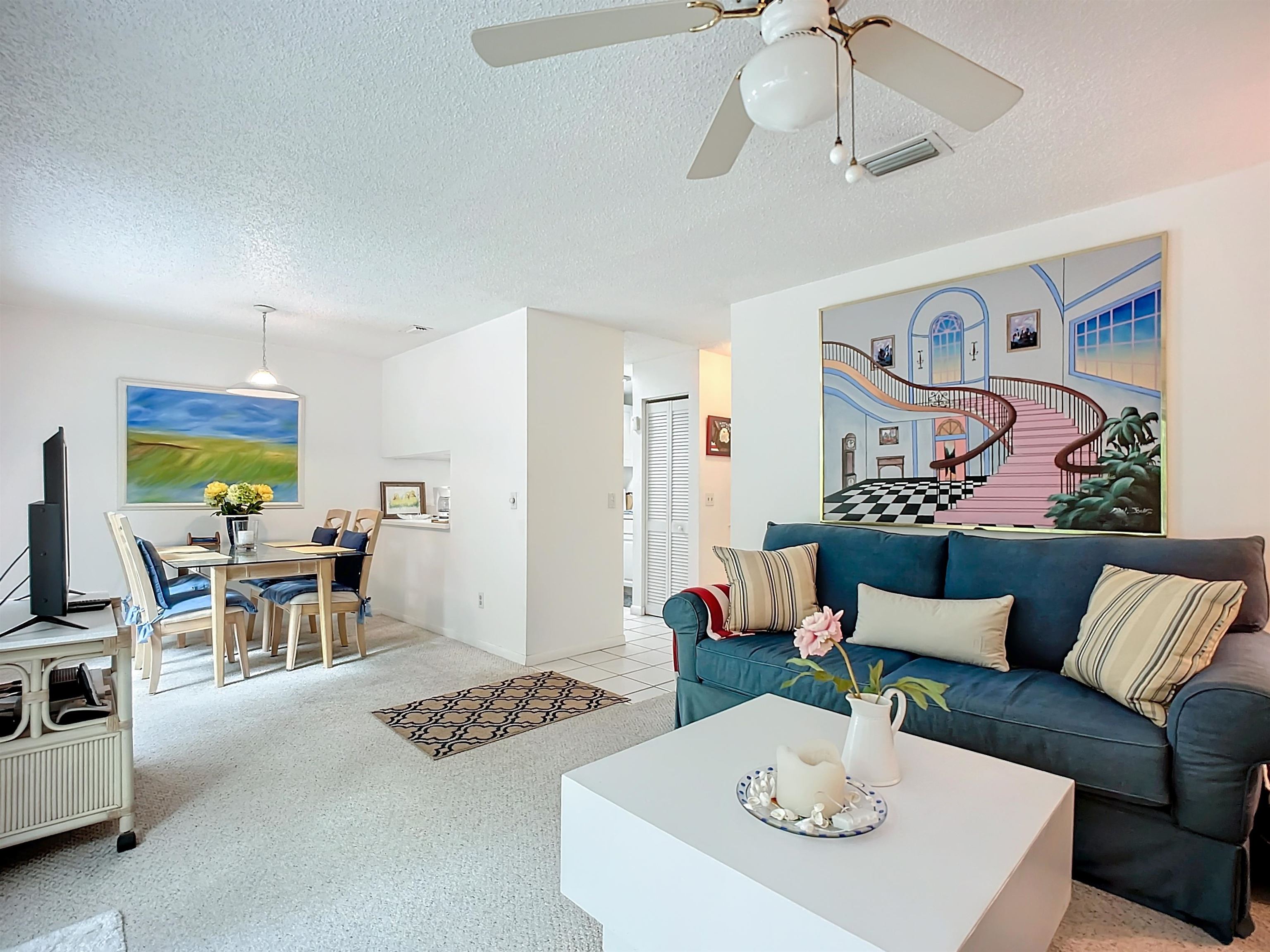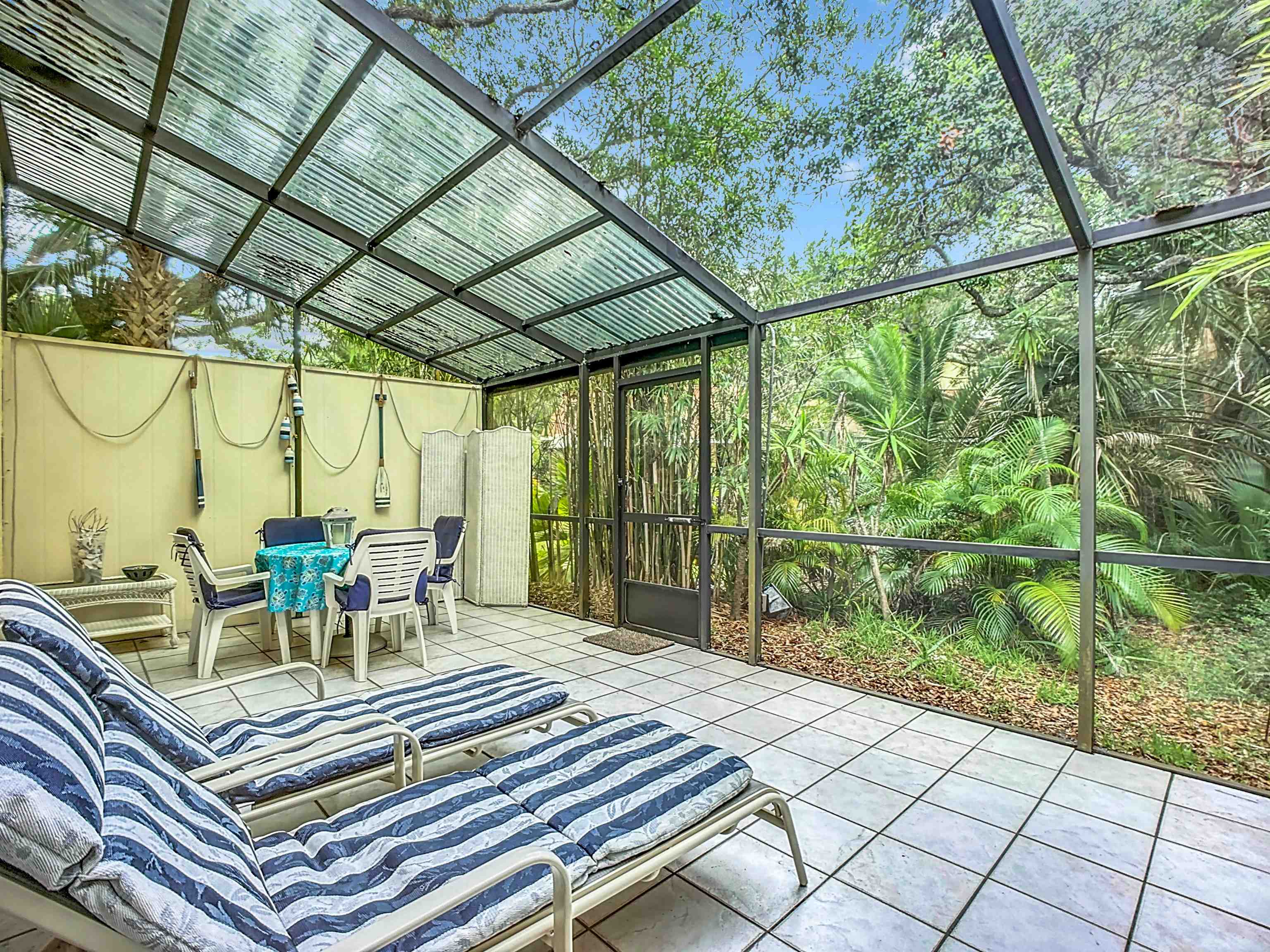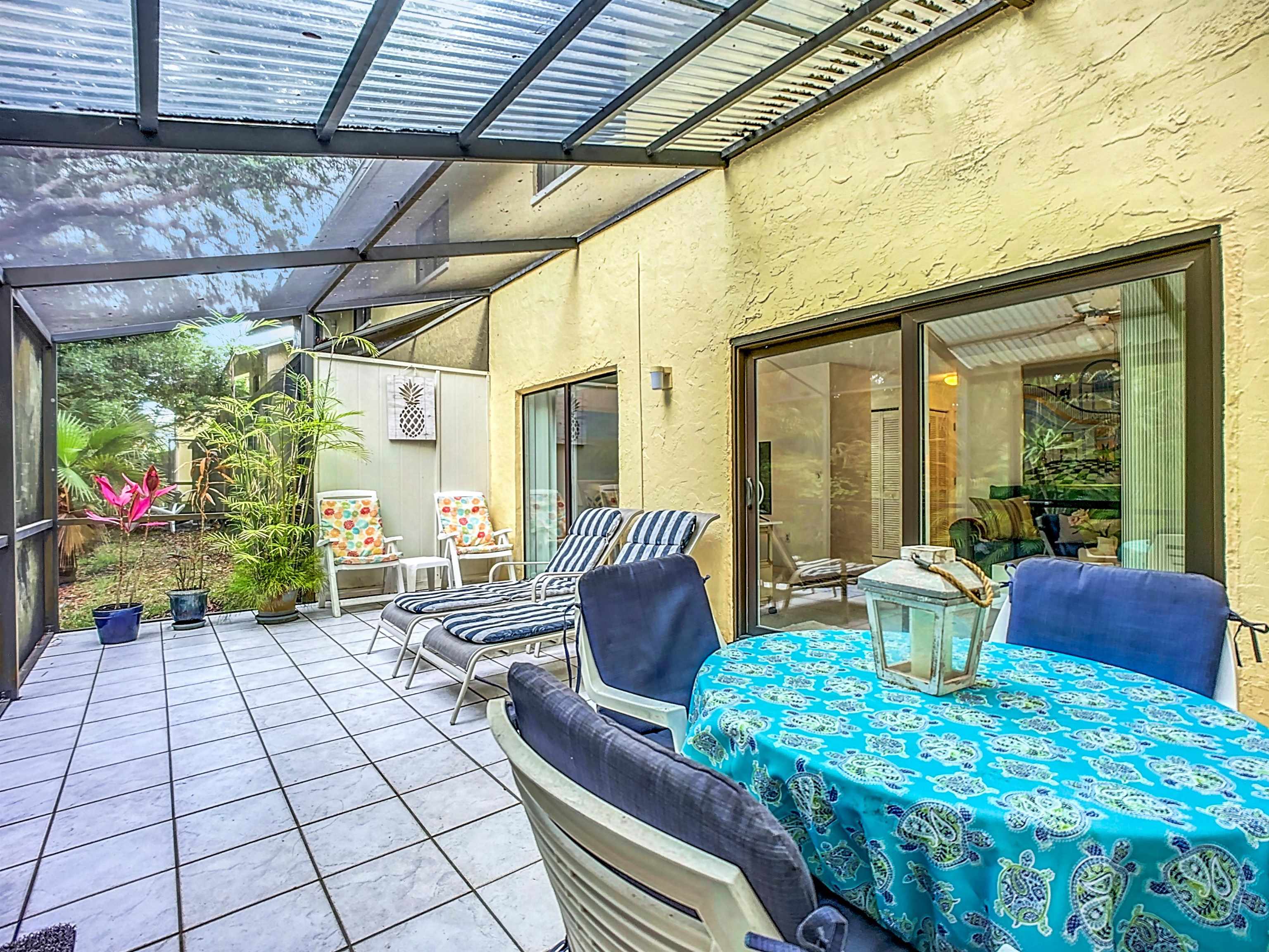 If you've been searching for a private unit that is situated among stately oaks but also a short stroll to the beach. . . look no further. This townhouse 2BR/2. 5BA is an end unit with huge, screened lanai, half covered, so you can enjoy rain or shine. Assigned parking space is right out your front door. So easy to unload groceries, suitcases, beach and fishing equipment. Right across from the community pool, which is heated in the winter months, but mature tropical landscaping makes it feel like you live alone amongst the trees and bamboo in your own private oasis. Private deeded beach access is nearby. Owned by one family since 1996 and only used by their friends and loved ones so it's in excellent shape. HVAC and all windows and sliding glass door replaced in the last few years. Truly ideal location for enjoying early sunrise mornings, long summer nights and everything in between. Separate laundry room featuring full size washer and dryer plus additional storage space. Walk or bike to grocery stores, coffee shops and restaurants, donut and waffle shops, souvenir shops and even the pier for summer concerts and Wednesday morning Farmers Market. This pet friendly complex allows owners to have 2 pets so even Fluffy can have fun beach days. Park your car and enjoy the sunshine and salt air for a healthy beach lifestyle. 3D Tour available to view at https: //nodalview. com/s/3RgxBf7419Ve5FBeL4NjpU