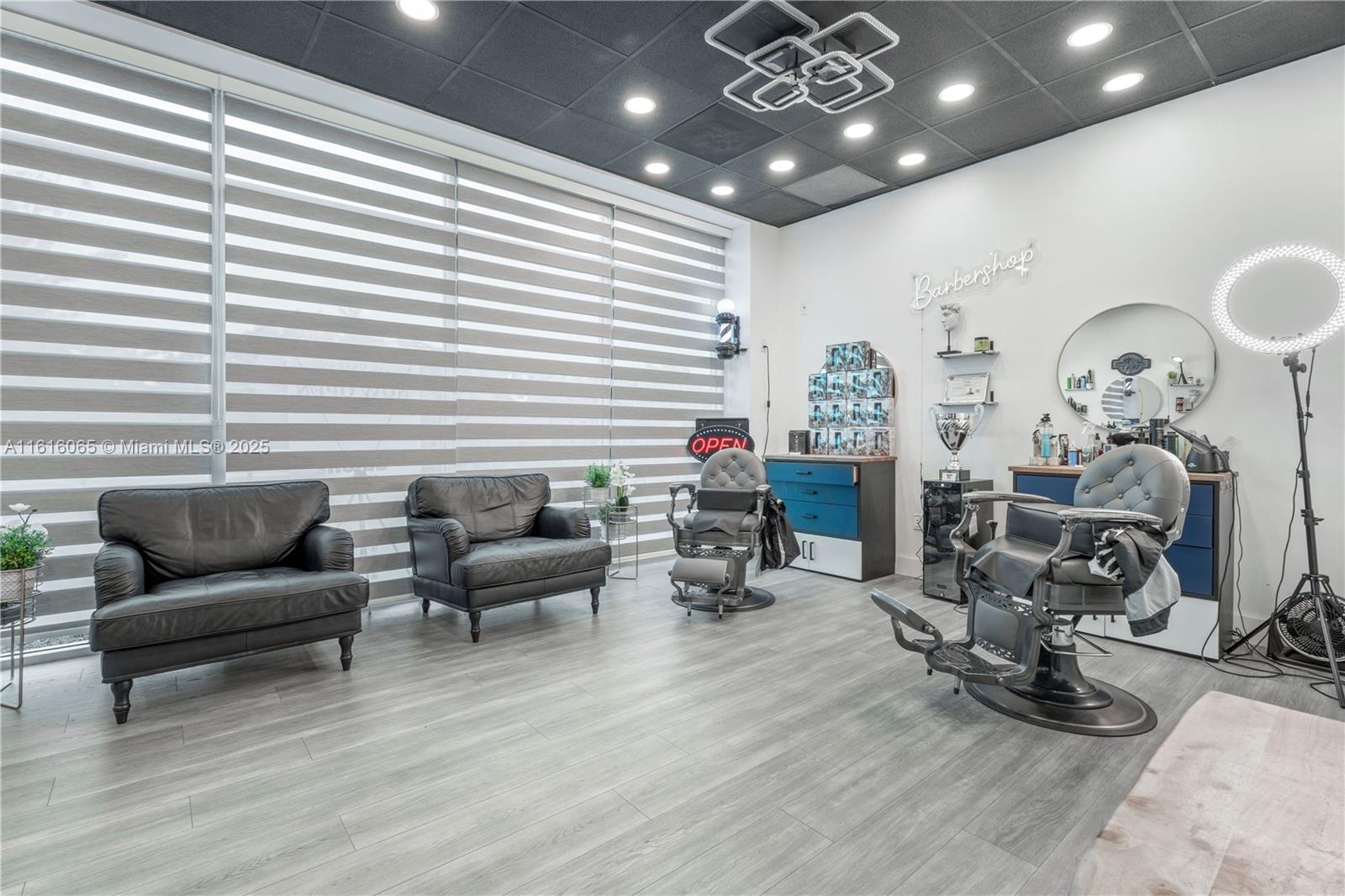 Exciting business opportunity! This spacious first-floor barbershop features 5 chairs, a welcoming waiting area, and a charming drink station. The building includes convenient parking, a lobby, and an open vending/eating area. Located in a prime spot near major highways, this is a fantastic chance to grow your business.