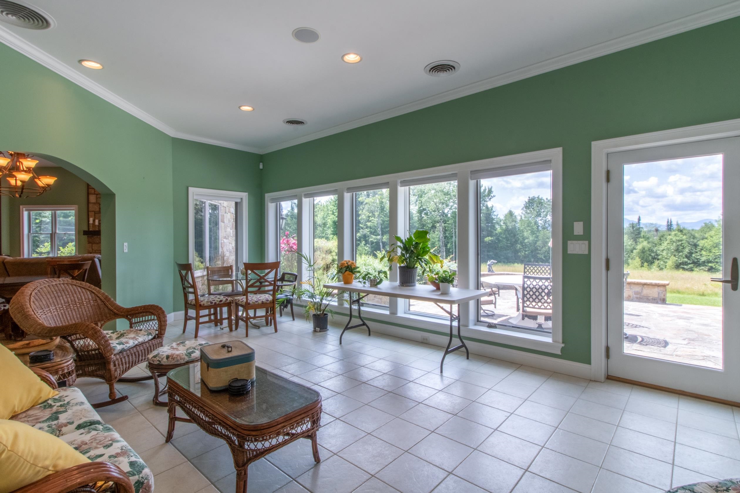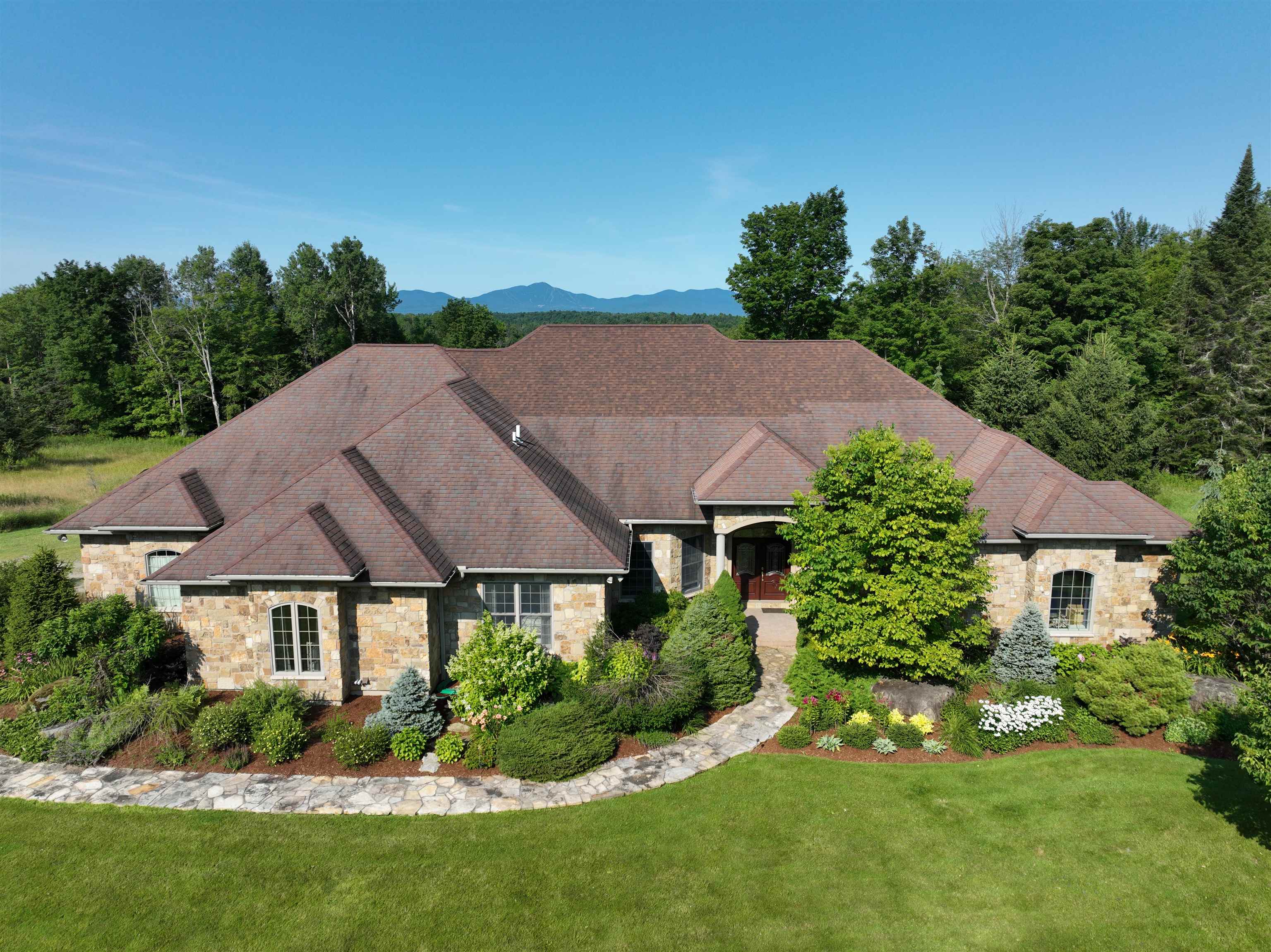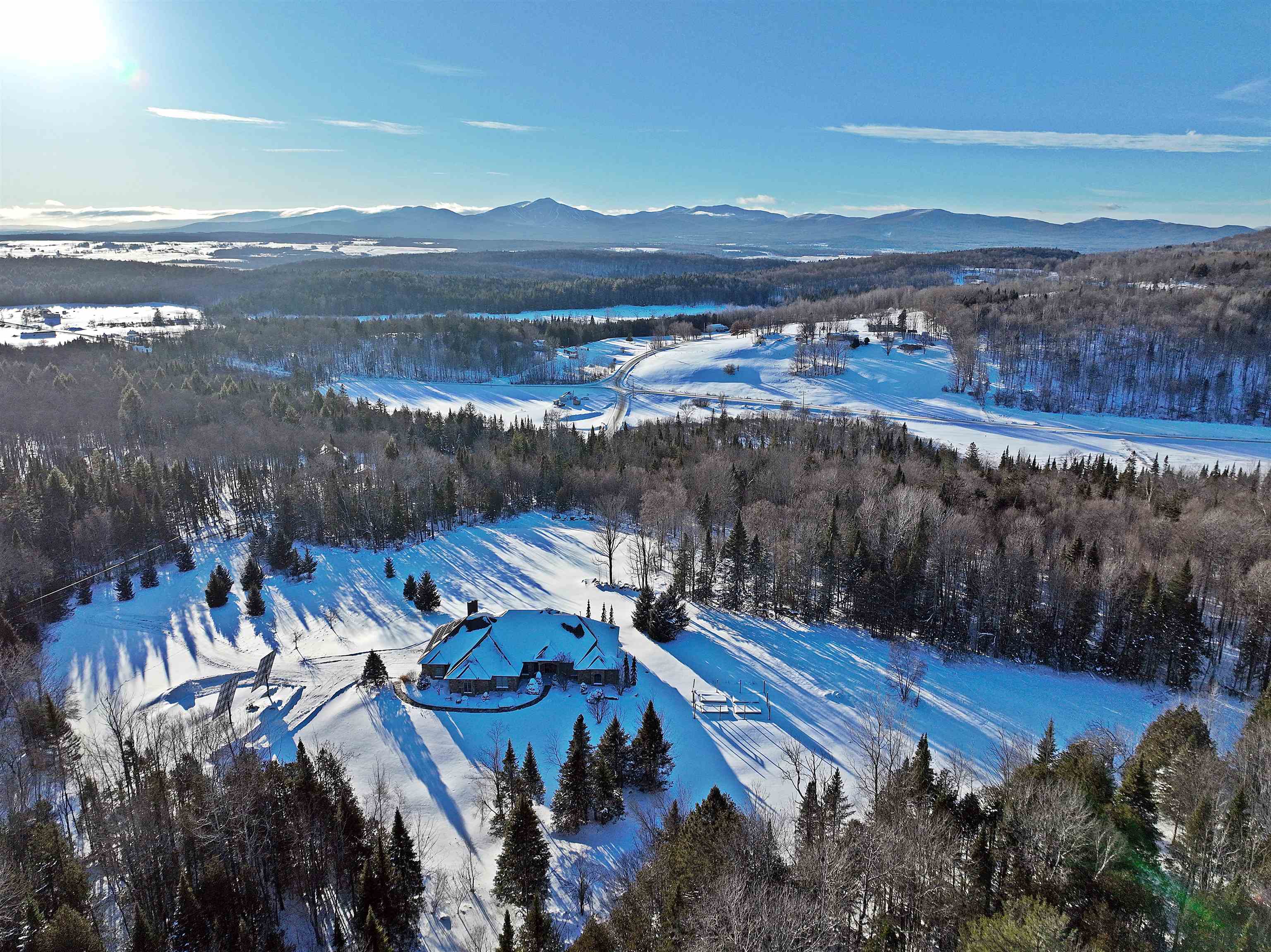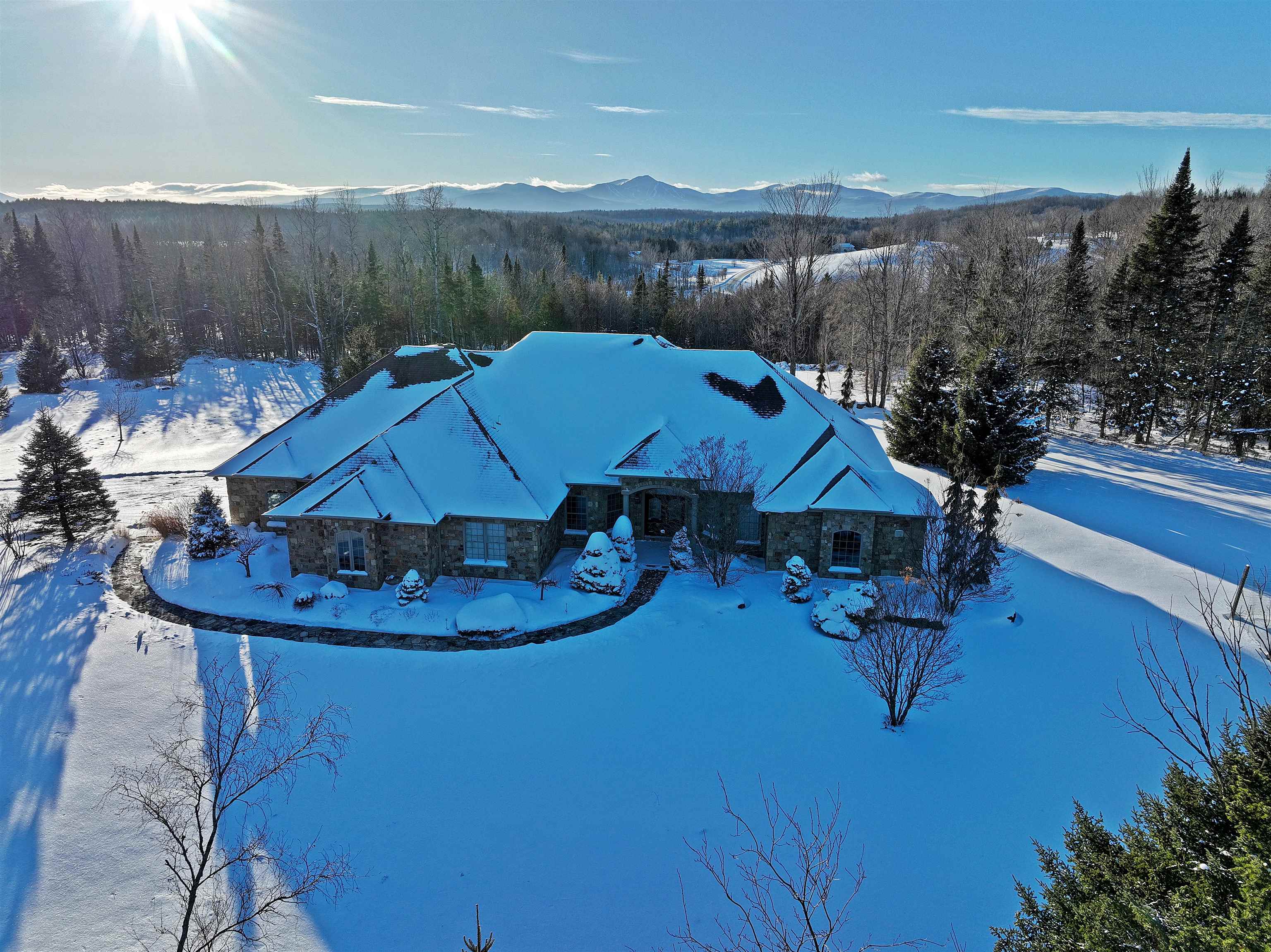 Set on 160+ acres with gorgeous views of Jay Peak and the surrounding mountains, this extraordinary 4, 000+ sq. ft. contemporary estate offers privacy, sophistication, and sustainable living in Vermont’s Northeast Kingdom. The striking natural stone exterior sets the tone for the elegance inside, where Australian cypress and slate floors, 10’ ceilings, and crystal chandeliers create timeless refinement. The gourmet kitchen is a chef’s dream with full-size Miele refrigerator and freezer, double wall ovens, and induction cooktop. Relax in the family room beside the wood-burning stone fireplace or enjoy year-round light in the sunroom with its floor-to-ceiling windows. The primary suite is a retreat of its own, featuring Brazilian cherry floors, spa-like marble bath, home office, and expansive walk-in closet. Guests enjoy a private wing with two bedrooms and Jack & Jill bath. Modern comforts include solar power with three Tesla Powerwall batteries, geothermal heating and cooling, and a heated walkway. Outdoors, a fenced organic garden, quartzite patio, and unforgettable sunsets make the most of the property’s natural beauty. With a conservation easement and forest management plan in place, this estate combines lasting privacy with responsible stewardship. Rarely does a home unite luxury, sustainability, and scale at this level—an unparalleled Vermont retreat.