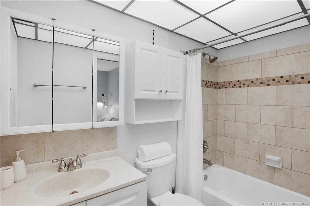 COMMUN??Y IS ?X?MP? FROM THE MIL?S?ONE ENGINEERING STUDY and associated assessments. Tucked away in this quiet community of only 3 buildings and within walking distance to a grocery store, several restaurants and shops, drug store, public library, a few minutes from historic downtown Stuart, great beaches and a public golf course. Enjoy the peaceful courtyard view from your living room, primary bedroom and balcony. This freshly painted 2 bedroom 2 bath second floor unit has been updated with wood grain plank tile flooring throughout (no carpet) and new bathroom tile and vanities. Washer and dryer hook up in the unit. Master bedroom with en suite bath also opens to the screened and covered balcony. Guest bedroom with pocket door into guest bath. Furniture included! No age restrictions. Trucks allowed. No pets except service animals with proper paperwork. Association is financially sound. Roof replaced in 2019 with no assessments. No rentals for the first two years of ownership.