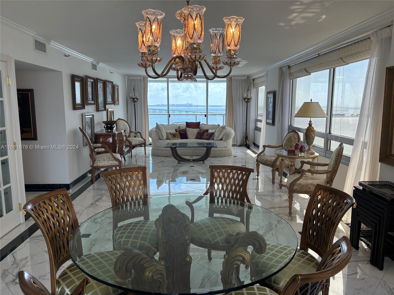 Elegance, quality, comfort and 240-degree views, describe this property. Watch the sun rise over Biscayne Bay from your master bedroom, balcony or living room, then watch as the sun sets over the city from your kitchen, balcony or dining room. View Brickell Avenue and all its splendor. Imported marble floors throughout. Modern kitchen with imported MiaCucina cabinetry, pantry and quartz counter tops. Bathrooms totally updated with imported porcelain floors and walls. Gold plated fixtures. Master Bath with jetted shower/tub. Master bedroom with two closets. Enter through the private elevator stop into the elegant foyer into the natural light brightness of the living area showcasing the splendor of the beautiful marble floors and window curtains. Unit comes with 2 contiguous parking spaces.