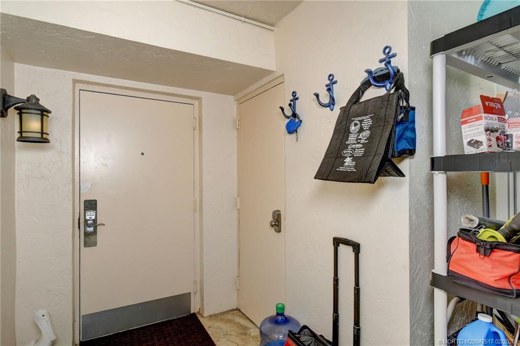 Monthly and weekly rates available. Wide water views from this beautiful renovated furnished condo boasting a fantastic floor plan (one of the larger units), is attractively decorated w/an updated & modern coastal look. Many windows for natural light & huge L-shaped balcony boasting pocket sliding doors for indoor/outdoor living. Kitchen has white countertops, newer SS appliances, and a terrific bar/butler's pantry w/wine refrigerator. Main bedroom opens to the balcony, has a large step-in shower & dual sinks. Other features include impact glass windows & doors, natural stone floors, plantation shutters, a barn door, extra storage & covered parking. Well appointed and beautifully furnished.