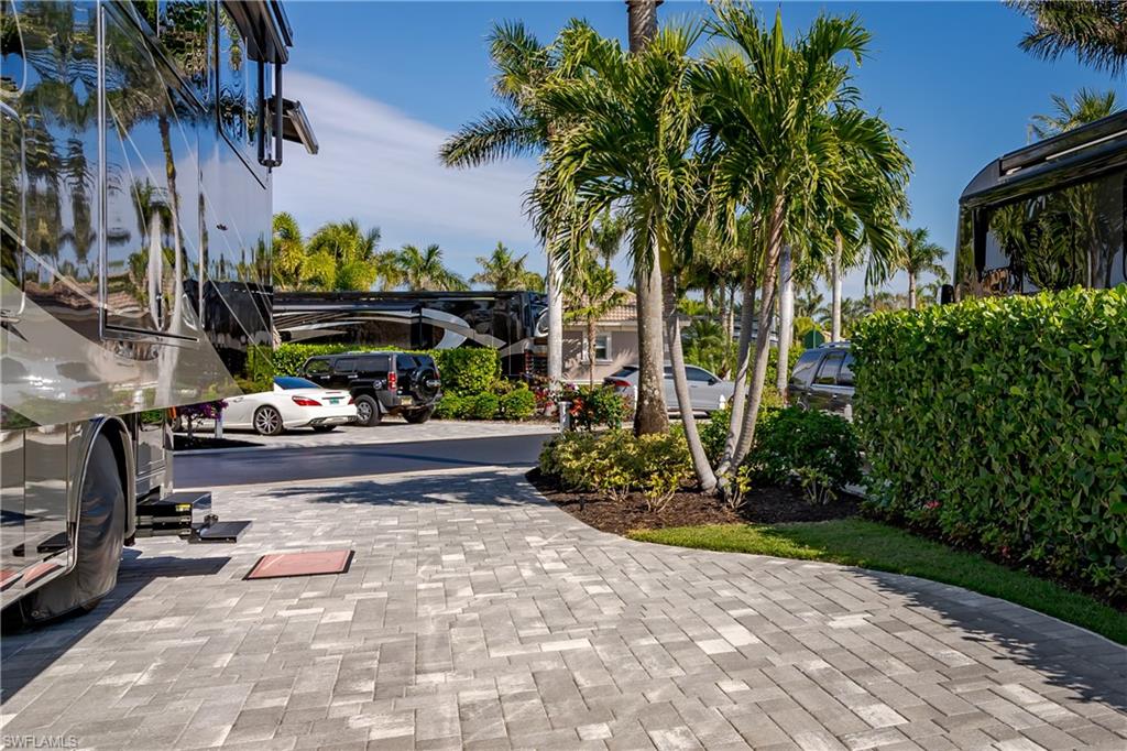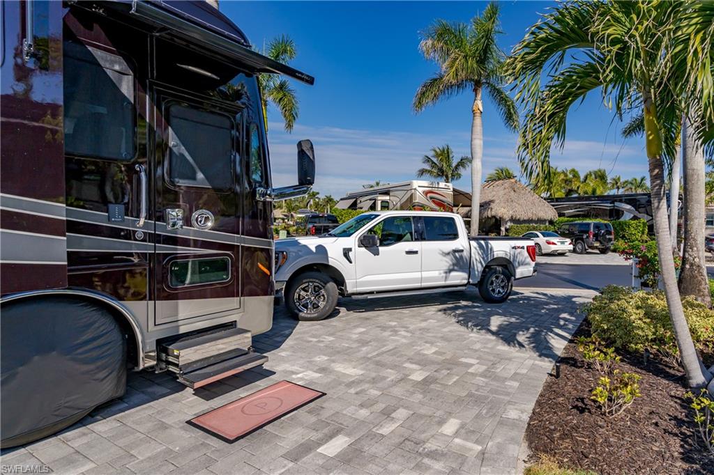 Lot 41 - You drive through the gates after admiring the beautiful flower and Royal Palm lined entry and the two fountains you passed have already welcomed you. As the gates swing open you are now facing an even more magnificent fountain in front of the clubhouse. You now turn and head to your slice of paradise, once again you cannot believe how beautiful this road is lined with Royal Palms. . . As you back into your beautiful fully paved lot, you admire the beautiful formal landscaping on your property. Wait, you even have a beautiful grass area for your pet to roll in the grass. This property has it all. Now that you are settled in, you head back to your oversized tiki (did I say oversized? should of said massive!), you decide to sit and relax with the beverage of your choice as you watch your favorite show. You plan to have dinner outside at your dining table tonight. You marvel at the privacy you have with the amazing privacy wall and contemplate potentially adding a water feature. But for now, you are so happy to be in paradise and enjoying your turn-key property. What shall you do tomorrow?? Perhaps take one of the community kayaks and launch from the boat ramp and go through Rookery Bay. Maybe you will buy a boat, how convenient would that be to launch and go to the beach or boat up to a restaurant for lunch or dinner from within the resort? Perhaps it is time to learn how to play pickleball and play on one of the three courts? Probably best to build up those muscles first in the fitness center and then sit in the sauna. So many options! Welcome to the magic that is Naples Motorcoach Resort. Naples Motorcoach Resort is a Class A only resort and boasts a beautiful infinity pool, hot spa, exercise room, men's and ladies saunas as well as a catering kitchen that owners can use. There are also two satellite pools with a hot spa, their own rest rooms and a laundry room. We can't forget your furry best friend, the resort even has a dog park! Special note to investors, looking for a place to invest or reinvest as a 1031 exchange? Look no further, own this piece of paradise and put it into the management run rental program. The rental program administration advertises, schedules renters, collects payment including applicable taxes/fees and sends you your portion. These deeded lots are mortgage eligible and great for a quick close.
