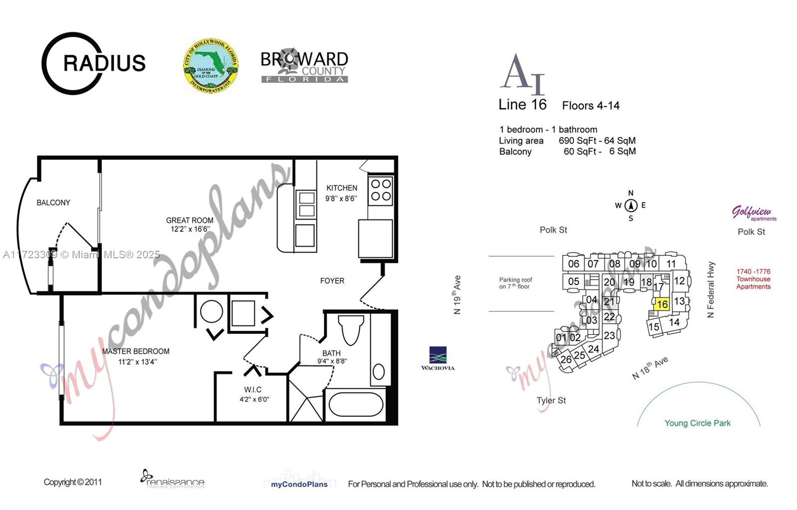 Perfect investment! 1 Bed / 1 Bath, washer and dryer in unit. 1 covered assigned parking. High speed Internet and Cable included in HOA's. High end building featuring Valet, 24 hs security, fitness room, inside swimming pool, outdoor rooftop swimming pool, club house. On Downtown Hollywood: Restaurants, sports bars, clubs and grocery stores and minutes to the beach. Right on Young Circle.