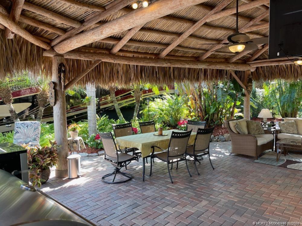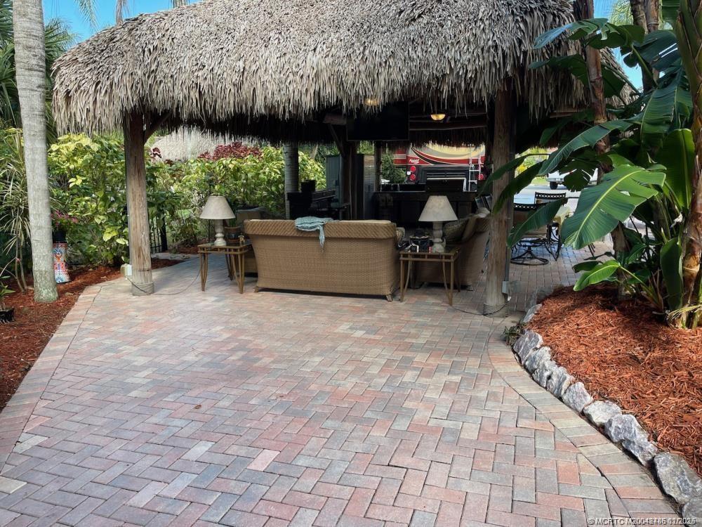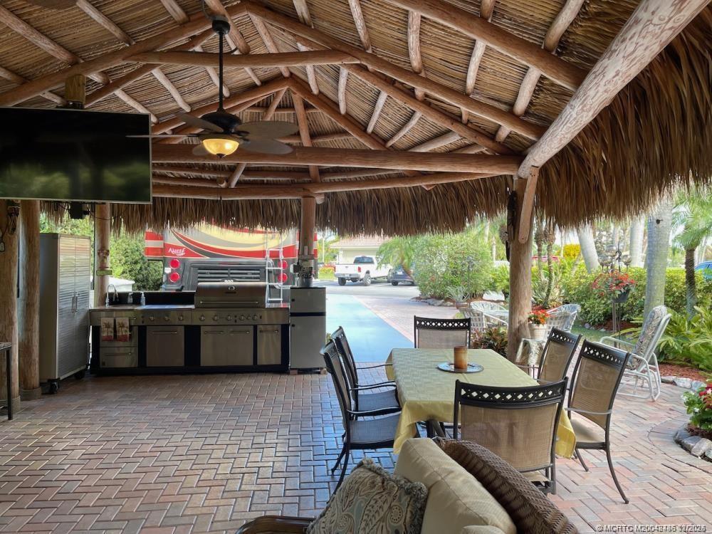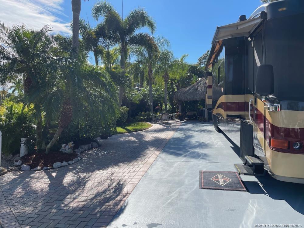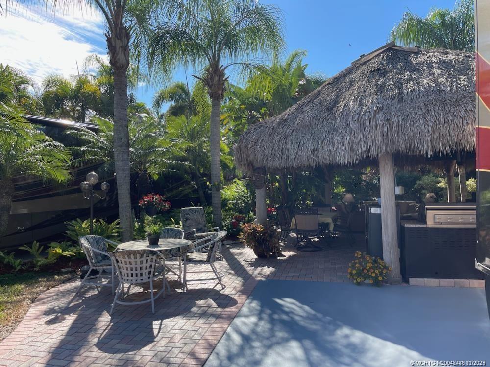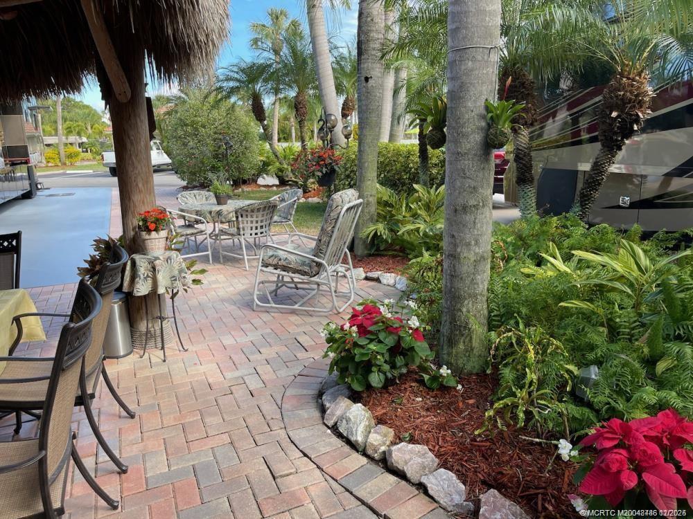 This huge 3, 831 ?q. ft. l?t is p?rfe?tly lo?ated just acros? from th? satellite pool/spa, bathhouse, laundry and guest parking. Backing onto a peaceful preserve with mature, lush tropical landscaping, this property offers the ideal blend of convenience, privacy, and natural beauty. At the heart of the lot is an expansive tiki hut with a brand-new roof thatch installed in January 2024. Inside, you'll find two ceiling fans to keep you cool, upgraded seating and dining furniture for comfort, a large TV, and a well-equipped outdoor kitchen complete with a bar and plenty of storage. What truly sets this property apart is its generous size. Beyond the tiki, there’s plenty of room for outdoor dining, with space for a table and chairs to enjoy meals al fresco. The extended patio behind the tiki is the perfect spot to add a water feature, creating a serene retreat. The expansive side yard provides additional room for entertaining. This lot has a warm, welcoming “home away from home” feel.