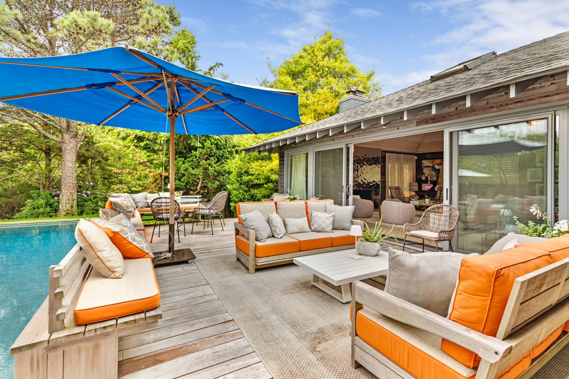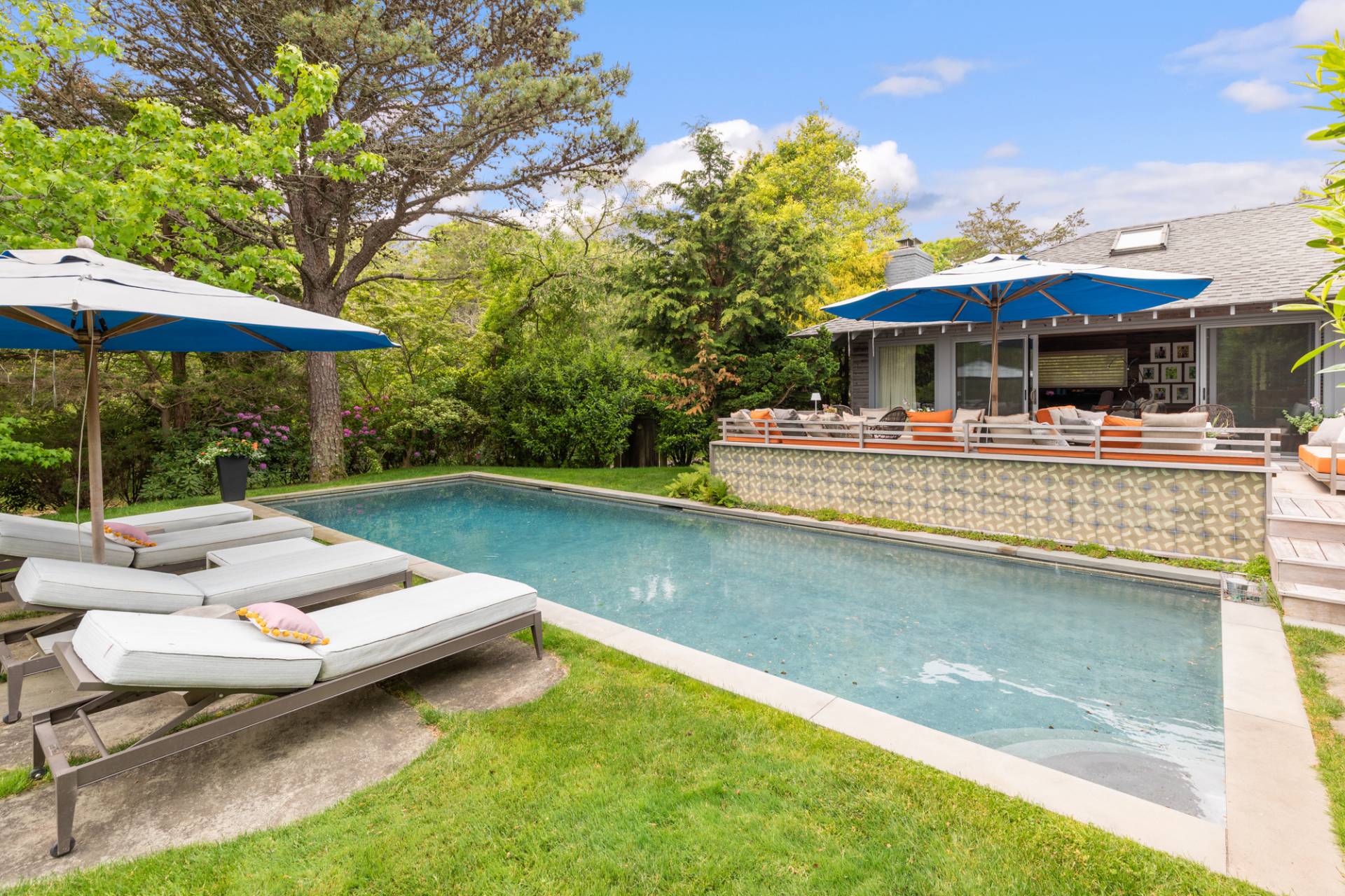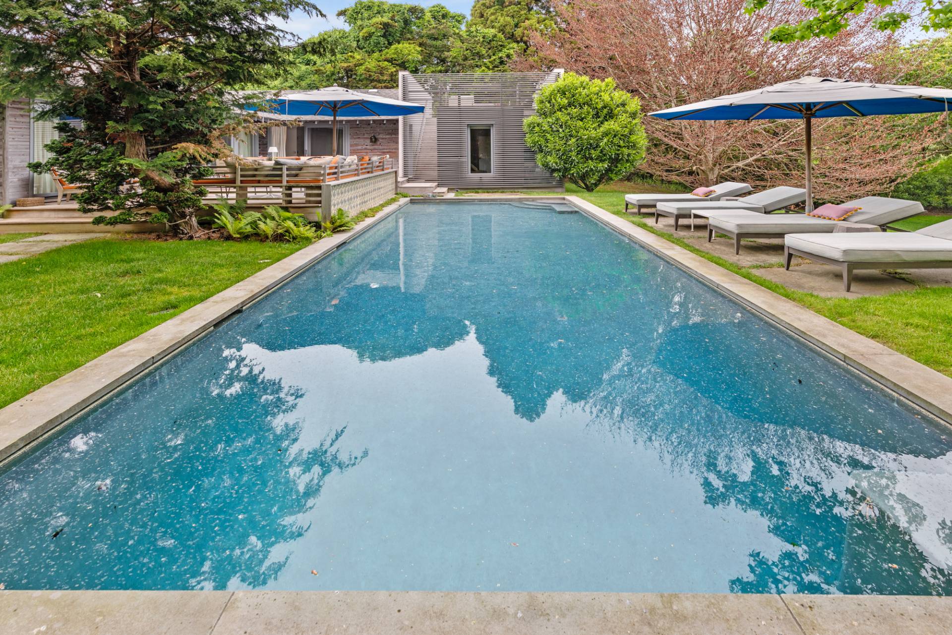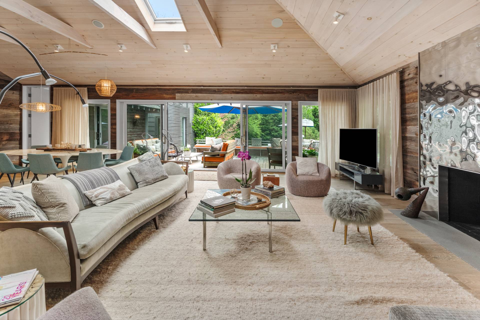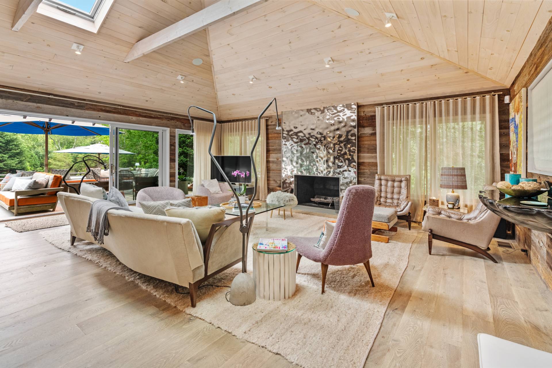 Rental Registration #: 23-137 Newly renovated four bedroom 5. 5 bath oceanfront modern beach house, is a chic mid-century summer oasis. Built and conceived by Architectural Digest 100 Designer Joe Nahem, this zen- like mid century modern home features a state of the art kitchen, Sonos throughout, heated salt-water unite pool, extensive decking, two primary suites; one with soaking tub and separate shower and the other with steam shower. The main living area features wood clad cathedral ceilings and antique barn wood walls. Chic design and furnishings are a combination of both new and mid- century vintage furniture and lighting. Outdoor amenities include a beautiful outdoor patio with several living and dining areas, a private roof deck, and a park-like shy acre with a path leading directly to wide sandy beaches. Also, a new full gym with bath and steam. Privately located on a flag lot, this modern beach house offers the utmost in understated luxury and elegance. .