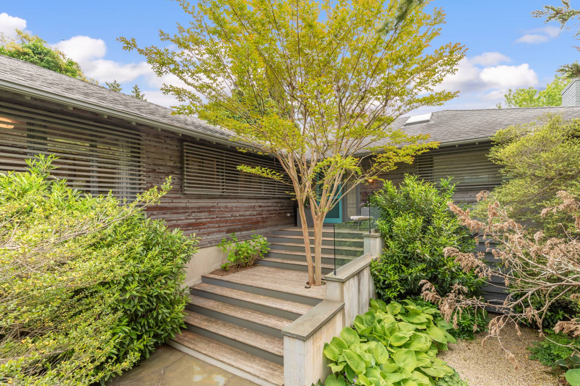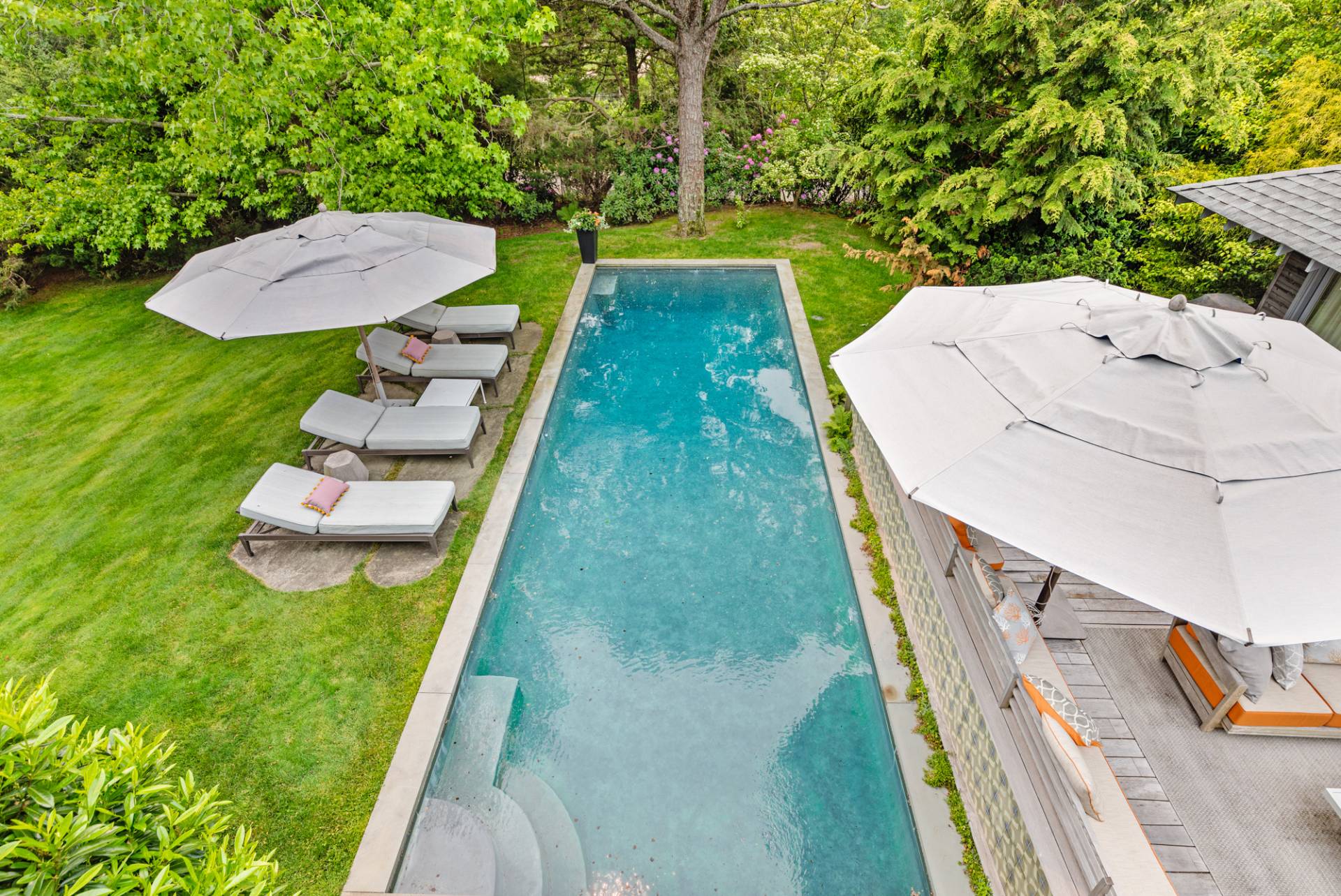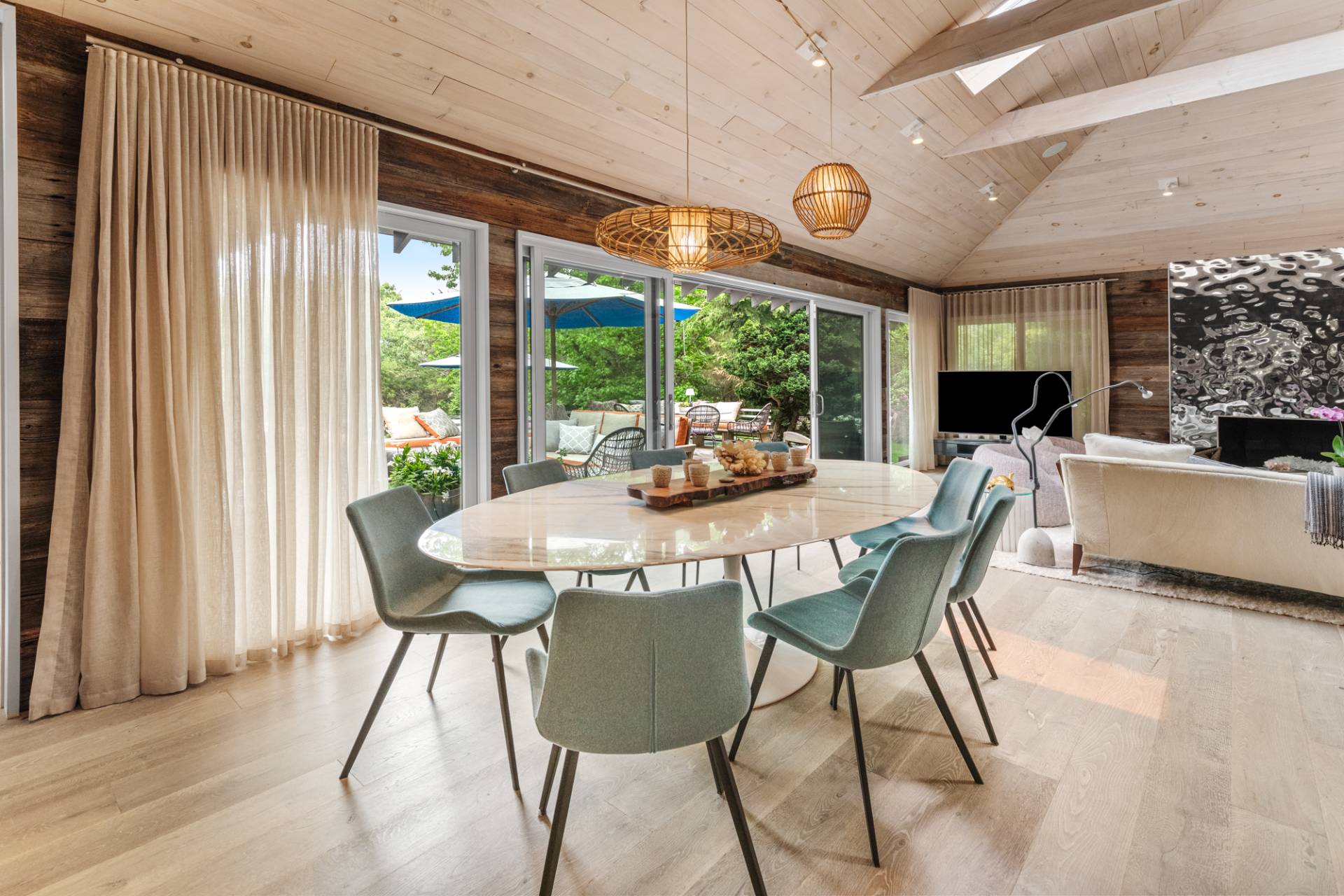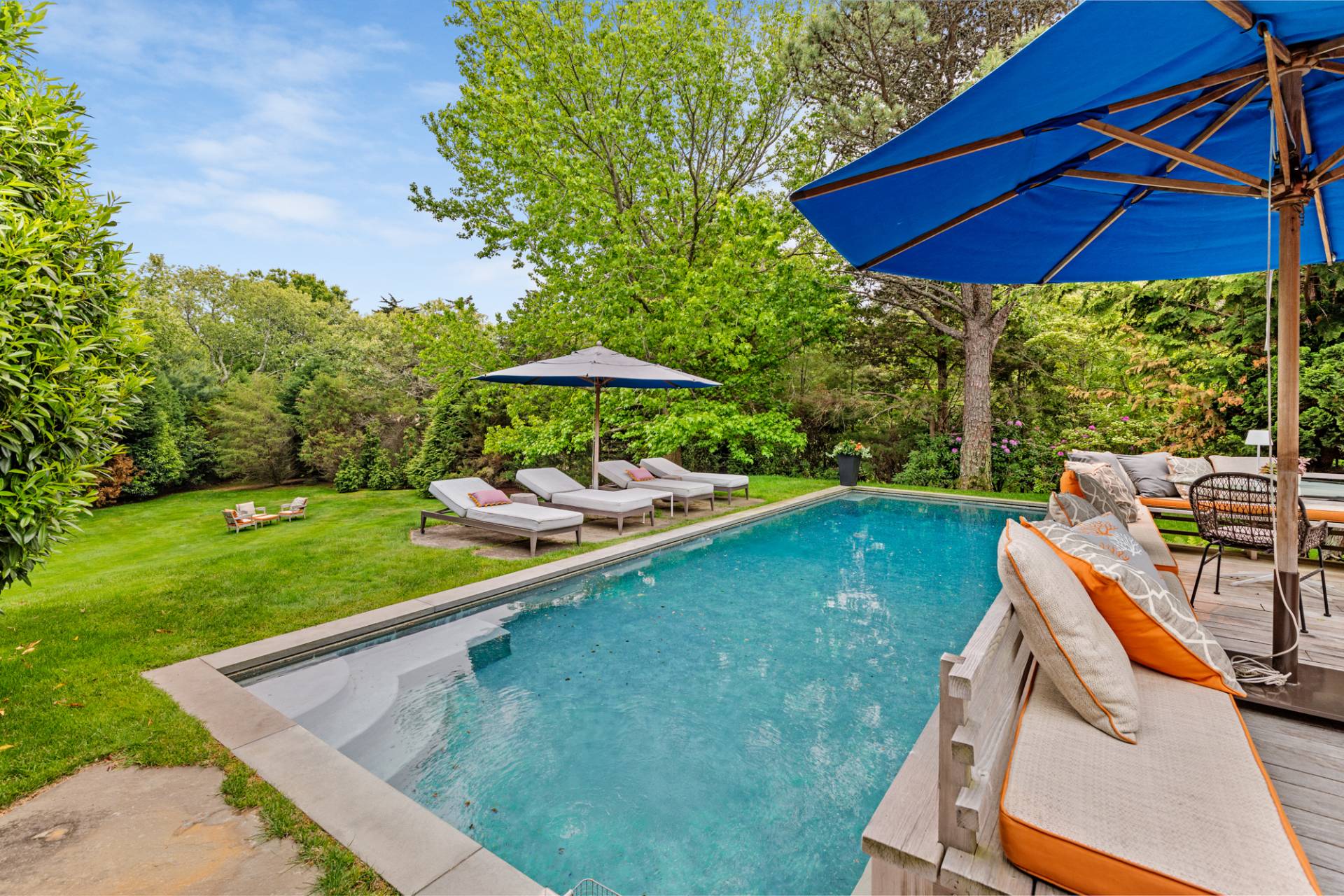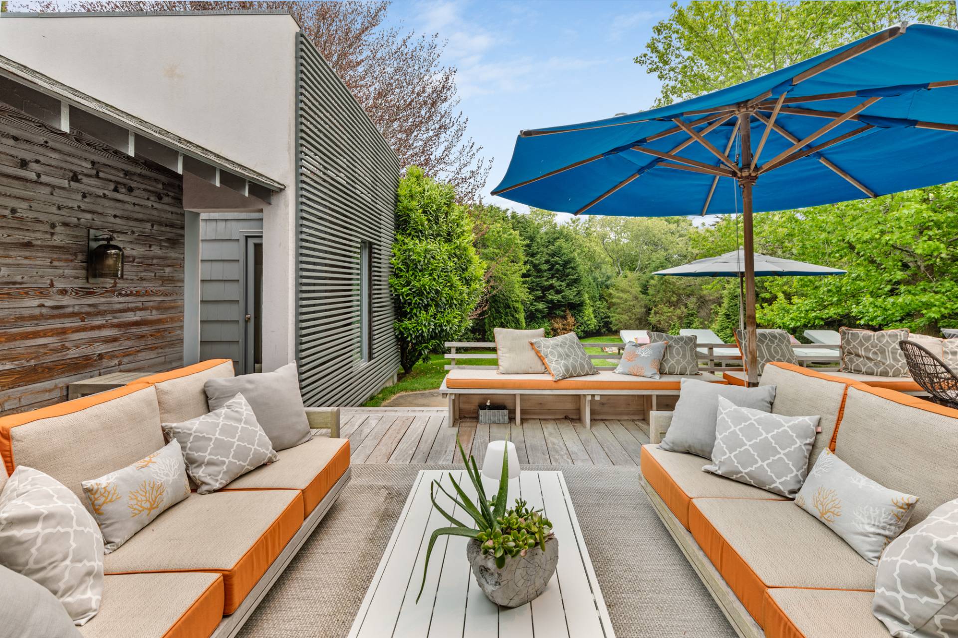 Rental Registration #: 23-137 Newly renovated four bedroom 5. 5 bath oceanfront modern beach house, is a chic mid-century summer oasis. Built and conceived by Architectural Digest 100 Designer Joe Nahem, this zen- like mid century modern home features a state of the art kitchen, Sonos throughout, heated salt-water unite pool, extensive decking, two primary suites; one with soaking tub and separate shower and the other with steam shower. The main living area features wood clad cathedral ceilings and antique barn wood walls. Chic design and furnishings are a combination of both new and mid- century vintage furniture and lighting. Outdoor amenities include a beautiful outdoor patio with several living and dining areas, a private roof deck, and a park-like shy acre with a path leading directly to wide sandy beaches. Also, a new full gym with bath and steam. Privately located on a flag lot, this modern beach house offers the utmost in understated luxury and elegance. .