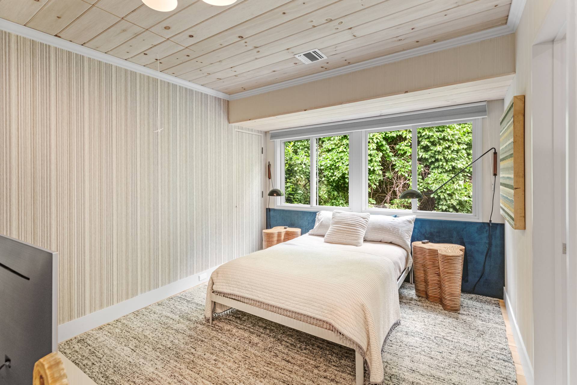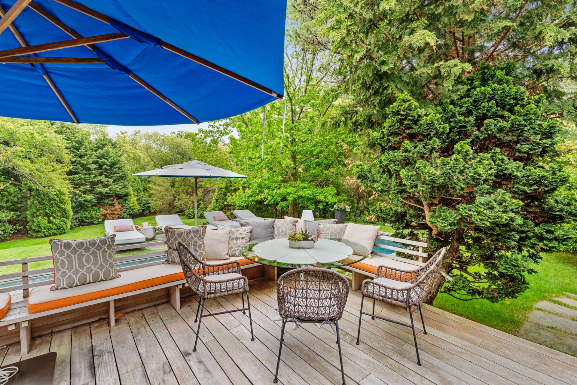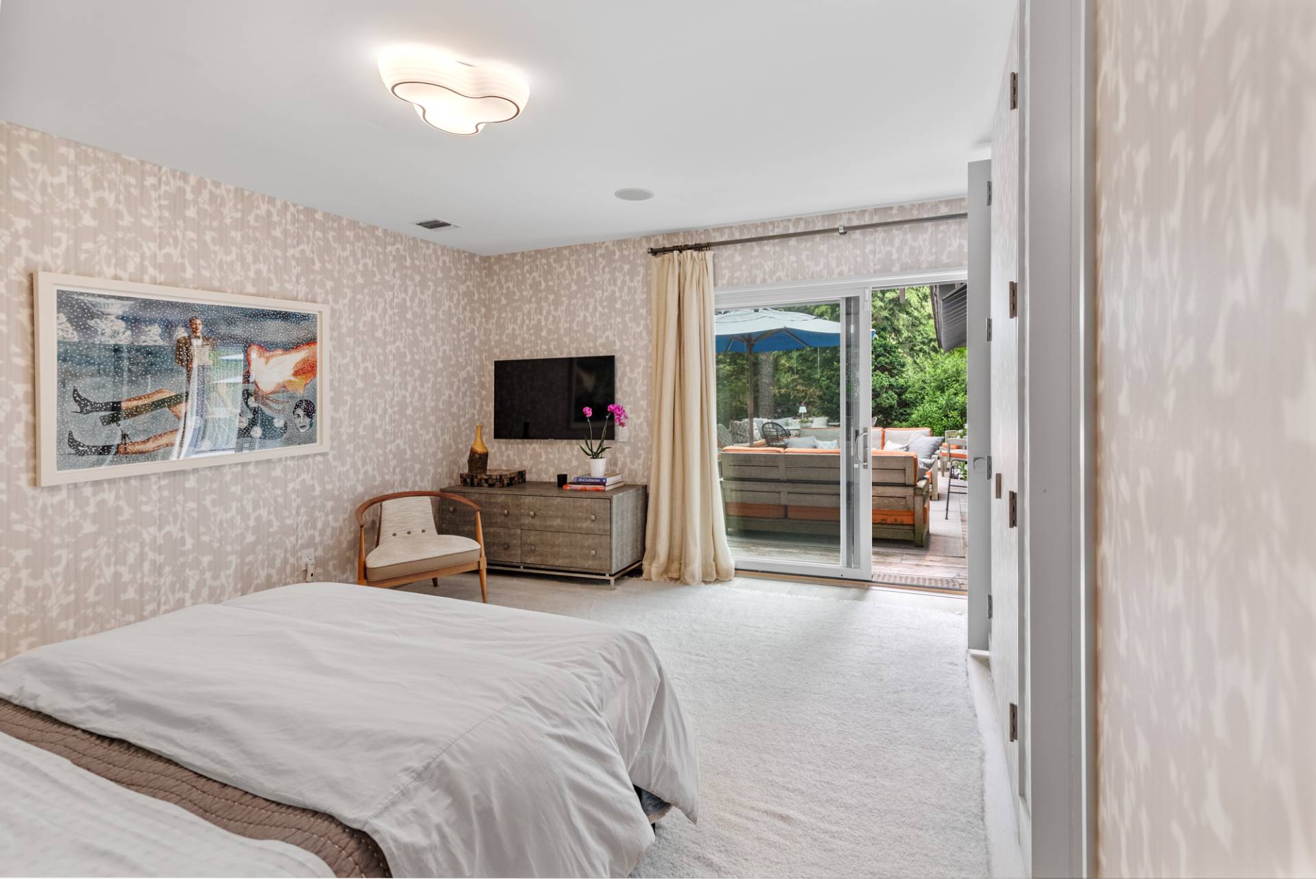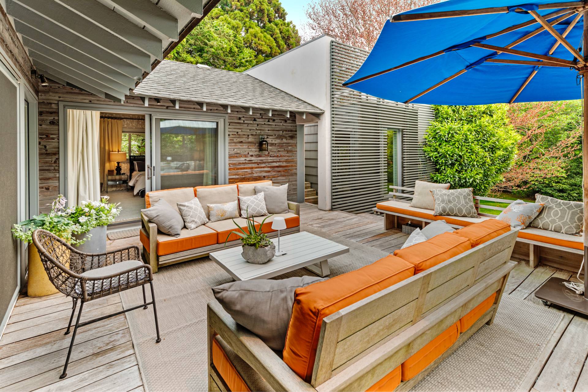 Rental Registration #: 23-137 Newly renovated four bedroom 5. 5 bath oceanfront modern beach house, is a chic mid-century summer oasis. Built and conceived by Architectural Digest 100 Designer Joe Nahem, this zen- like mid century modern home features a state of the art kitchen, Sonos throughout, heated salt-water unite pool, extensive decking, two primary suites; one with soaking tub and separate shower and the other with steam shower. The main living area features wood clad cathedral ceilings and antique barn wood walls. Chic design and furnishings are a combination of both new and mid- century vintage furniture and lighting. Outdoor amenities include a beautiful outdoor patio with several living and dining areas, a private roof deck, and a park-like shy acre with a path leading directly to wide sandy beaches. Also, a new full gym with bath and steam. Privately located on a flag lot, this modern beach house offers the utmost in understated luxury and elegance. .