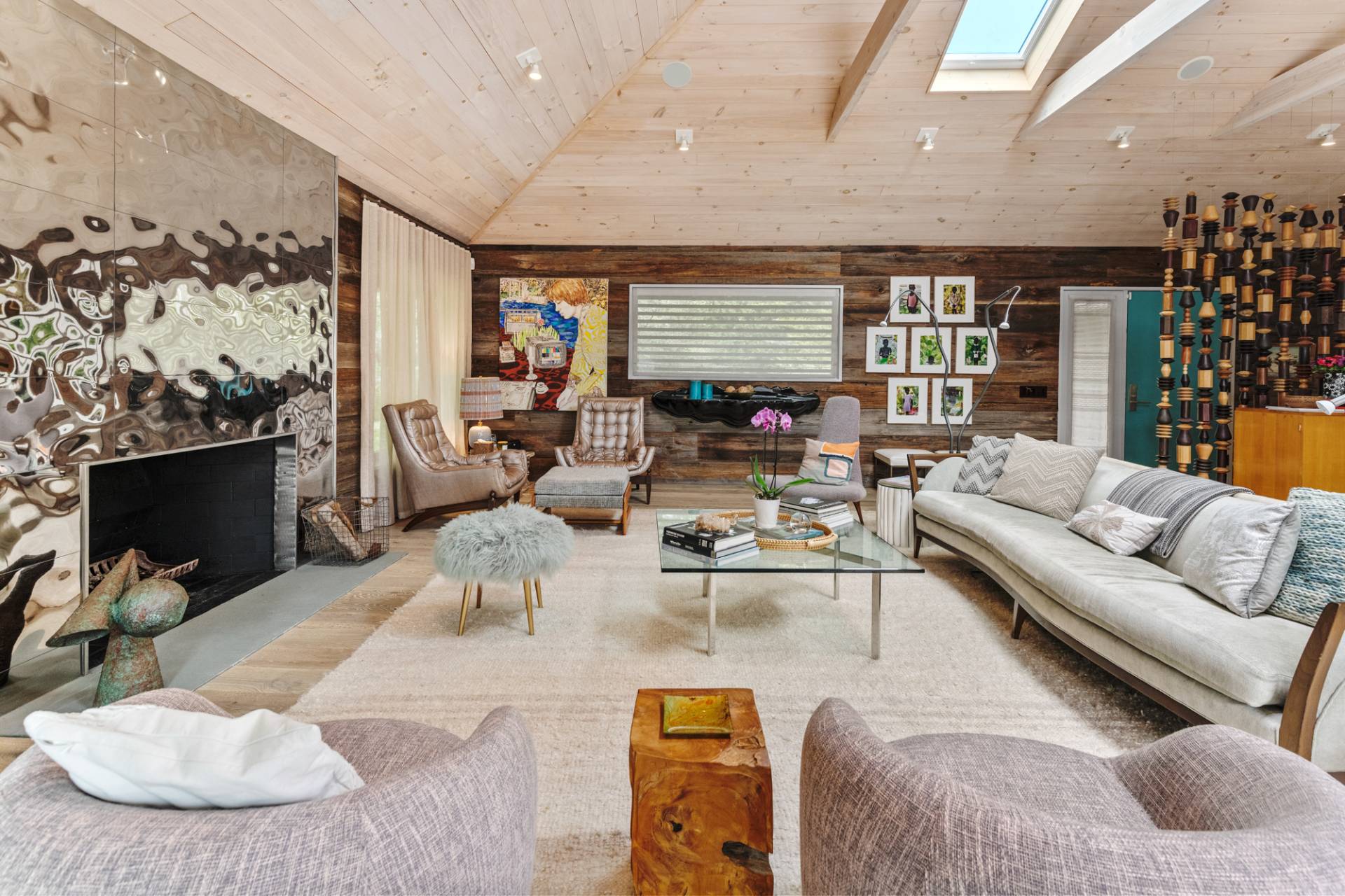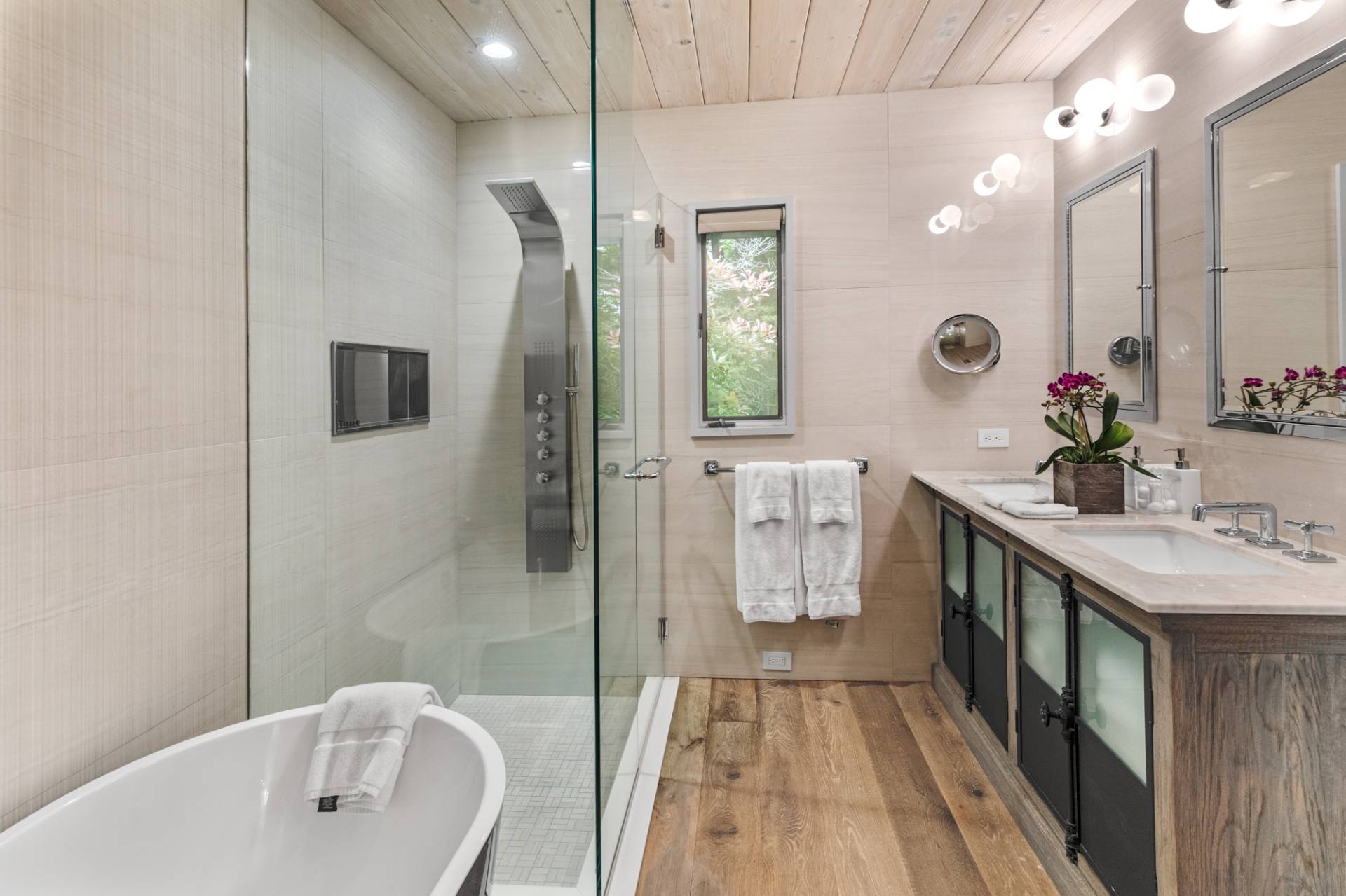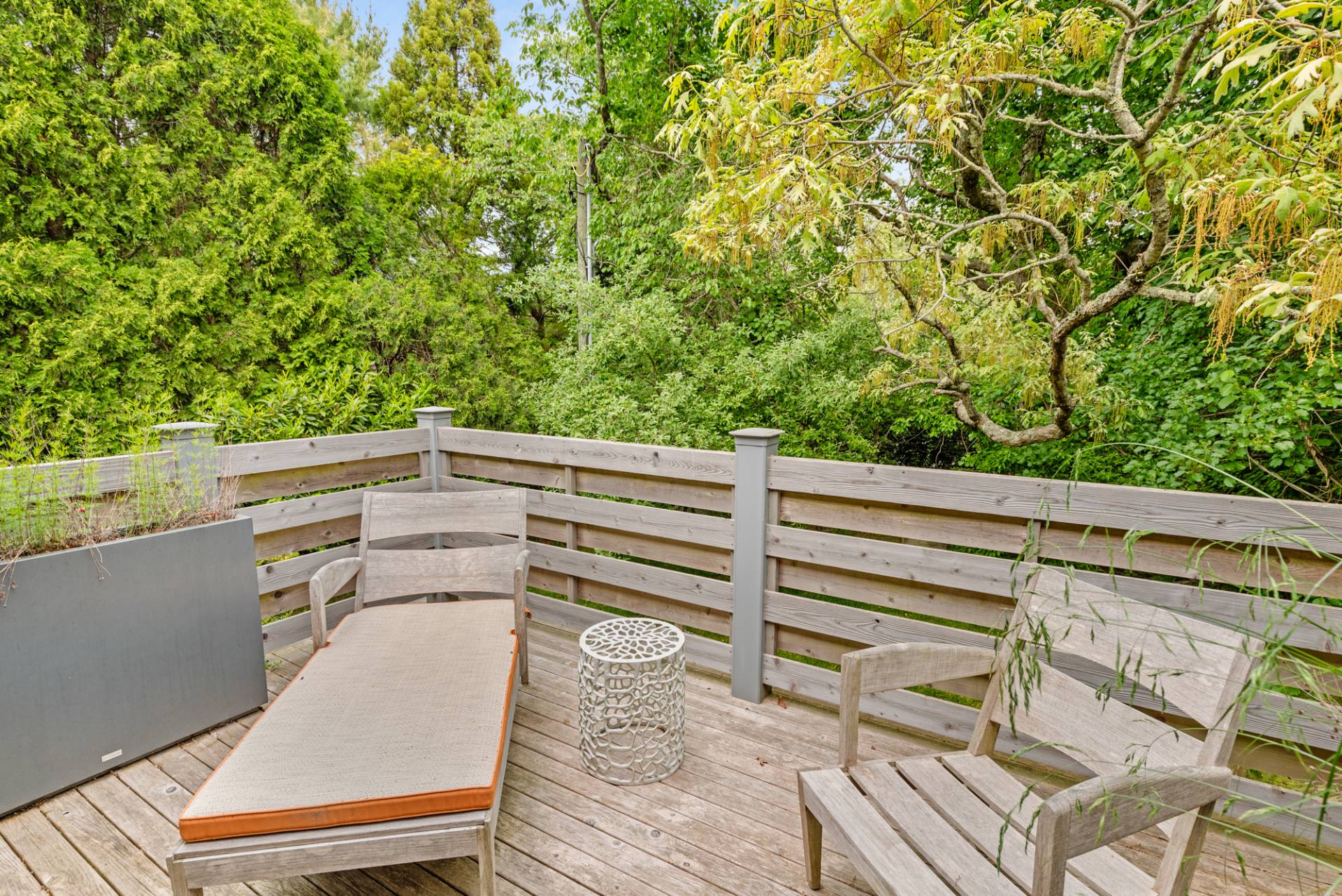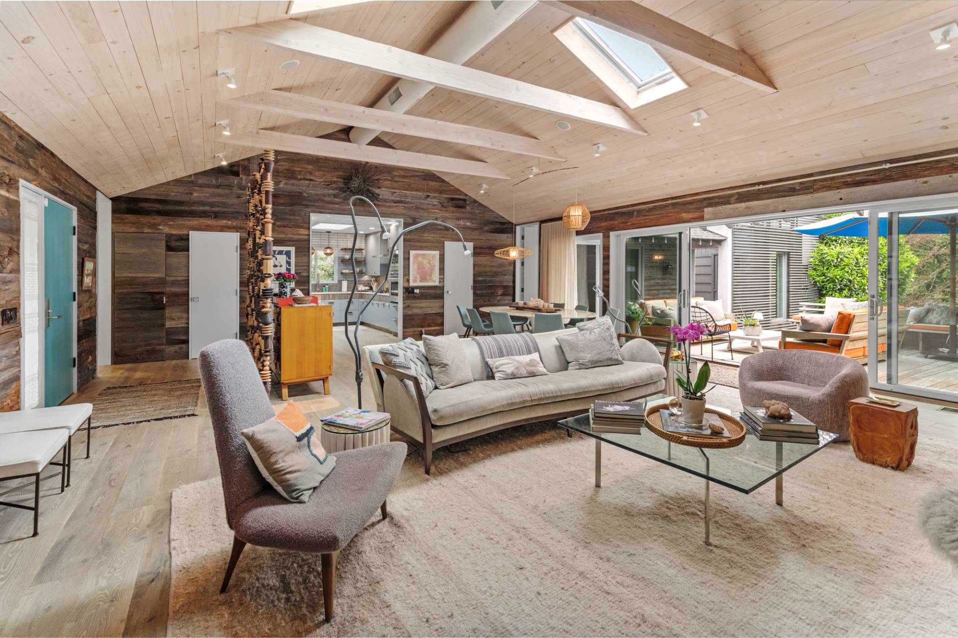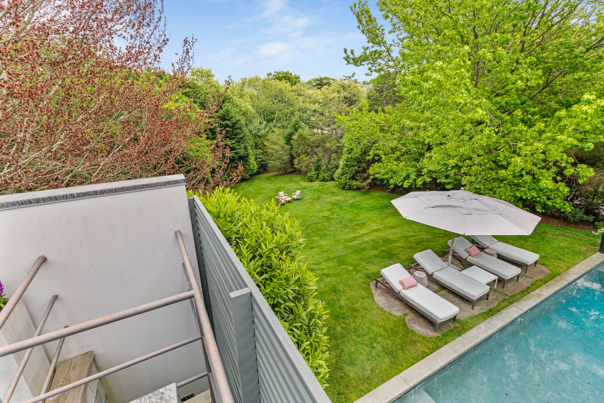 Rental Registration #: 23-137 Newly renovated four bedroom 5. 5 bath oceanfront modern beach house, is a chic mid-century summer oasis. Built and conceived by Architectural Digest 100 Designer Joe Nahem, this zen- like mid century modern home features a state of the art kitchen, Sonos throughout, heated salt-water unite pool, extensive decking, two primary suites; one with soaking tub and separate shower and the other with steam shower. The main living area features wood clad cathedral ceilings and antique barn wood walls. Chic design and furnishings are a combination of both new and mid- century vintage furniture and lighting. Outdoor amenities include a beautiful outdoor patio with several living and dining areas, a private roof deck, and a park-like shy acre with a path leading directly to wide sandy beaches. Also, a new full gym with bath and steam. Privately located on a flag lot, this modern beach house offers the utmost in understated luxury and elegance. .