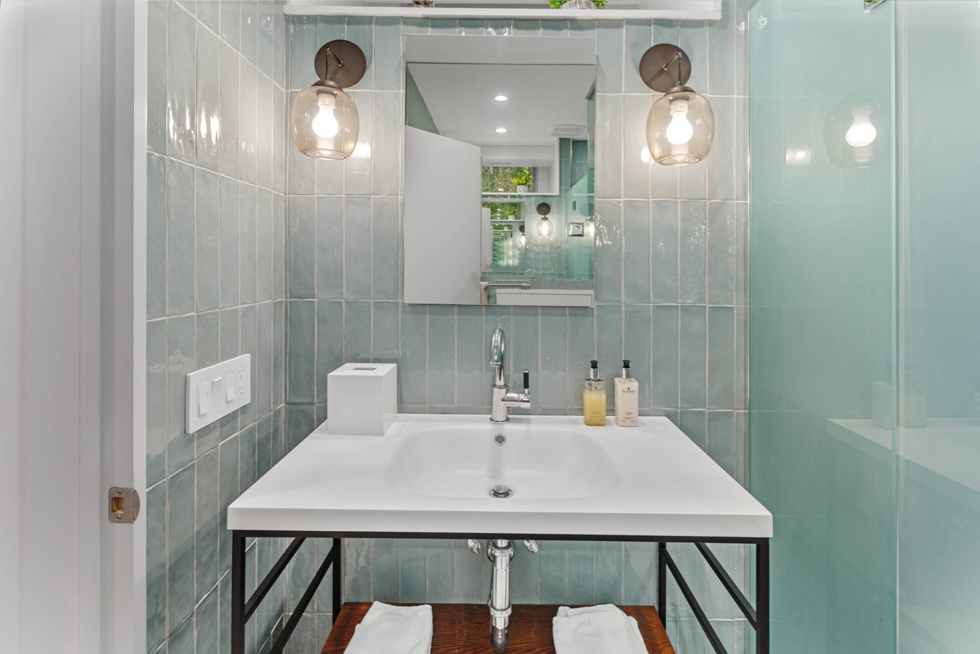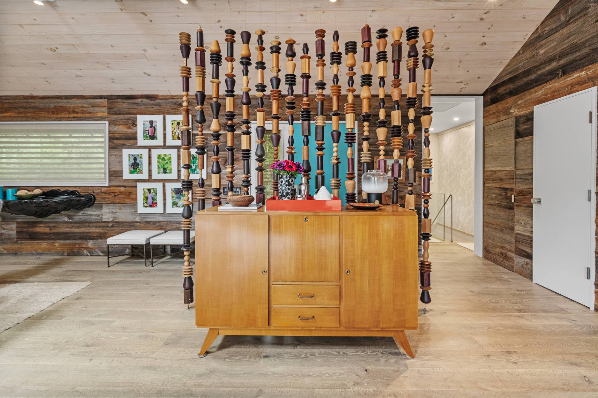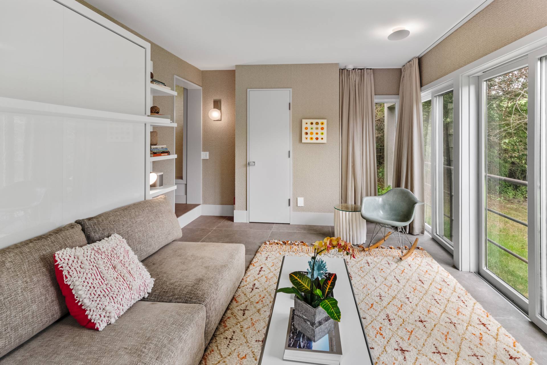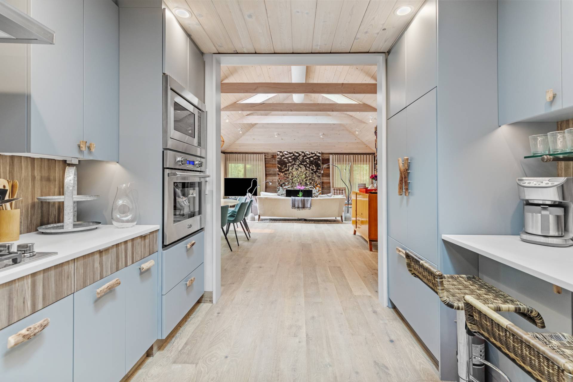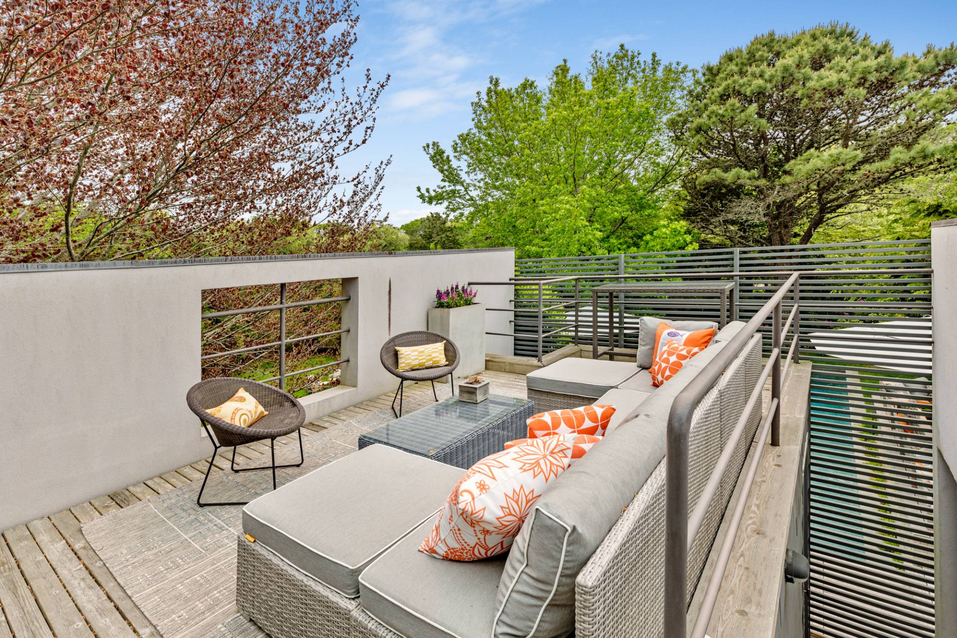 Rental Registration #: 23-137 Newly renovated four bedroom 5. 5 bath oceanfront modern beach house, is a chic mid-century summer oasis. Built and conceived by Architectural Digest 100 Designer Joe Nahem, this zen- like mid century modern home features a state of the art kitchen, Sonos throughout, heated salt-water unite pool, extensive decking, two primary suites; one with soaking tub and separate shower and the other with steam shower. The main living area features wood clad cathedral ceilings and antique barn wood walls. Chic design and furnishings are a combination of both new and mid- century vintage furniture and lighting. Outdoor amenities include a beautiful outdoor patio with several living and dining areas, a private roof deck, and a park-like shy acre with a path leading directly to wide sandy beaches. Also, a new full gym with bath and steam. Privately located on a flag lot, this modern beach house offers the utmost in understated luxury and elegance. .