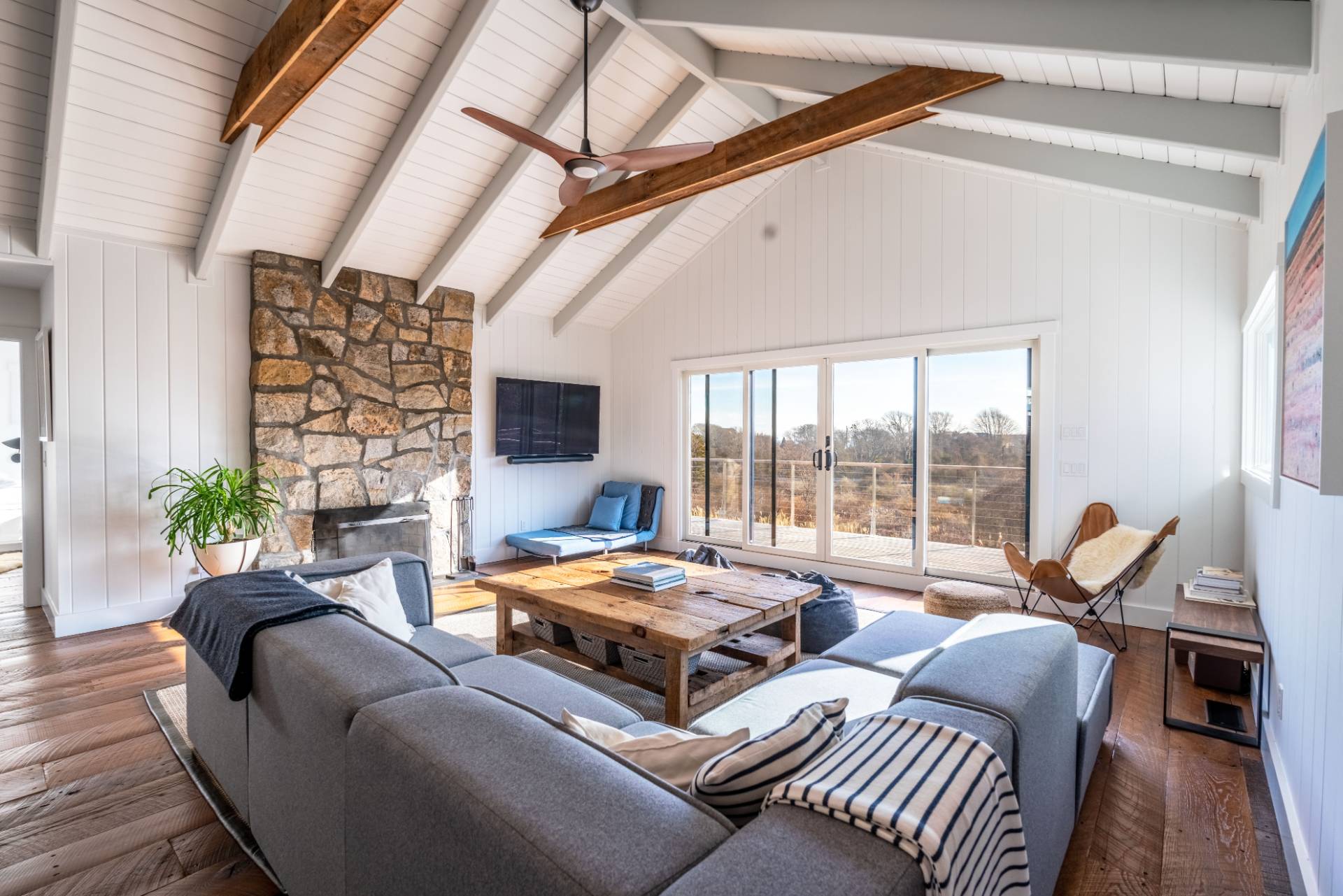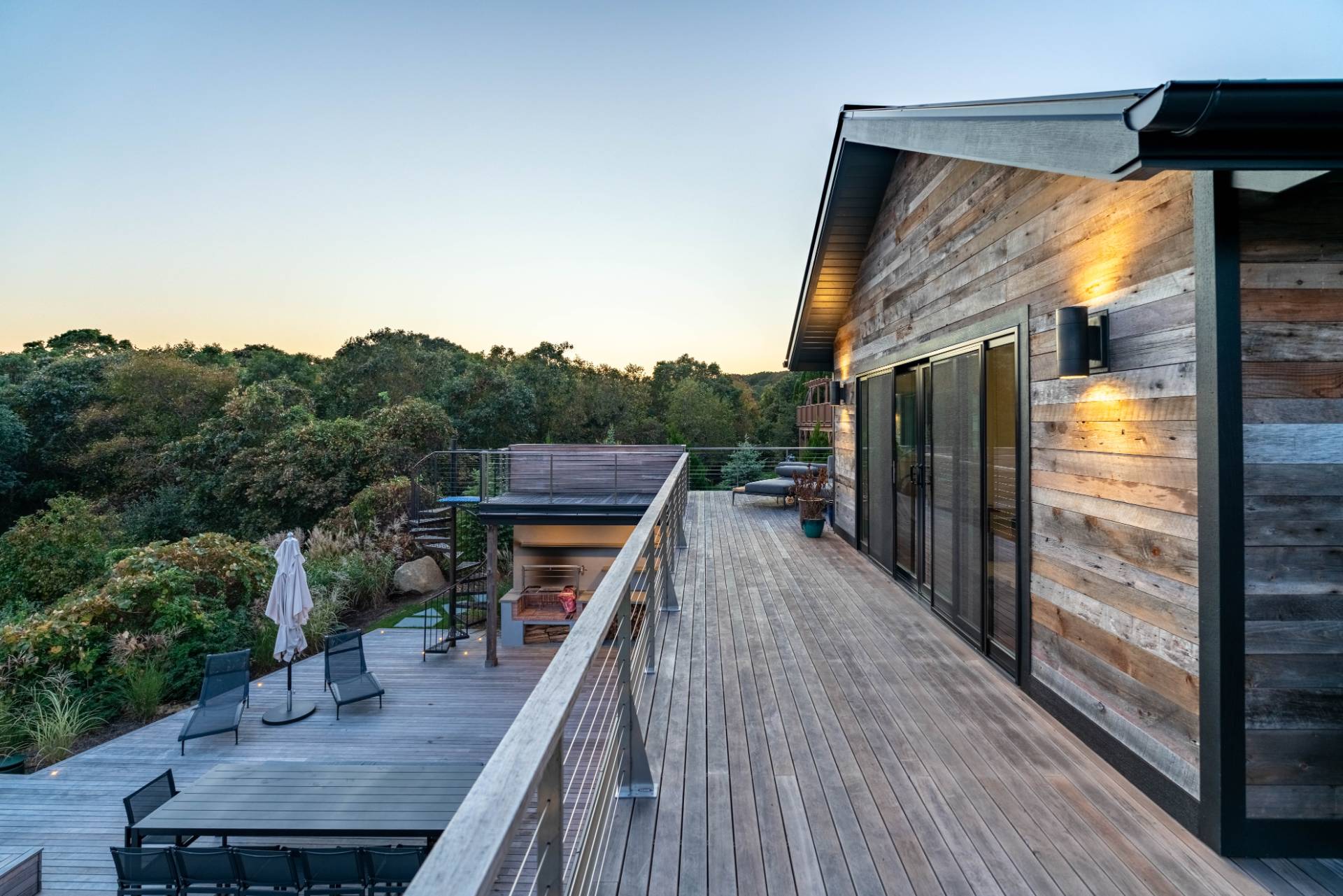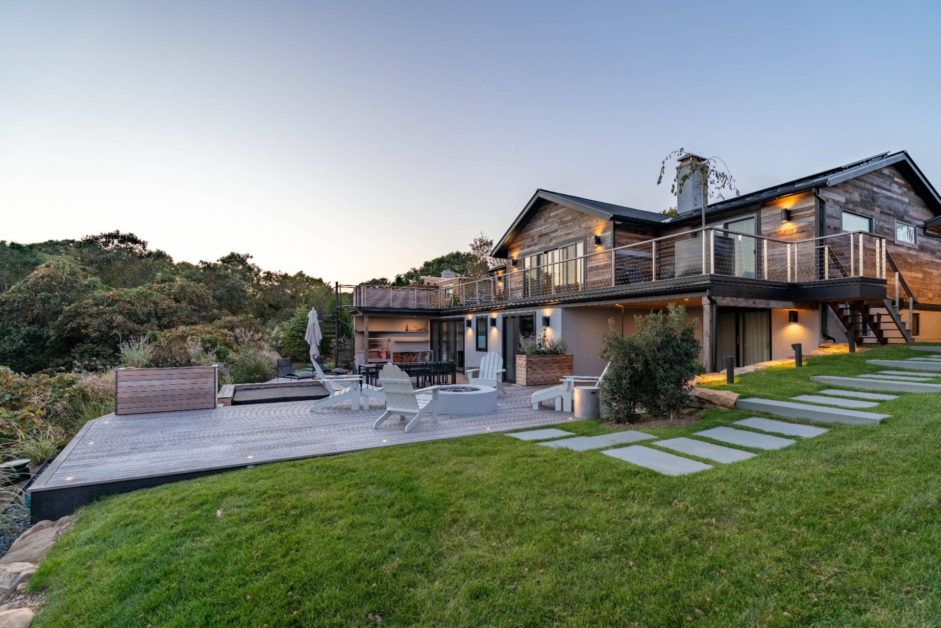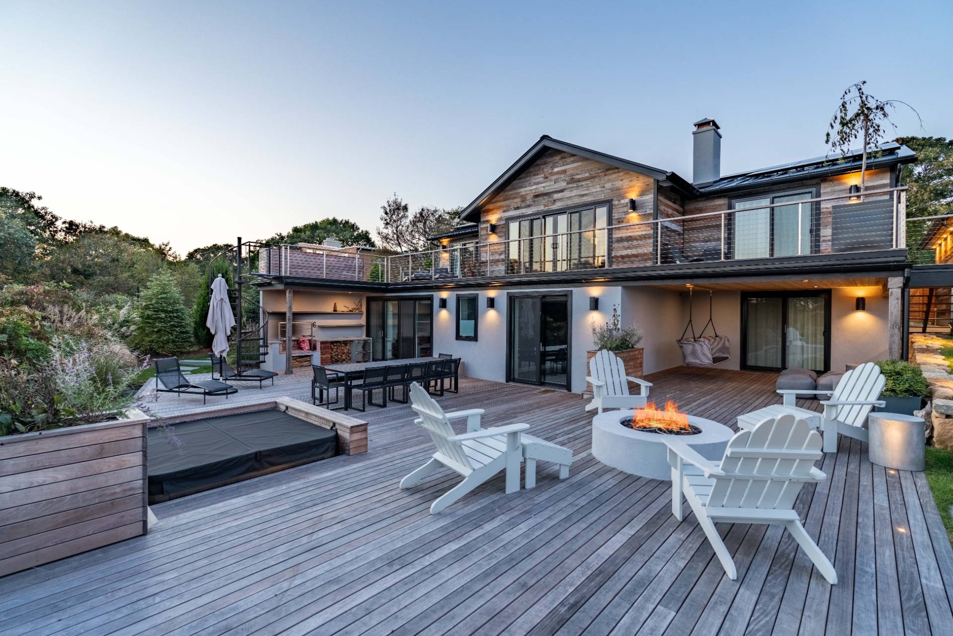 This exceptional Montauk beach home offers the perfect blend of modern sophistication and coastal charm. Ideally situated just minutes from town and the ocean, the residence captures sweeping views and an effortless indoor-outdoor flow. Designed for refined yet relaxed living, the home features a state-of-the-art chef's kitchen, soaring cathedral ceilings in the open living area, and reclaimed hardwood floors throughout. The spacious primary suite provides a serene escape, while the separate au pair suite ensures comfort and privacy for guests. The outdoor entertaining area is a true highlight - complete with a gourmet kitchen showcasing an Argentinian-style grill, a fire pit, a jacuzzi/hot tub, and generous lounge seating perfect for gatherings under the stars. Experience Montauk at its finest in this stylish, family-friendly coastal retreat that seamlessly blends comfort, elegance, and location.
