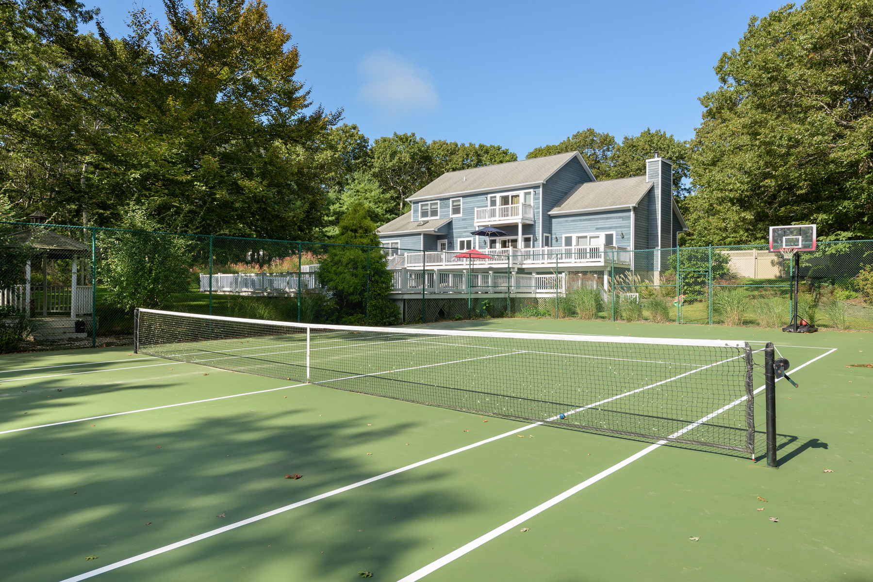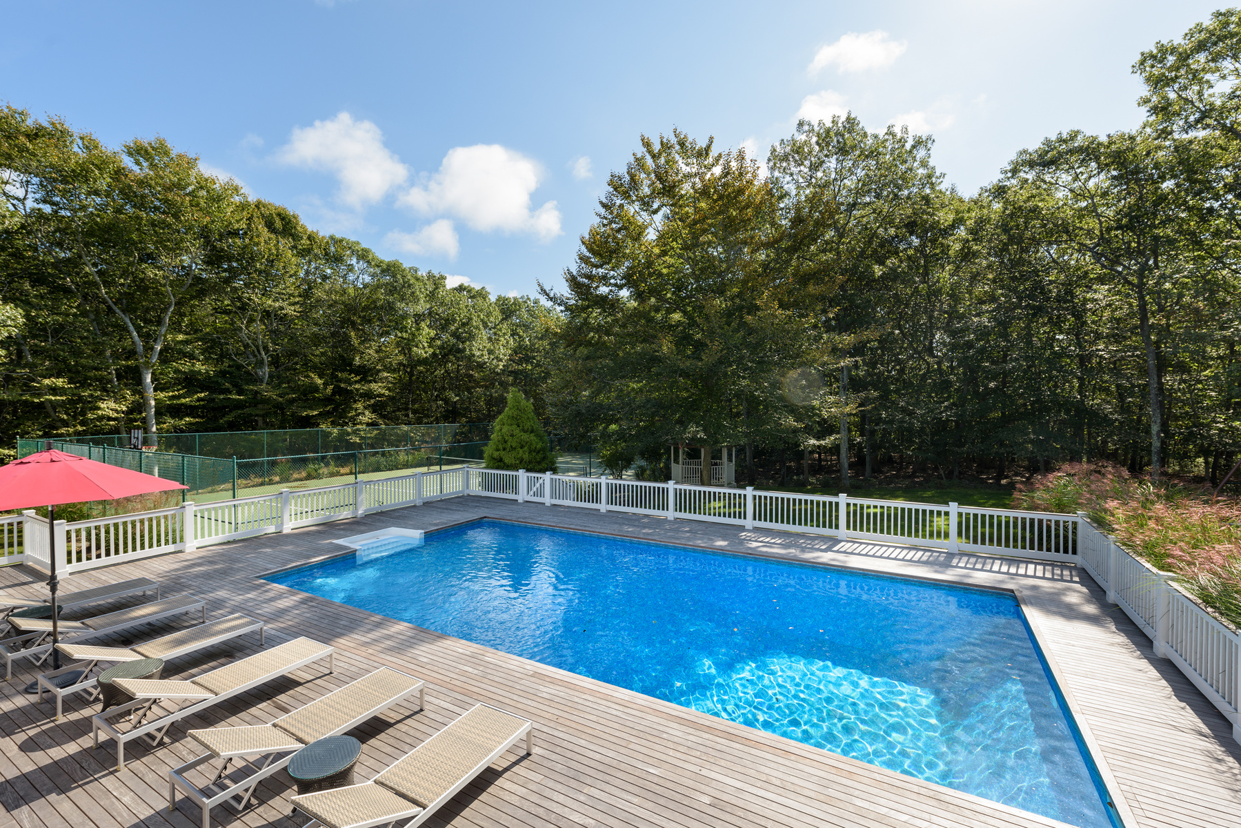 This immaculate home sits on 1. 8 private Southampton acres on a quiet cul-de-sac. Completely updated throughout, the beautifully appointed spaces have entry foyer, open high ceiling living room with a fireplace and dining area and brand new gourmet eat-in kitchen, all with glass door connecting to the spacious deck; there is also a separate TV den and powder room on the first floor. The spacious house offers five bedrooms : junior en-suite primary on the main floor, and the en-suite Primary and two additional guest bedrooms with Jack-n-Jill bathroom on second floor. Also the newly finished walk-out lower level has another bedroom with full bathroom, living space with TV, fully equipped gym and office. Plenty of outdoor activities by the heated pool and two levels of spacious deck and it's own tennis court, the completely fenced-in backyard also has a gazebo and playset! Beautifully landscaped, surrounded by acres of protected nature preserve provide privacy and tranquillity. This amazing summer retreat that has it all and is within easy access to the village and beaches.