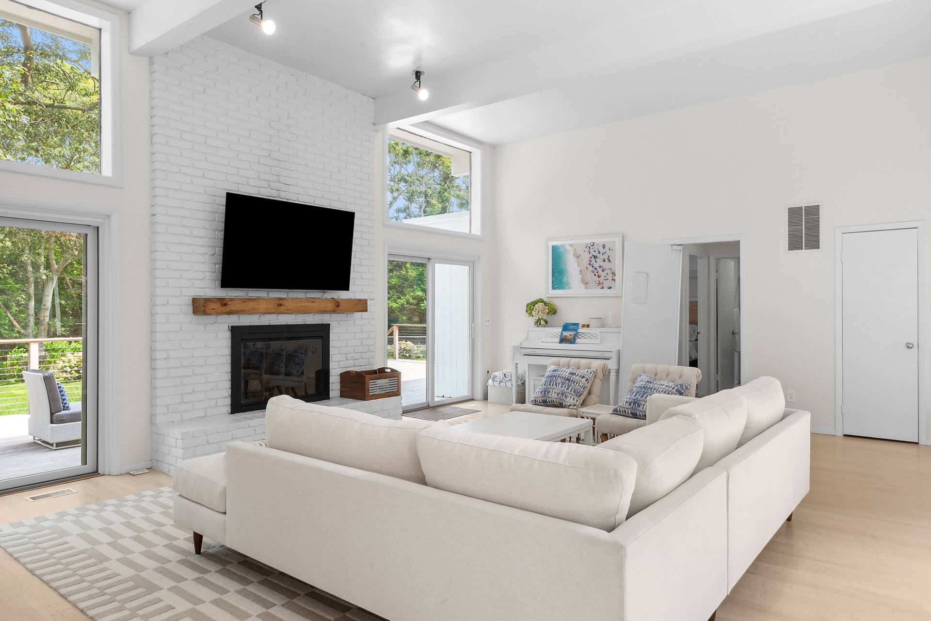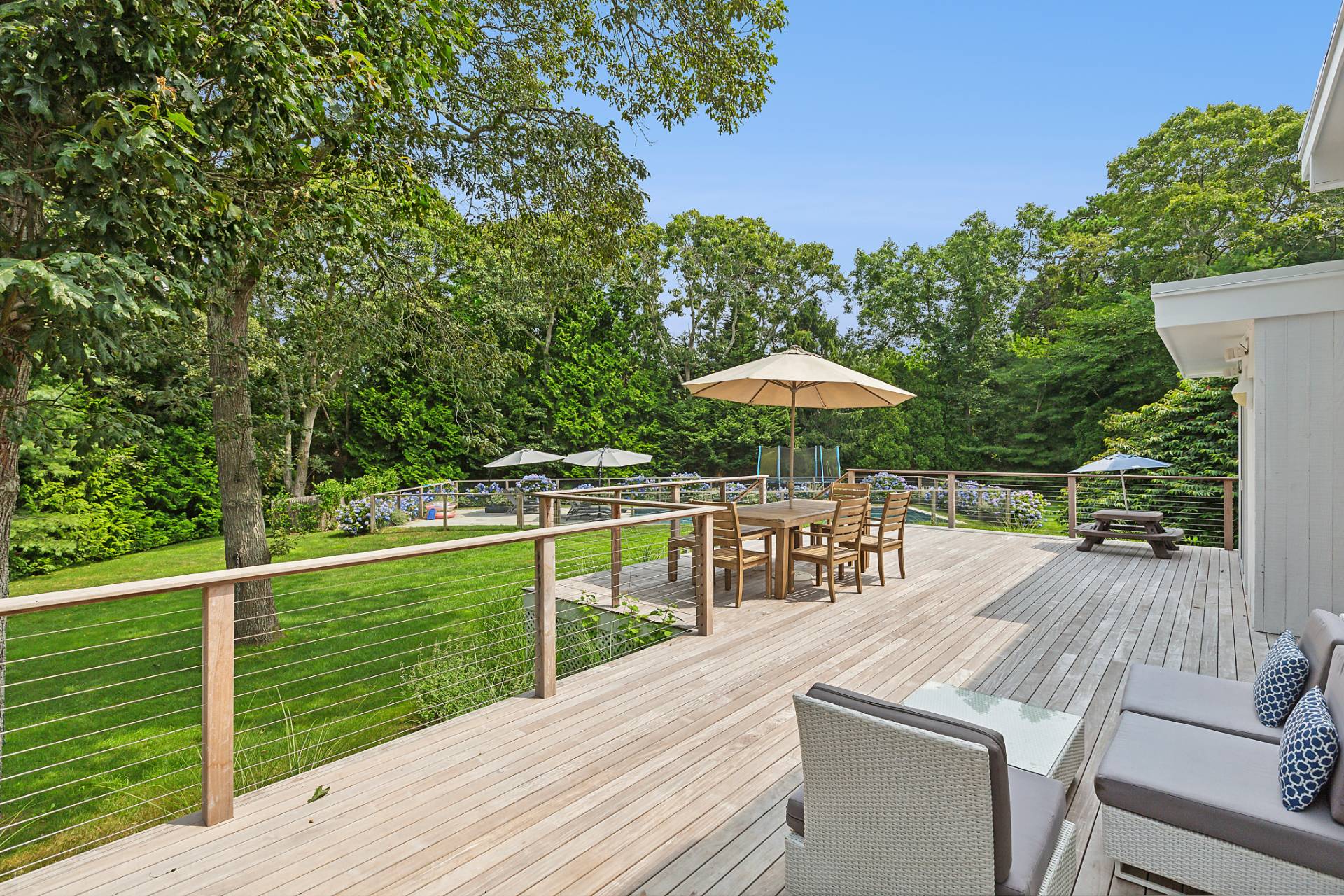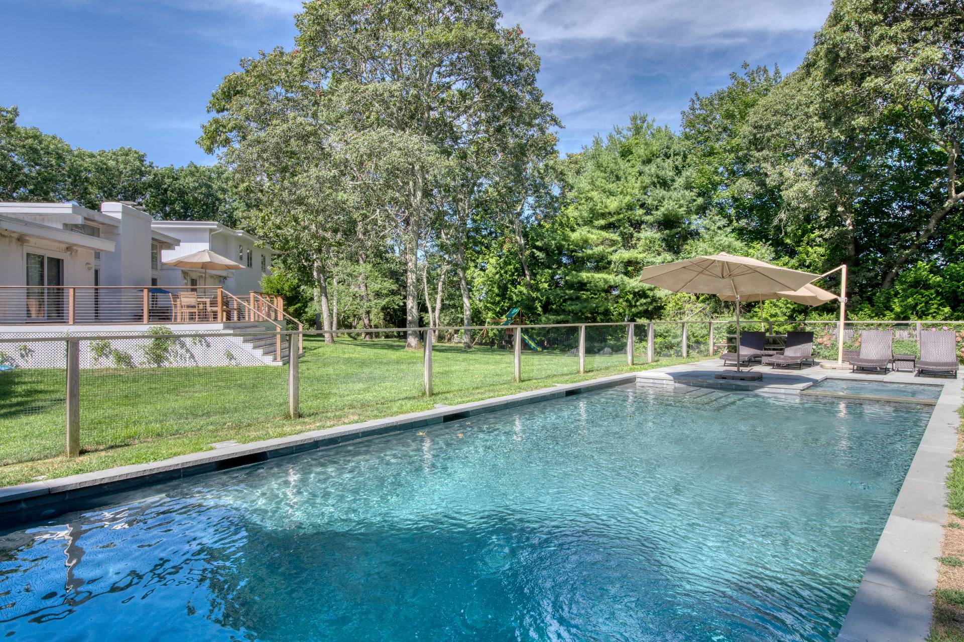 Located south of the highway on a quiet cul-de-sac in East Hampton Village is a recently renovated mid-century modern home. The 5 bedroom / 5 bathroom property is fully fenced and gated, and sits on a nearly 1-acre lot. The large ipe deck overlooks the fully fenced heated pool and hot tub that is surrounded by hydrangeas. Additional features include a beautiful and welcoming garden, high ceilings, large windows with sliding doors to both front and back decks, brick fireplace, large garage, and a basement with a playroom and an additional sleeping quarters. Take walks or bike rides around the beautiful Georgica neighborhood, spend time at top beaches (~1 mile from Georgica and Main Beach or head into East Hampton Village shops. This property is a gem in the best location. Pets possible.