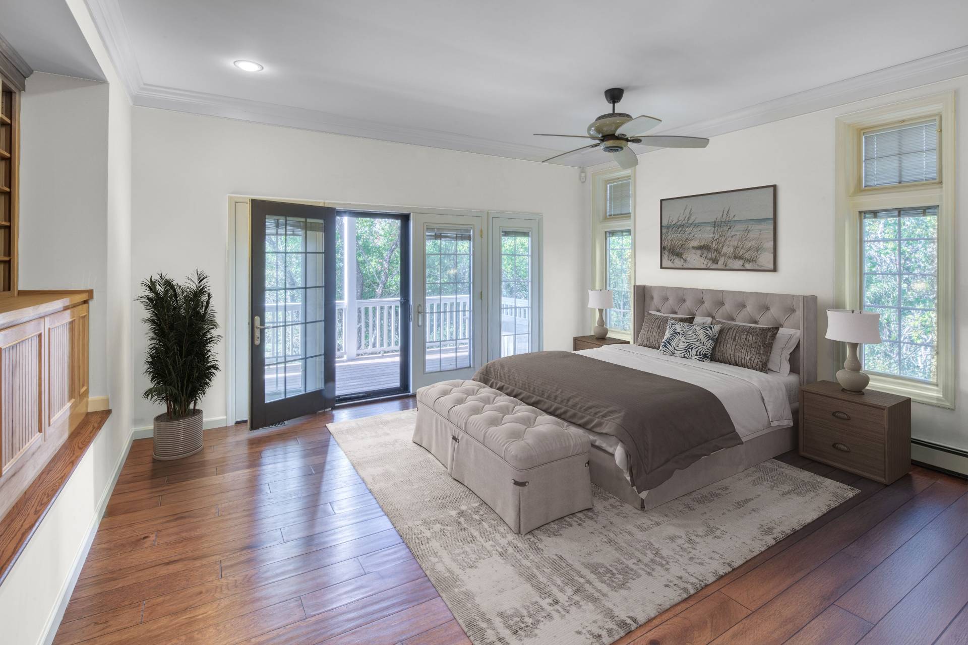 Nestled on a shy three quarters of an acre, this five bedroom, four and a half bath home offers the perfect balance of luxury and comfortable living. This three story property features over 4, 000 square feet of thoughtfully designed space, including two levels of wrap around decks. The kitchen includes expansive counter space, a large island with room for five, stainless steel appliances, and a generous walk-in pantry. The adjacent dining room, with a center fireplace, comfortably seats ten and leads to a vaulted ceiling living room, large enough to host two separate lounging areas. French glass doors span the length of the floor and open to the upper deck, where you can enjoy Montauk sunsets. The layout of the bedroom floor ensures privacy and comfort for everyone. Two generously proportioned primary suites, each with access to the lower deck, have custom walk-in closets and beautifully appointed baths. Three additional bedrooms are considerably sized and can accommodate queen, king or bunk beds. All are bright and share a large bath. Bonus rooms on the entry floor offer versatility for multiple design possibilities. With an additional full bath and a good deal of closet space, create a gym/yoga space, wine cellar or home office. Currently configured as a den, office and additional sleeping quarters, this space can easily be adapted to suit your needs. Survey with pool envelope, winter glimpses of the water, and a strong rental history complete this offering!