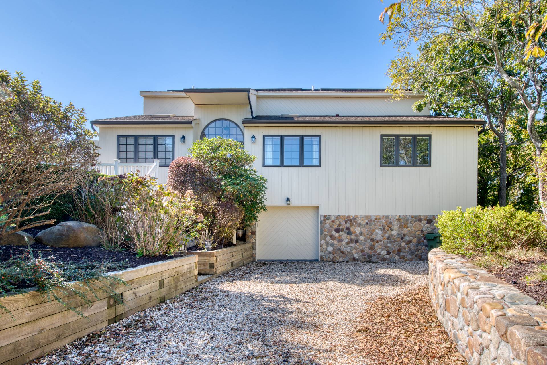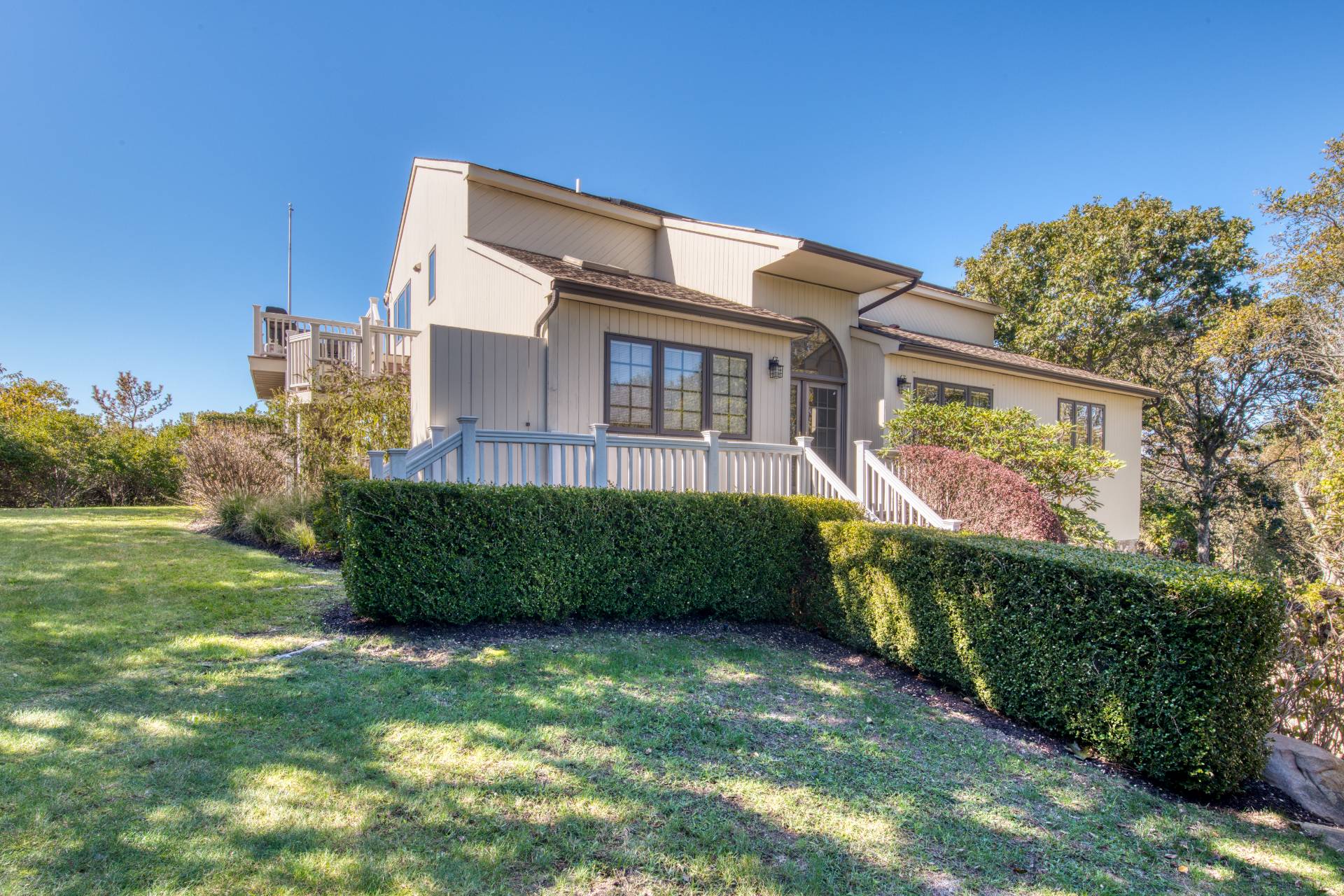 Nestled on a shy three quarters of an acre, this five bedroom, four and a half bath home offers the perfect balance of luxury and comfortable living. This three story property features over 4, 000 square feet of thoughtfully designed space, including two levels of wrap around decks. The kitchen includes expansive counter space, a large island with room for five, stainless steel appliances, and a generous walk-in pantry. The adjacent dining room, with a center fireplace, comfortably seats ten and leads to a vaulted ceiling living room, large enough to host two separate lounging areas. French glass doors span the length of the floor and open to the upper deck, where you can enjoy Montauk sunsets. The layout of the bedroom floor ensures privacy and comfort for everyone. Two generously proportioned primary suites, each with access to the lower deck, have custom walk-in closets and beautifully appointed baths. Three additional bedrooms are considerably sized and share a bath.