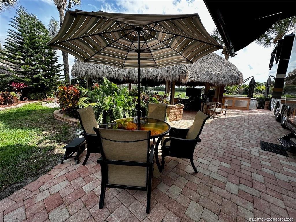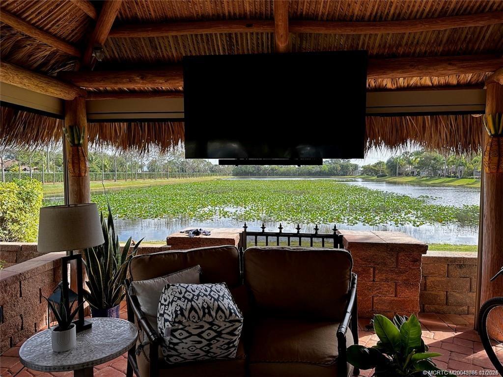 LOCAT??N, LOC?T?ON! ?xpansive lot id?all? situated in a sought-after cul-de-sac, boasting a picturesque backdrop as it backs onto a lake with captivating views of an illuminated fountain and a nature lover's dream location. Tucked away in a corner, this property is adorned with lush privacy landscaping, including a landscaped wall/bed strategically placed in front of the tiki for enhanced seclusion. The meticulously designed yard features bronze egrets and a stunning rock fountain/waterfall, adding a touch of elegance. The tiki is equipped with motorized eisenglass screens for chilly nights, a built-in bar/kitchen, and custom-made sideboard and storage units. Enjoy newly installed upgraded landscape lighting throughout. The property is fully furnished with top-of-the-line furnishings and TV, ensuring a move-in-ready experience. The new tiki roof rethatch in 2021 enhances its appeal. Experience total privacy in a tropical oasis – a must-see property!