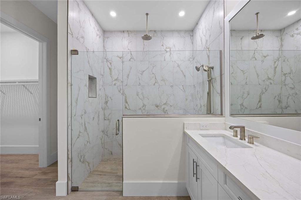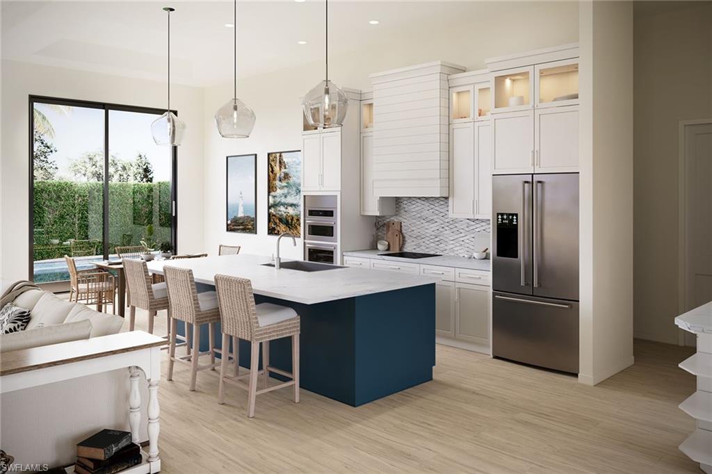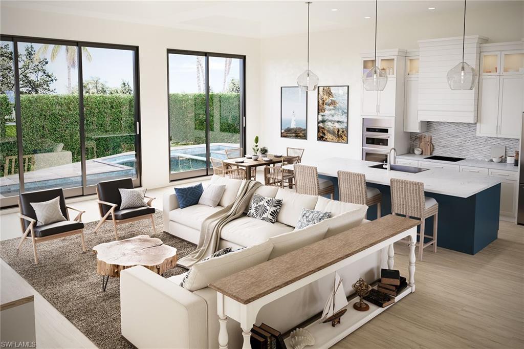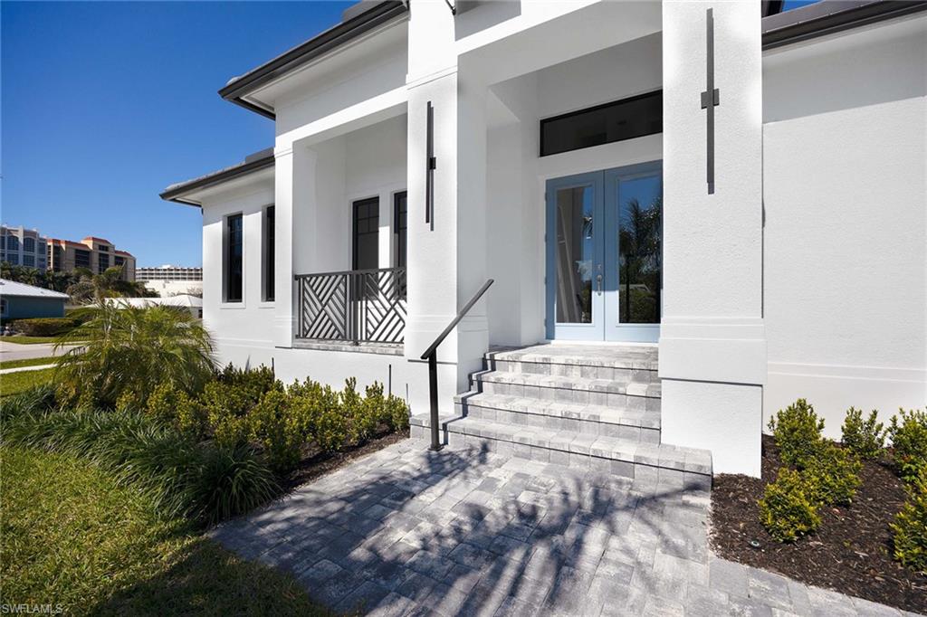 As featured on Fox News' lifestyle show 'Out about in SW Florida'. Newly completed coastal contemporary new construction. Spectacular location! At the time of new listing, this is the lowest priced new construction on the market in the heart of South Beach! Only a few blocks from the prestigious JW Marriott & Marco Beach Ocean Resort, where you will find some of the best restaurants on Marco. A few blocks to Marco Walk, Hilton & Marriott Crystal Shores (restaurants/bars, shops, ice cream/gelato, and movie theater) & access to South Beach. Expansive great room with open concept: 28 feet of sliding glass doors (3 sets; 10 foot tall), 12 foot ceilings with double tray to peak of 14 feet, gourmet kitchen with Shaker cabinets, shadow boxes above, Quartz tops (10 foot island), dry bar, & crown molding throughout. 4 bedroom, 3 ½ bath, 3 car garage. Shaker cabinets with Quartz tops in all bathrooms. Wood plank porcelain tile throughout. Hurricane impact windows & doors. Flat slate tile roof. Inviting pool & cascading spa surrounded by travertine tile lanai. Epoxy garage floor. Paver stone driveway. Excellent rental potential! Similar properties in this area can rent for upwards of $14, 000/week during High Season. Renderings are similar to finishes but not exact.