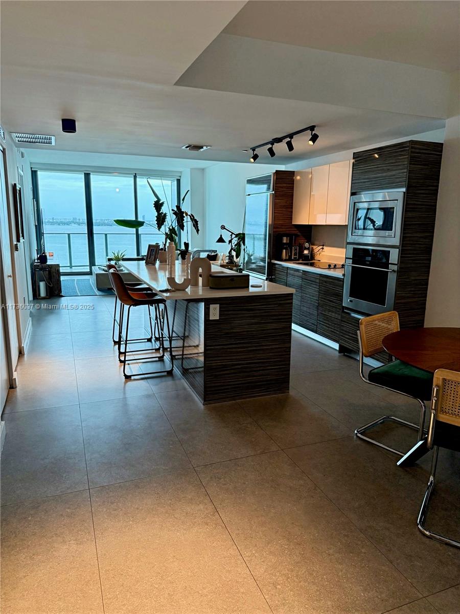 The floors feature large, modern gray stone-look tiles that are both stylish and durable. The kitchen is equipped with GE Monogram appliances.