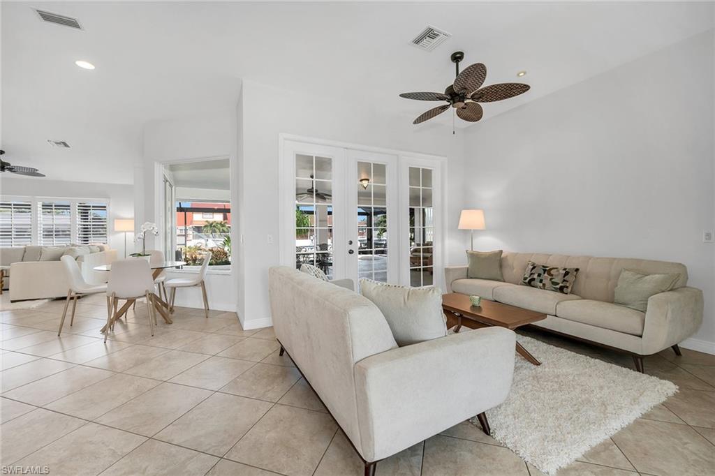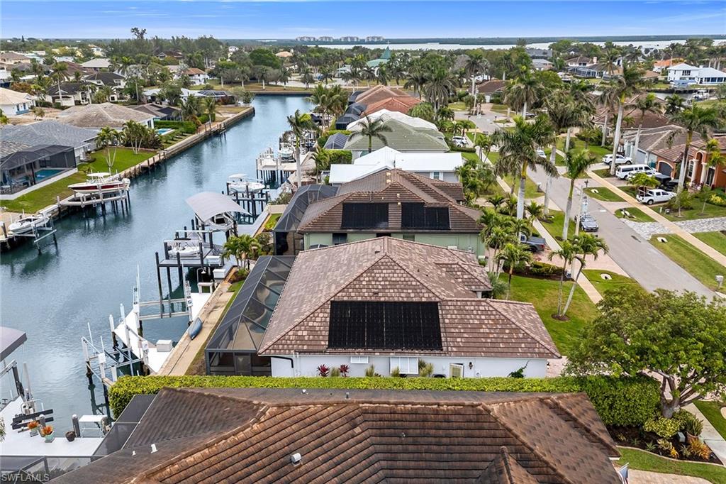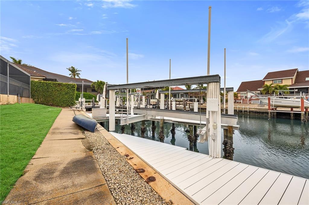 In a boater’s paradise, this turnkey-furnished waterfront pool home offers tranquil canal views, gulf access, and a private dock equipped with two boat lifts and a jet ski lift, ideal for those who love fishing, boating and exploring the waterways of Marco Island. Designed with an open-concept layout and a split-bedroom floor plan, this three-bedroom, two-bath home seamlessly blends indoor and outdoor living. The spacious great room and adjacent dining area open to the lanai through glass sliders, while the formal dining area and living room, both with French doors, provide additional access, all showcasing stunning waterfront views. The chef’s kitchen is thoughtfully designed with soft-close cabinetry, granite countertops, a matching backsplash, recessed and under-cabinet lighting, and a large island with a breakfast counter. A pantry with sliding drawers offers ample storage, while modern appliances, including a range, microwave, refrigerator and dishwasher, enhance functionality. The owner’s suite is a private retreat featuring lanai access, a walk-in closet and an en-suite bath with a dual-sink vanity, soaking tub, and a walk-in shower with glass enclosure and floor-to-ceiling tile. Two guest bedrooms, one with lanai access, share an adjacent bath with a walk-in shower. The outdoor living space is designed for relaxation and entertainment, boasting a large covered lanai, picture-frame screen enclosure and a solar-heated pool. The private dock is fully equipped with two boat lifts and a jet ski lift, making this home a boater’s dream. Additional upgrades include tile flooring throughout the main living areas, white plantation shutters, vaulted ceilings, a 2023 plumbing re-pipe and a 2022 re-roof. A wide brick paver driveway leads to a spacious two-car garage. Just minutes from Marco Island’s pristine beaches, upscale boutiques, fine dining, parks, museums and golf courses, this home offers the ideal blend of coastal luxury and an active waterfront lifestyle. Whether you enjoy kayaking, paddleboarding, biking, tennis, pickleball or yoga on the beach, the possibilities for recreation are endless. With the executive airport nearby, effortless travel is in reach.