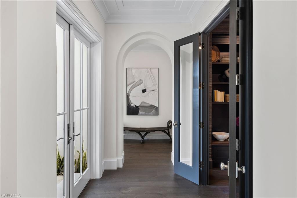 This stunning 2025-built residence is a true masterpiece. Combining the timeless charm of Santa Barbara architecture with the relaxed elegance of the Caribbean, this home offers a seamless blend of sophistication, modern luxury, and serene living. With 5 bedrooms, a dedicated study, and a library, this expansive home spans almost 6, 000 square feet of refined living space, designed for both grand entertaining and intimate family moments. From the moment you enter, you'll be captivated by custom millwork Mahogany front doors , elegant architectural details of the foyer, dark Legno Bastone French Oak flooring, and the abundance of natural light pouring through large windows that bring the outdoors in. The chef’s kitchen is a showstopper, featuring a central quartzite island, custom cabinetry, and high-end appliances, including two Sub-Zero refrigerator/freezers, a 48-inch Wolf gas range, double oven, Wolf microwave, and warming drawer. The adjacent butler’s pantry with Sub-Zero beverage center and Bosch dishwasher elevates both style and function for the most discerning home chefs. The main floor includes a guest bedroom with an en-suite bath, a private den, and a library (with ice make, beverage refrigerator and 102 bottle wine refrigerator, along with a half bath and a full bath accessible from the lanai. The sun-soaked primary suite is a luxurious retreat, offering an expansive walk-through custom closet that leads into the spa-inspired bath, designed with indulgence in mind. The family room seamlessly opens to the lushly landscaped patio, featuring a summer kitchen equipped with a Sub-Zero beverage center, ice maker, GE dishwasher, and a 40-inch BBQ—perfect for year-round outdoor entertaining. Pool is 24 x 18. 5, plus the hot tub is 9. 5 x 6. The second level features a bonus loft area and 3 additional en-suite bedrooms. This custom-built home it’s a treat to experience as it is one of Naples finest new construction homes in the area, where every detail has been carefully designed for those with discerning taste. Built to the latest and best codes, including a full house generator. Moorings Private Beach Club has a very low membership fee, what other beach club can you join for $1450.