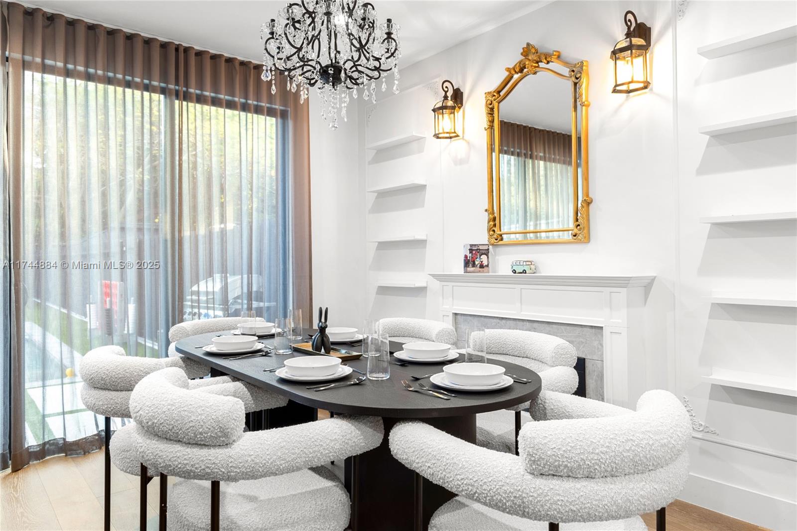 ? French Chic Interiors – Black marble kitchen, plush boucle dining chairs, crystal chandeliers, and ornate gold accents.
