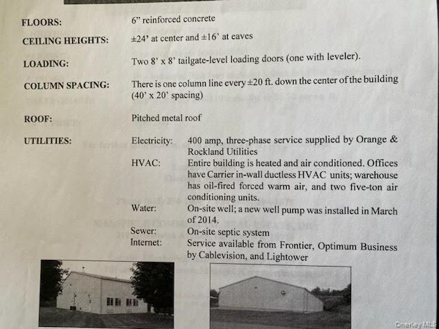 All In Full Service Lease. 400 amp service; Two 8'x8' tailgate level loading docs; There is one column line every 20 feet; Entire building is heated and air conditioned. 24' height at center. This spacious and clean warehouse is strategically located just 2 miles from NYS Route 17 and Interstate 84 and US Highway 6, offering easy access for deliveries and distribution. The property features a large lot perfect for truck parking and unloading. Inside, you'll find 11, 200 square feet where 5, 000 square feet is divided and available. This warehouse is climate-controlled. Loading doc has leveler for smooth operations. Ideal for warehouse storage, this space is also versatile enough for light industrial uses such as assembly. Climate controlled. All in Lease; all utilities and CAM included for lease price.