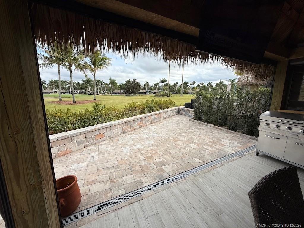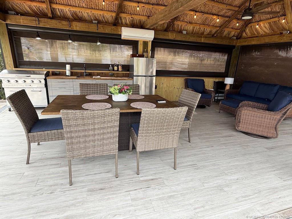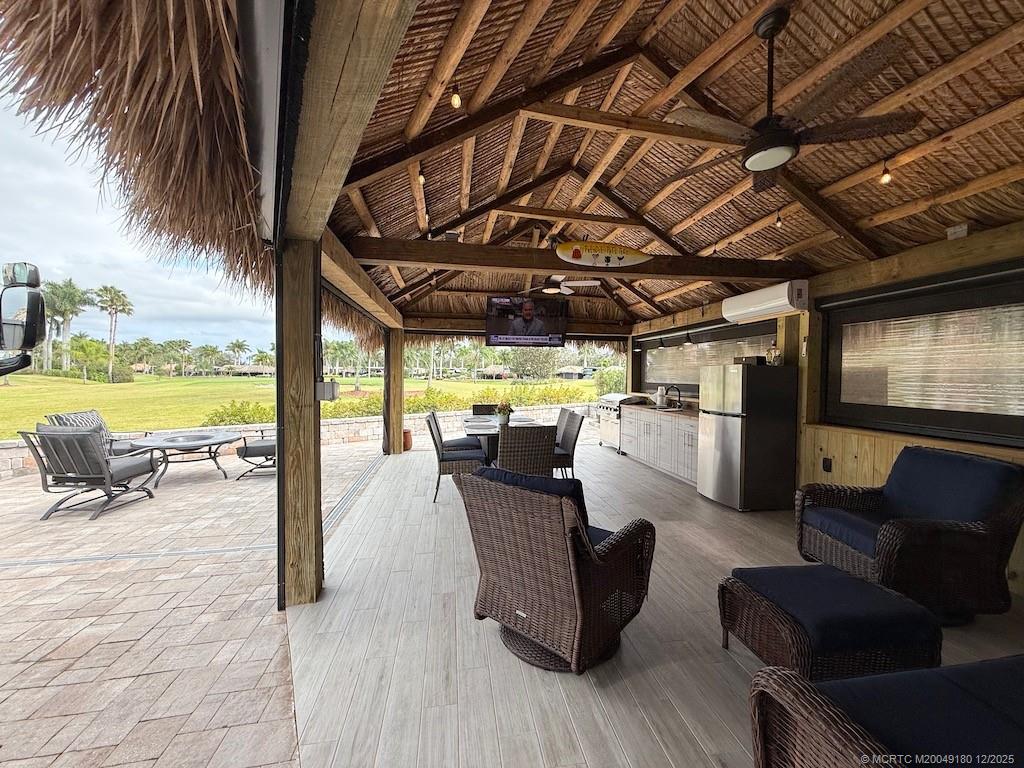 Spect??ular Build?ut – A ?rue H?dden Gem! At first glance, th?s ?ull-in lot may seem like a standard tiki, but step inside, and you’ll discover a beautifully crafted post-and-beam pavilion, featuring stained structural beams that add a touch of rustic elegance. The enclosed tiki offers the perfect balance of privacy and comfort, with a combination of eisenglass and motorized screens for year-round enjoyment. Inside, a well-appointed built-in kitchen, tile flooring, and a partial wall create a warm, inviting atmosphere that feels like home. Positioned facing the golf course, this lot provides breathtaking views while maintaining privacy with a spacious, fully pavered patio—ideal for relaxing or entertaining. Move-in ready and thoughtfully designed, this one-of-a-kind lot has everything you need to start enjoying the luxury RV lifestyle today!