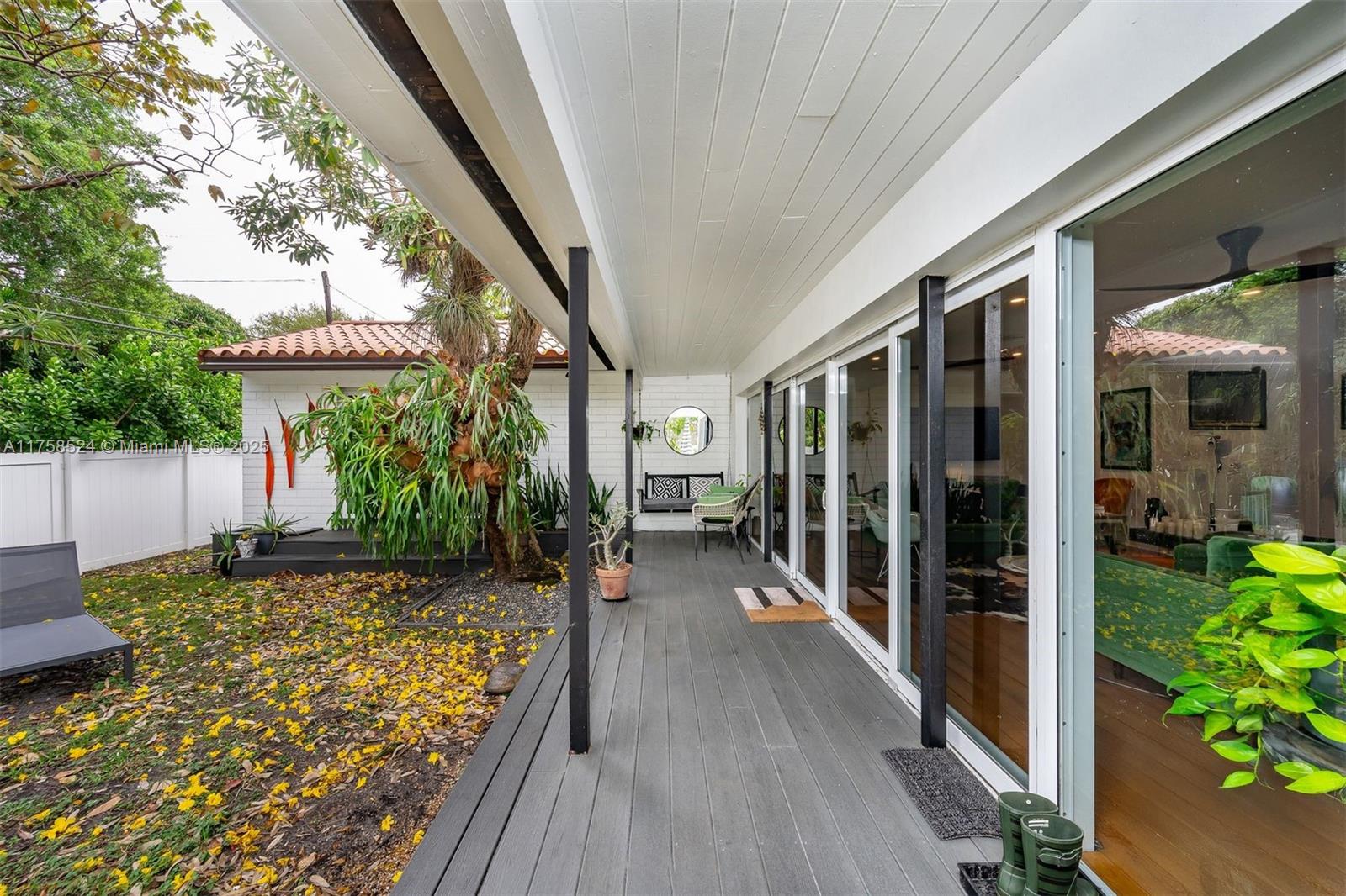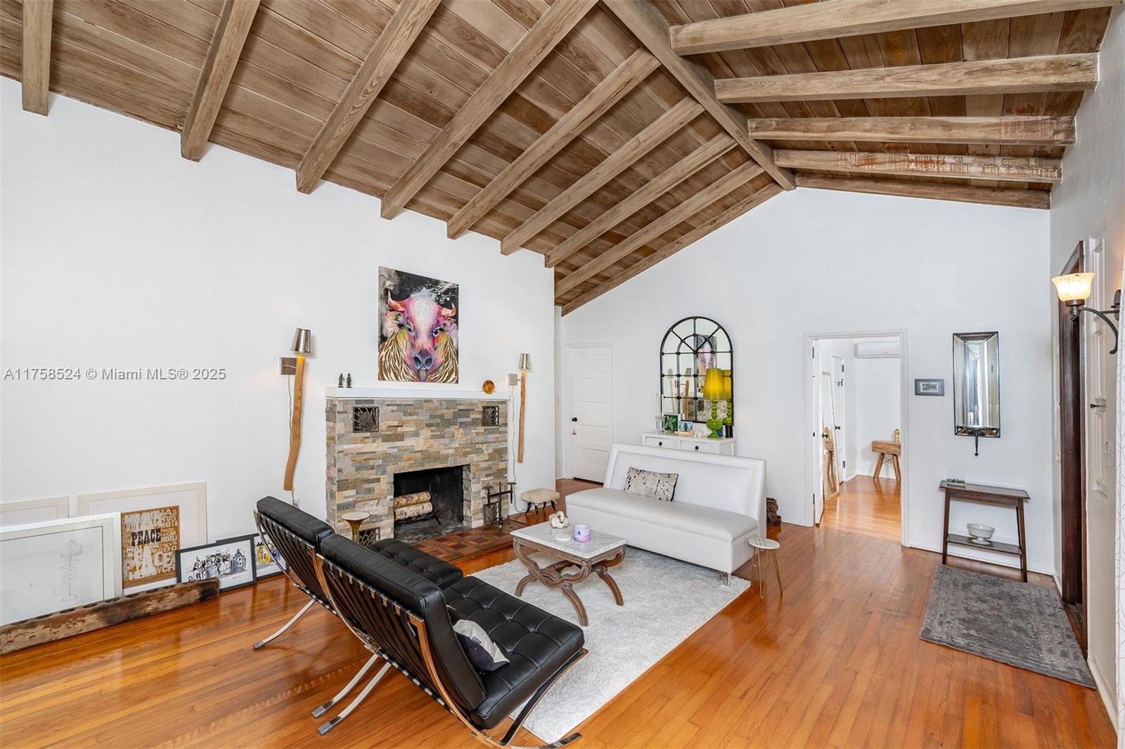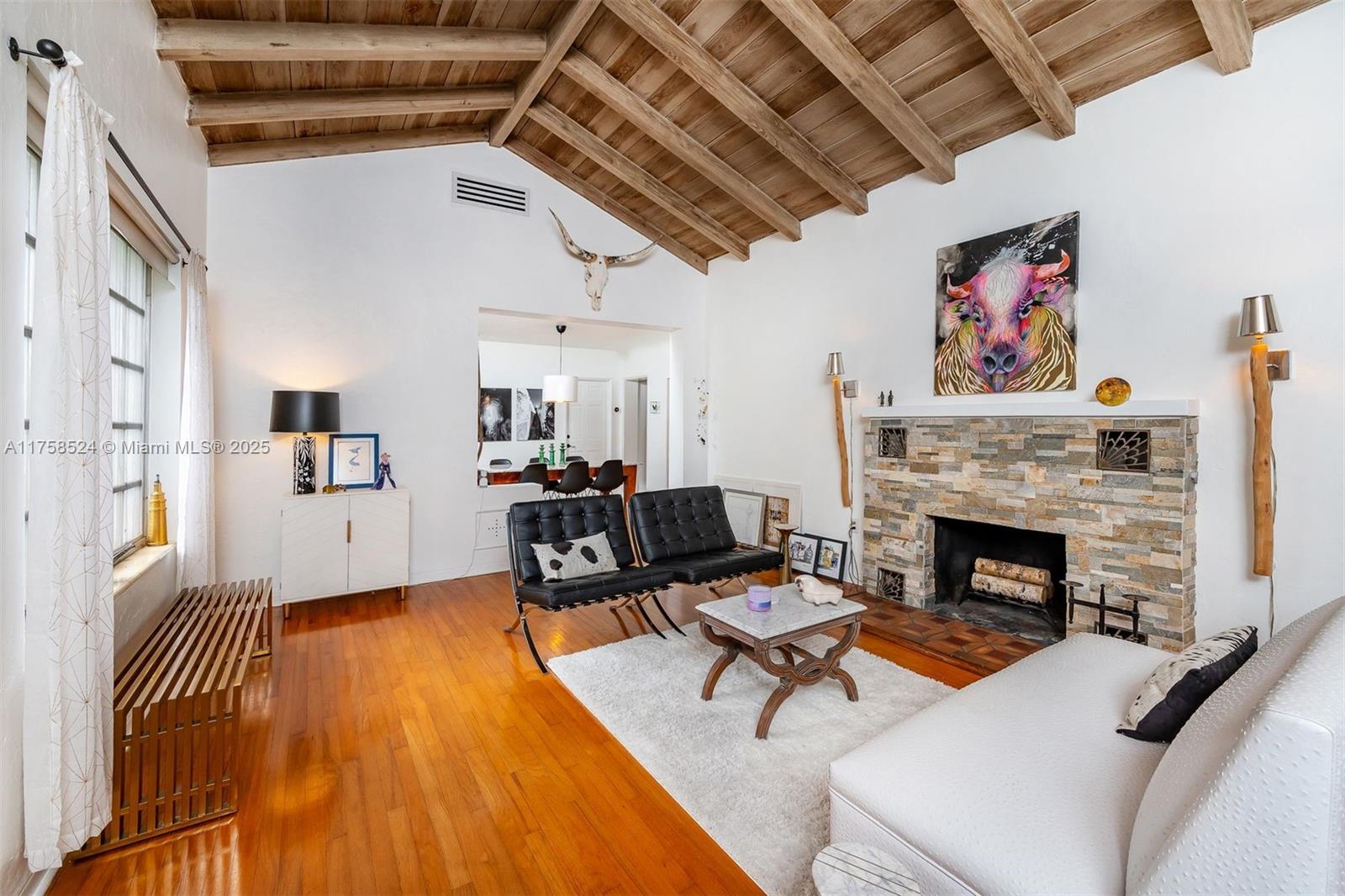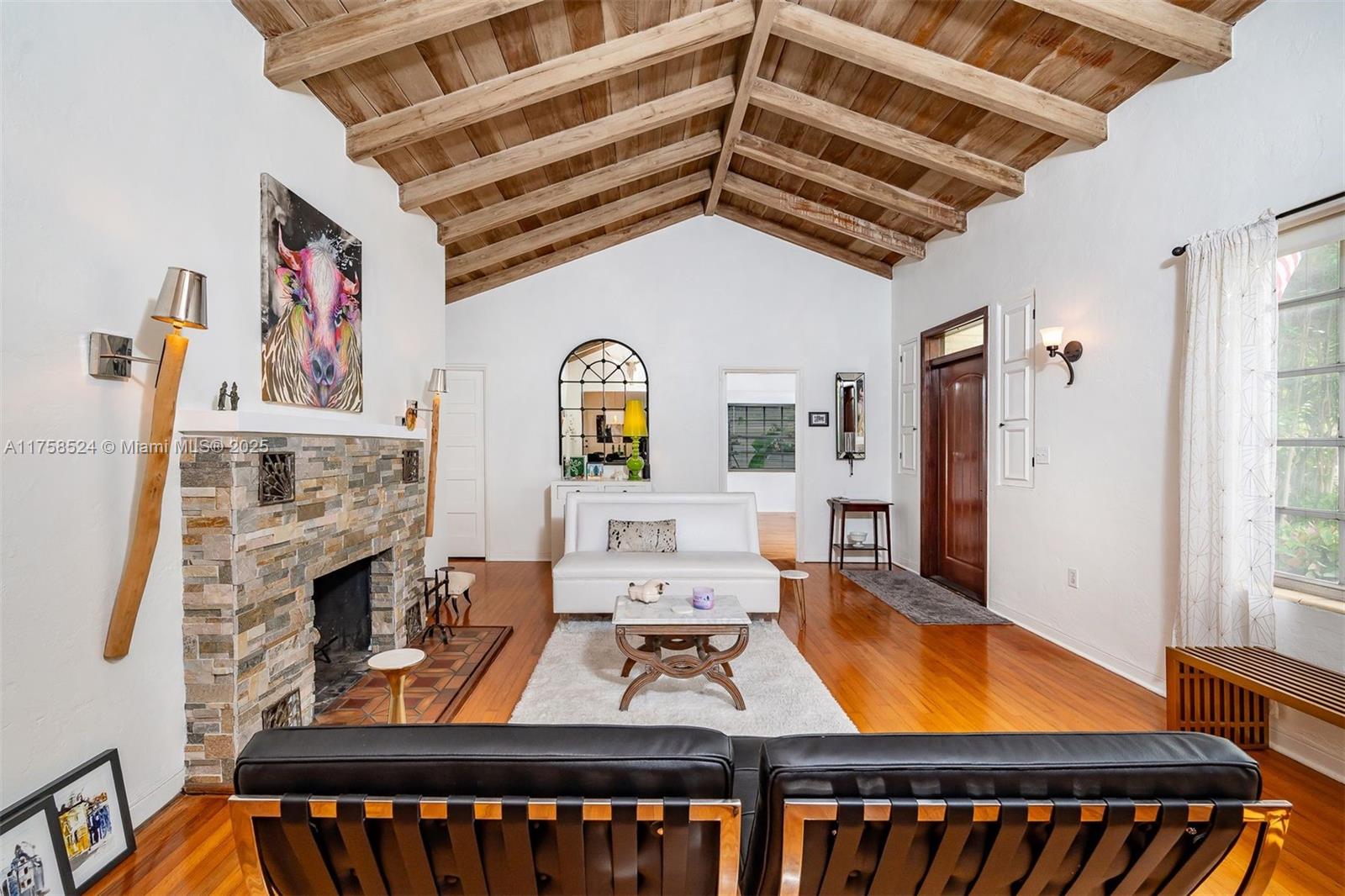Miami Springs Charm at its Finest!! This Morningside Drive Home has been beautifully maintained by its three owners since 1937. Featuring 3 spacious bedrooms, two bathrooms and a 1-car garage/laundry room, this home is ready to move in and enjoy. Original hardwood floors, 2 wood burning fireplaces, spacious family room, beautiful vaulted tongue and groove ceilings, built ins and more. The primary bedroom is very spacious and features, two walk in closets, sitting area and double sliding doors with tranquil views of the garden and covered patio. The primary bath is complete with double sinks, shower and features imported Moroccan Zellige tile. The split bedroom plan features two additional bedrooms with jack and jill bathroom recently updated with all the modern finishes.