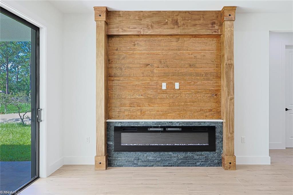 Built in electric fire place adds a beautiful look to the living room.