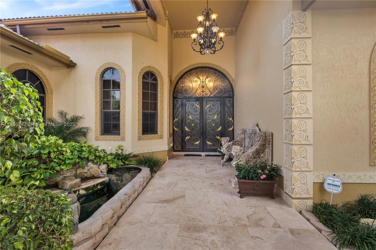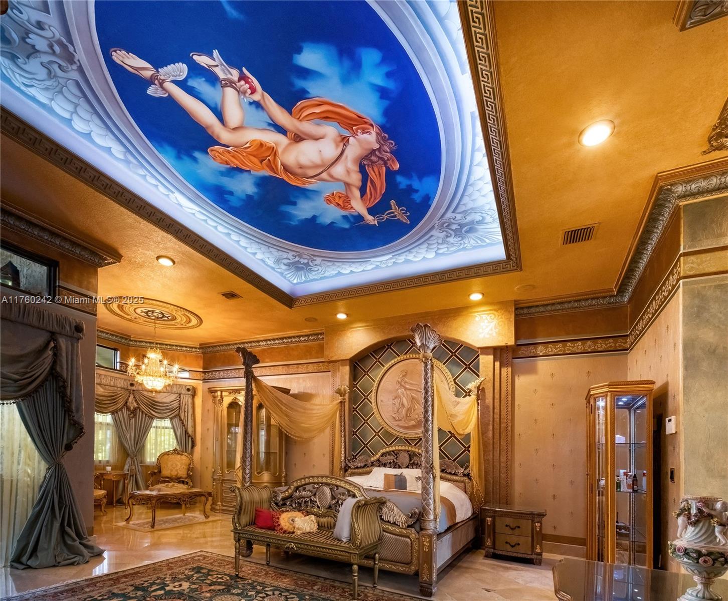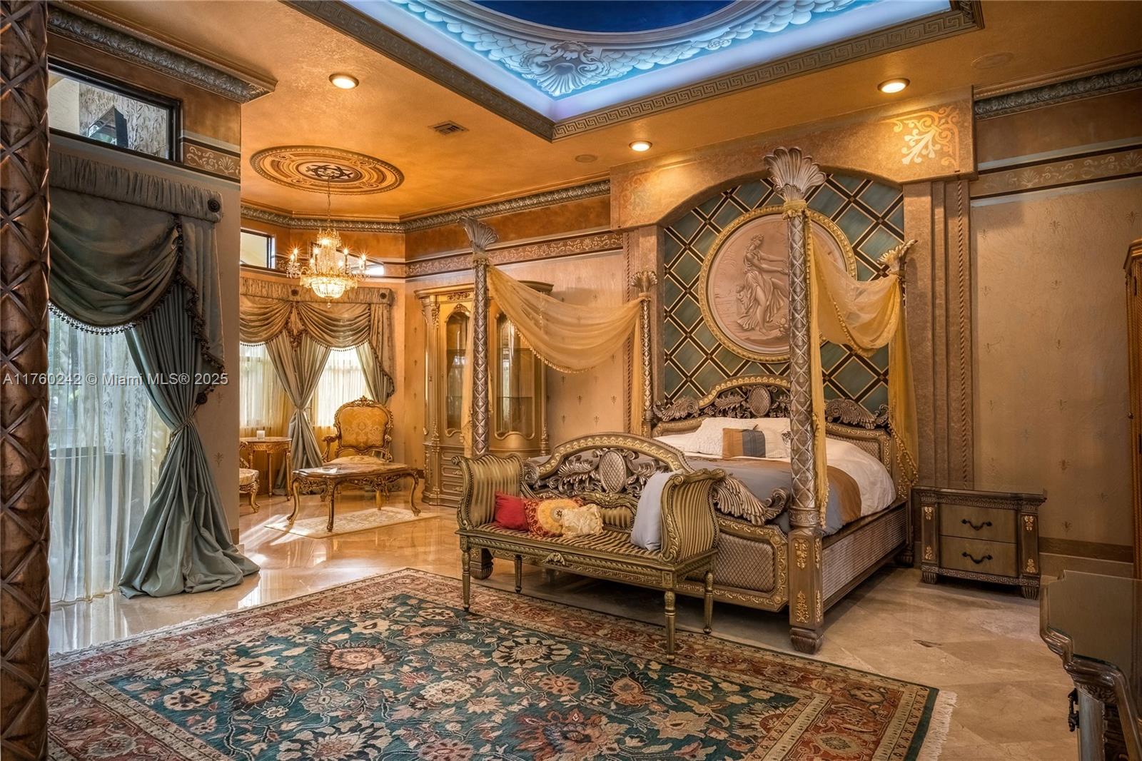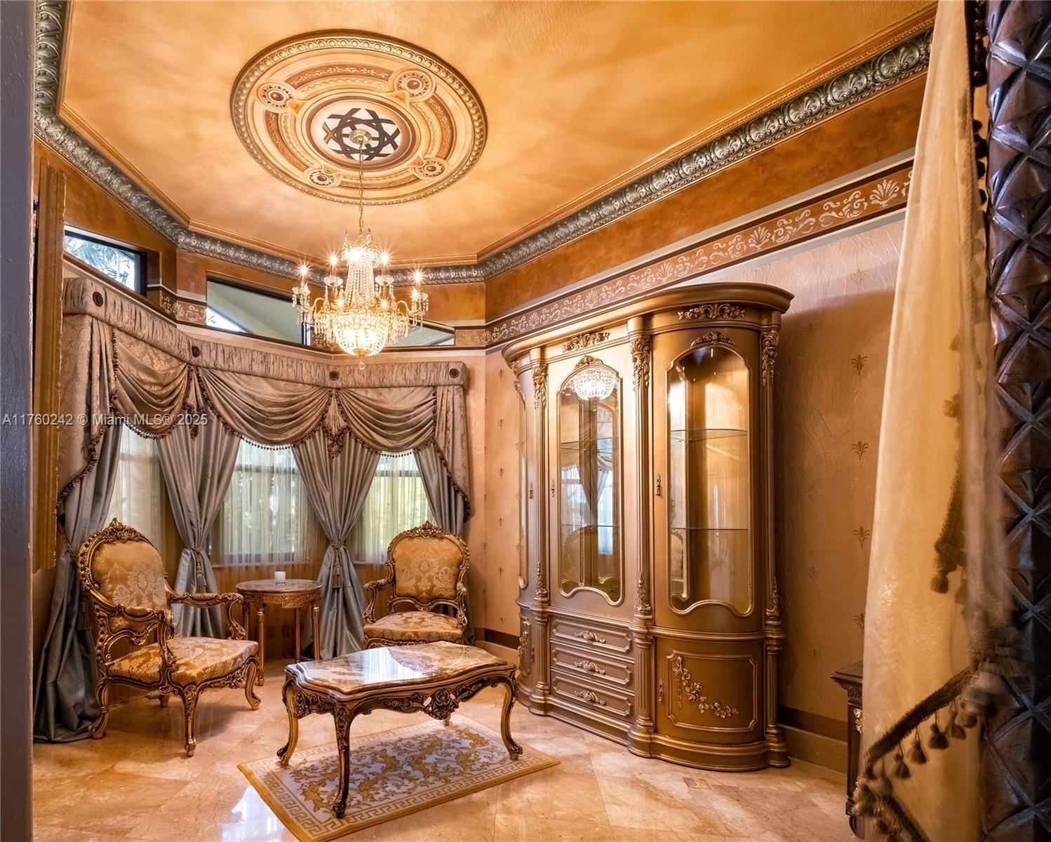 Discover a masterpiece in the Redlands! This exquisite estate features custom iron gates, a grand porte-cochere, and lush palm-lined landscaping. Inside, soaring ceilings, custom millwork, and hand-painted walls by a commissioned artist create a one-of-a-kind ambiance. Lavish window treatments, Birdseye Maple cabinetry, and opulent chandeliers, some 18K gold-plated, enhance its elegance. Offered fully furnished, this home boasts a screened lanai, lush gardens, and a sparkling pool—perfect for entertaining. A rare opportunity to own a true work of art!