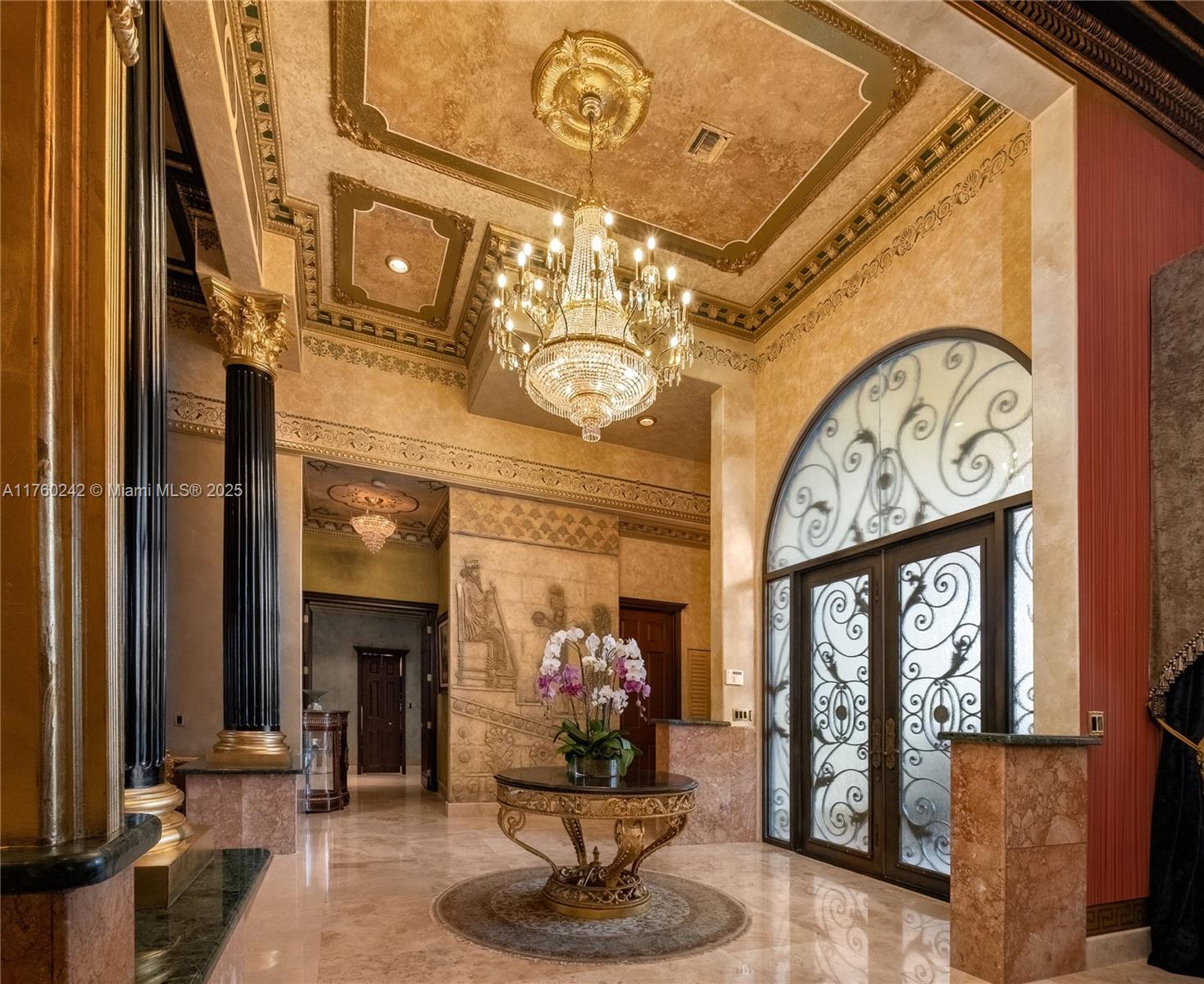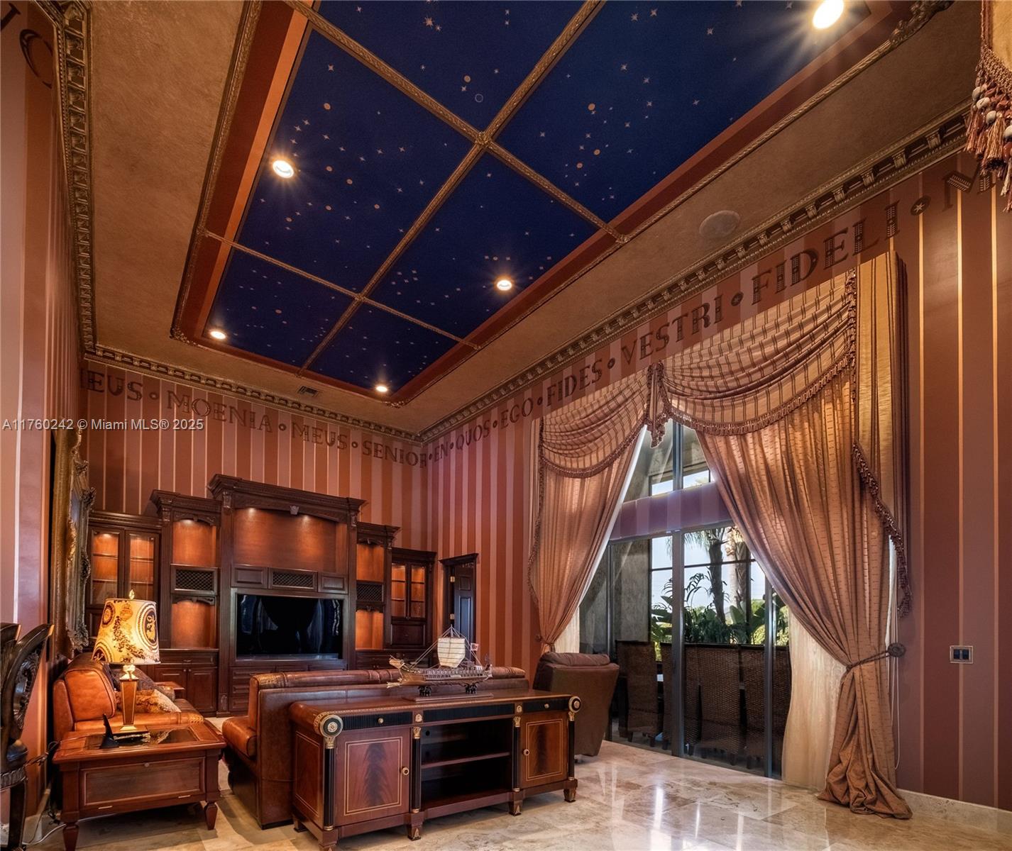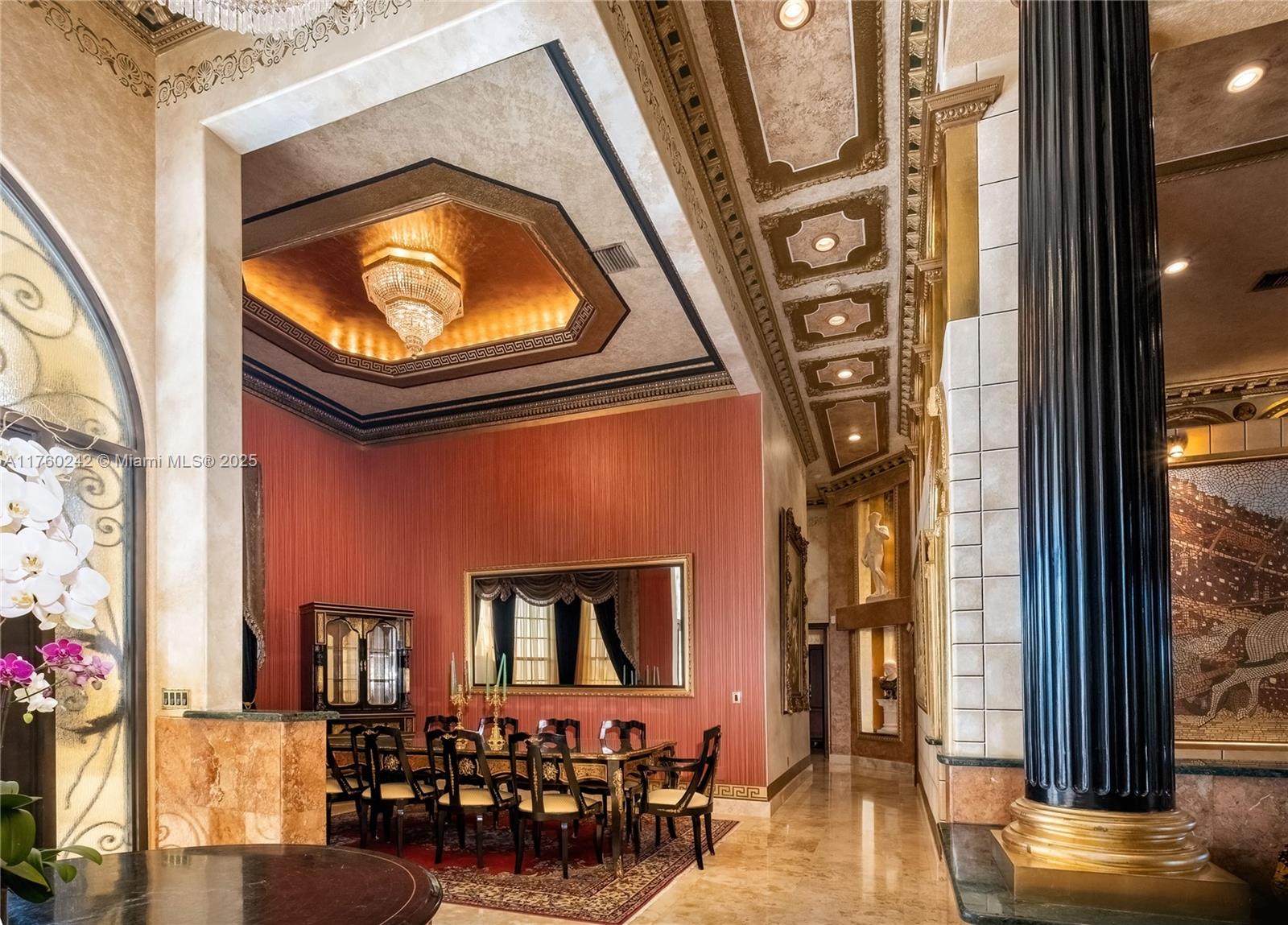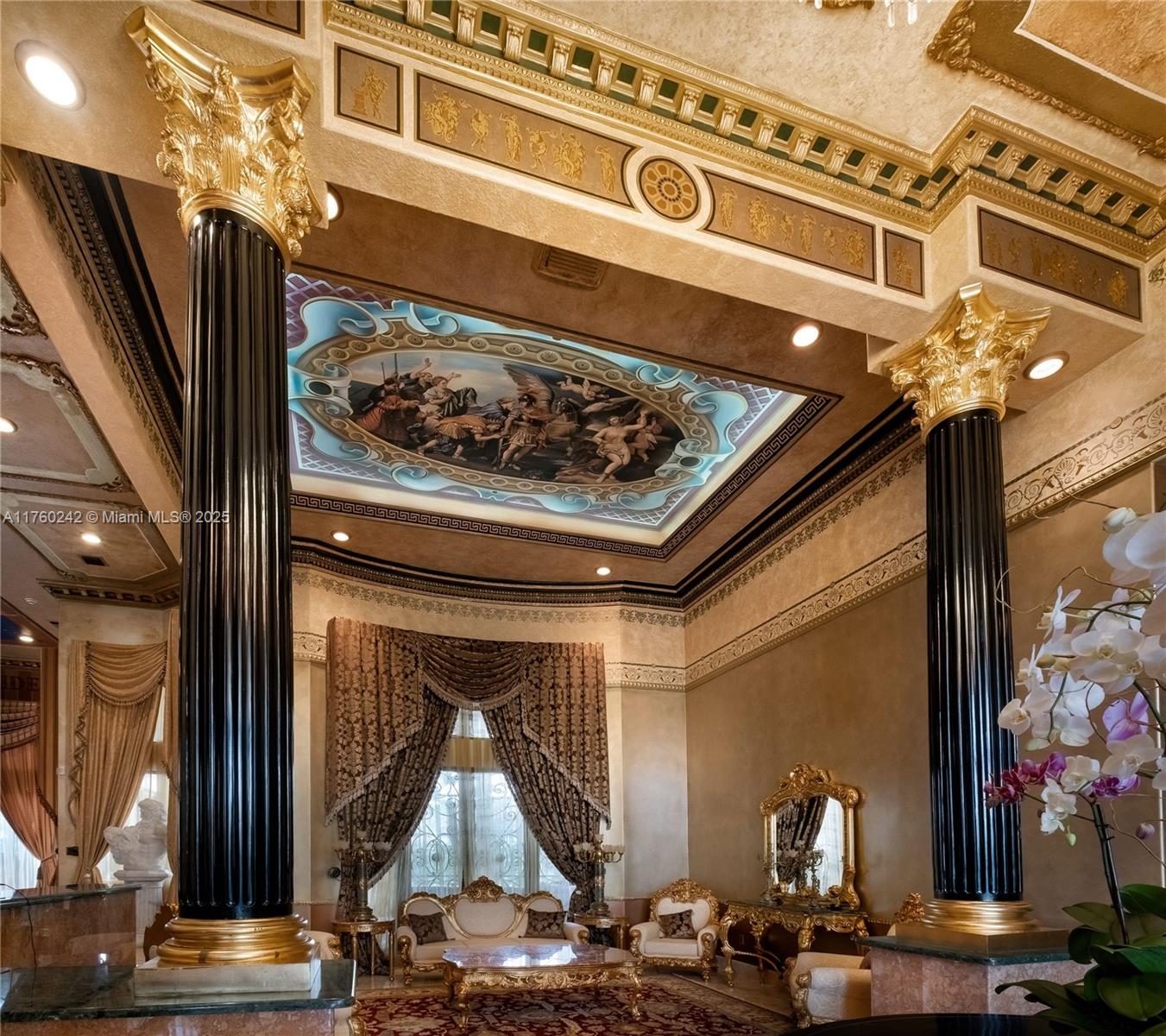 Discover a masterpiece in the Redlands! This exquisite estate features custom iron gates, a grand porte-cochere, and lush palm-lined landscaping. Inside, soaring ceilings, custom millwork, and hand-painted walls by a commissioned artist create a one-of-a-kind ambiance. Lavish window treatments, Birdseye Maple cabinetry, and opulent chandeliers, some 18K gold-plated, enhance its elegance. Offered fully furnished, this home boasts a screened lanai, lush gardens, and a sparkling pool—perfect for entertaining. A rare opportunity to own a true work of art!