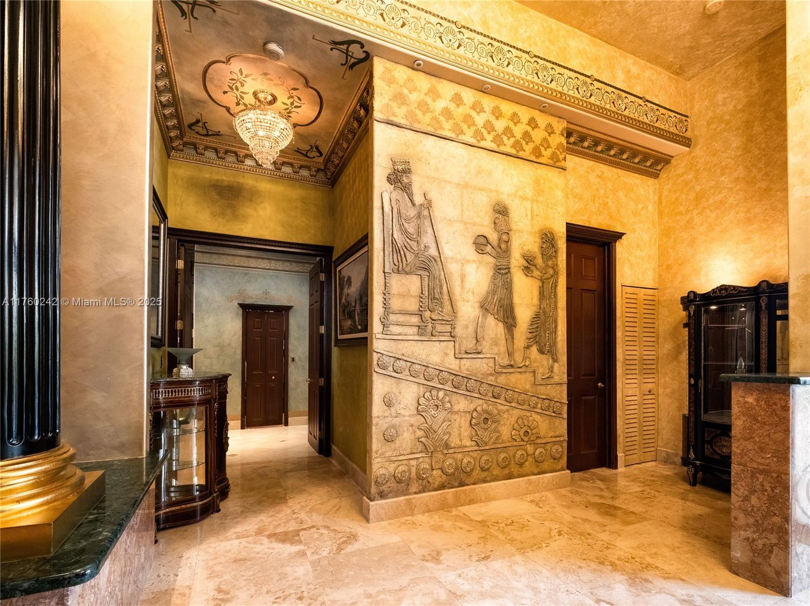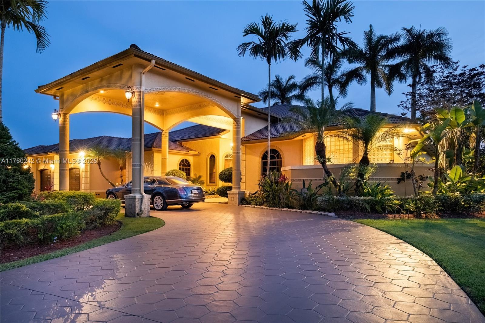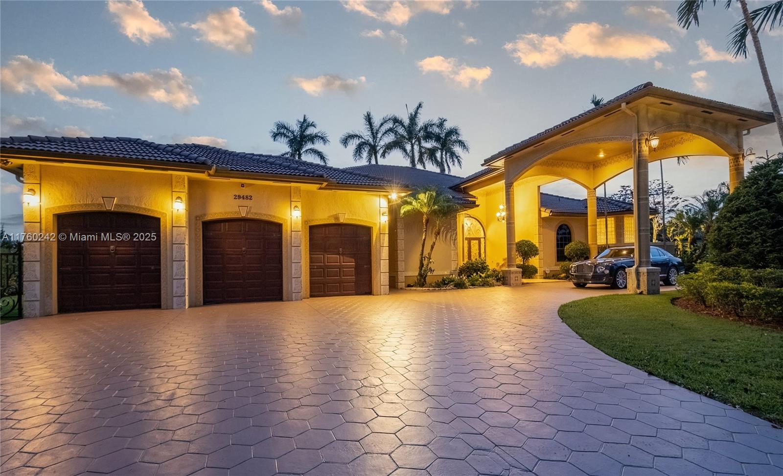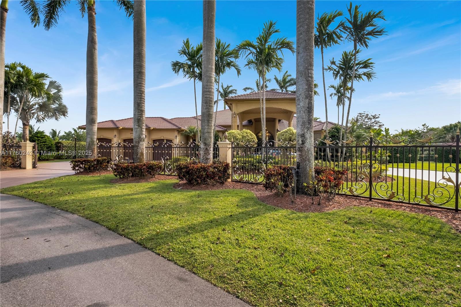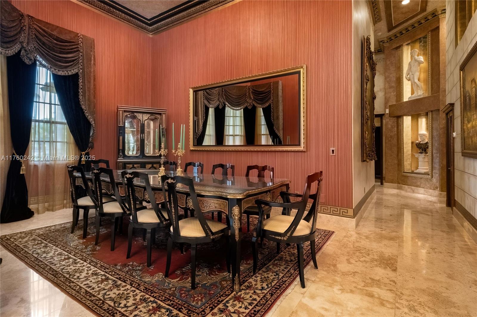 Discover a masterpiece in the Redlands! This exquisite estate features custom iron gates, a grand porte-cochere, and lush palm-lined landscaping. Inside, soaring ceilings, custom millwork, and hand-painted walls by a commissioned artist create a one-of-a-kind ambiance. Lavish window treatments, Birdseye Maple cabinetry, and opulent chandeliers, some 18K gold-plated, enhance its elegance. Offered fully furnished, this home boasts a screened lanai, lush gardens, and a sparkling pool—perfect for entertaining. A rare opportunity to own a true work of art!
