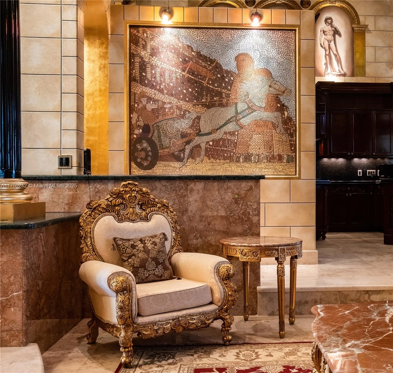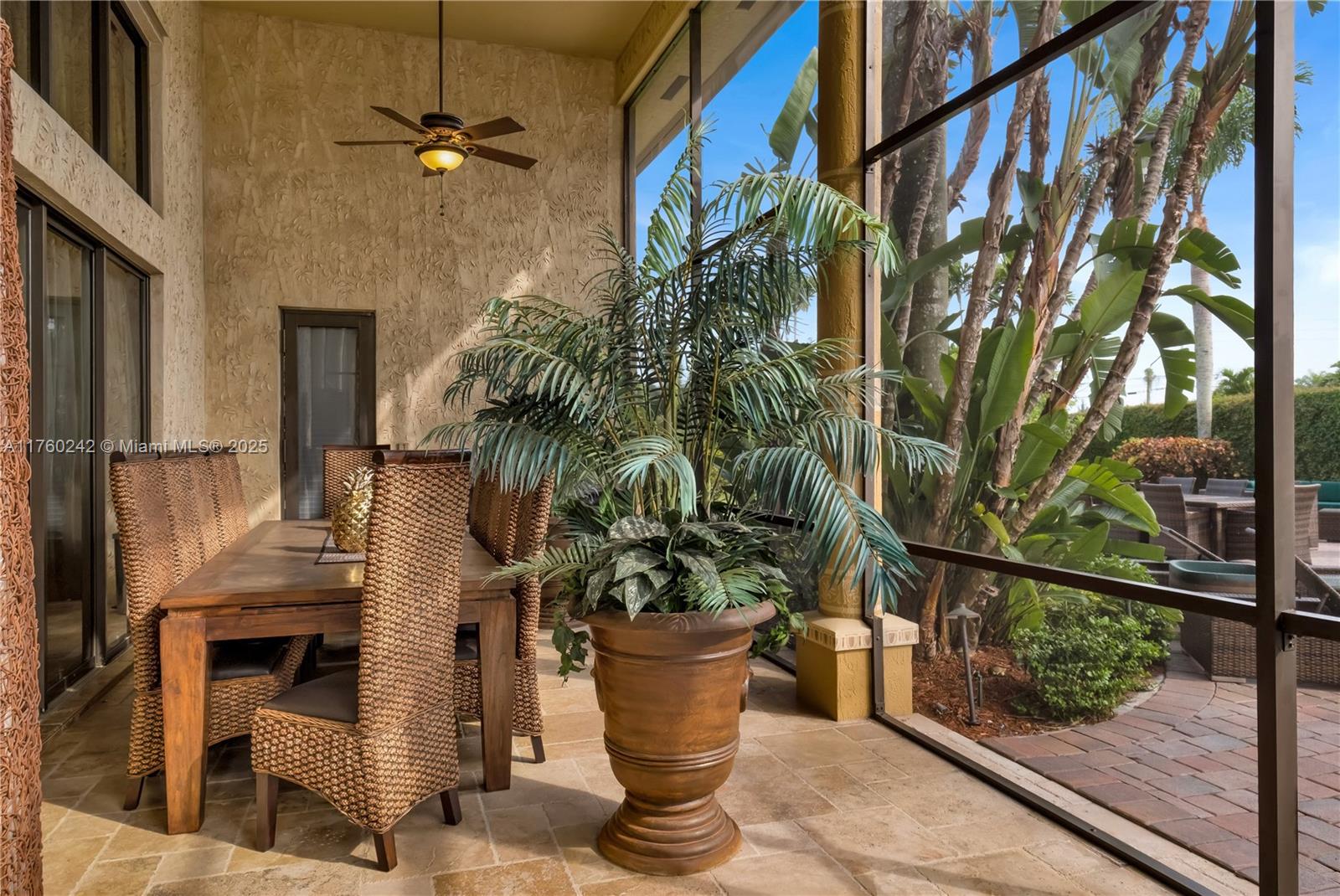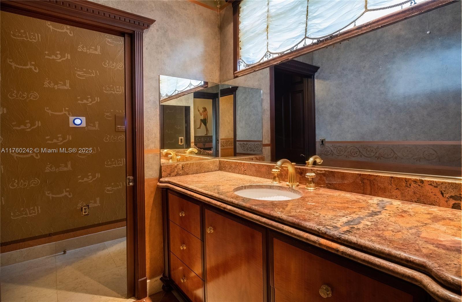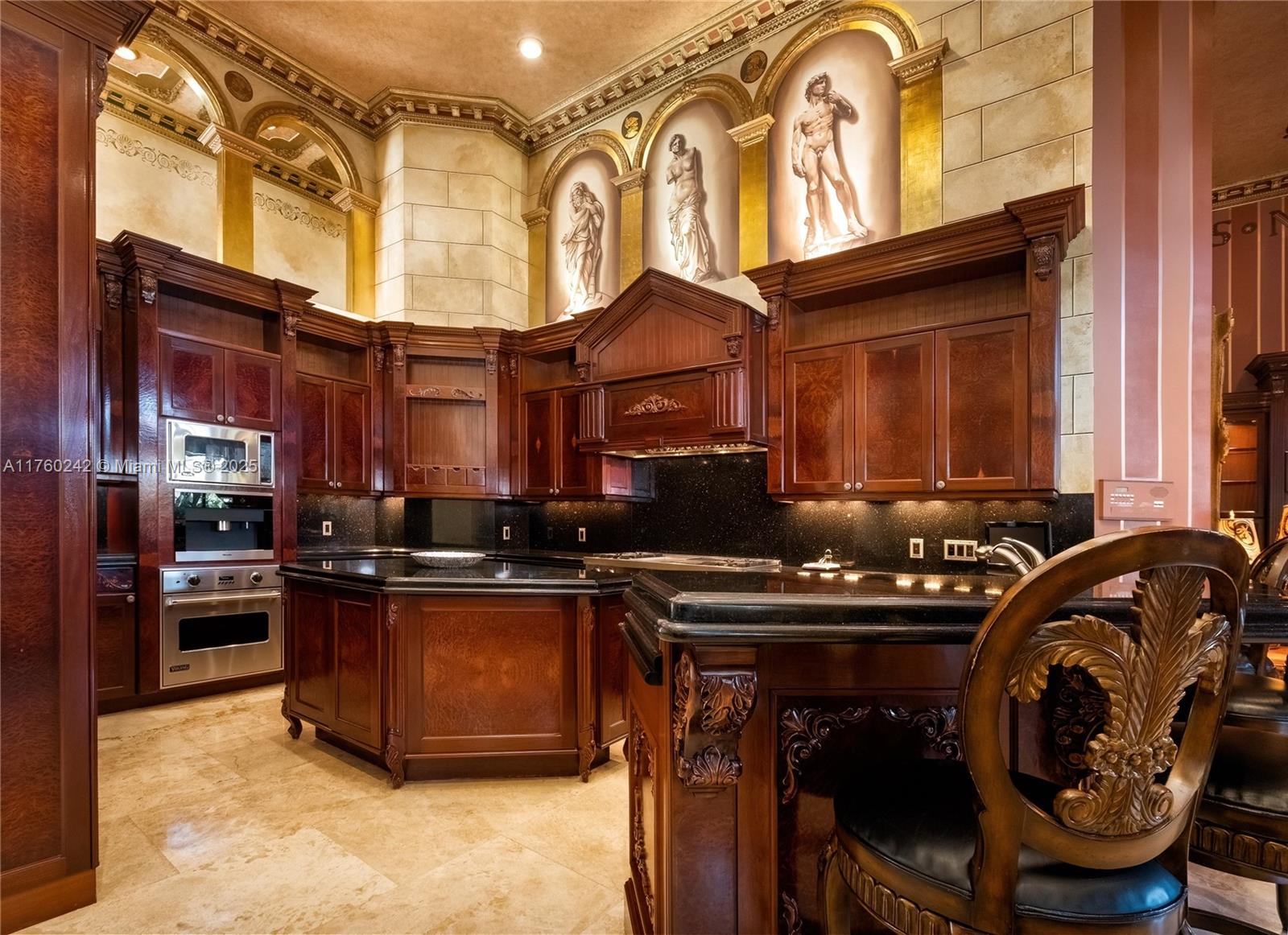 Discover a masterpiece in the Redlands! This exquisite estate features custom iron gates, a grand porte-cochere, and lush palm-lined landscaping. Inside, soaring ceilings, custom millwork, and hand-painted walls by a commissioned artist create a one-of-a-kind ambiance. Lavish window treatments, Birdseye Maple cabinetry, and opulent chandeliers, some 18K gold-plated, enhance its elegance. Offered fully furnished, this home boasts a screened lanai, lush gardens, and a sparkling pool—perfect for entertaining. A rare opportunity to own a true work of art!