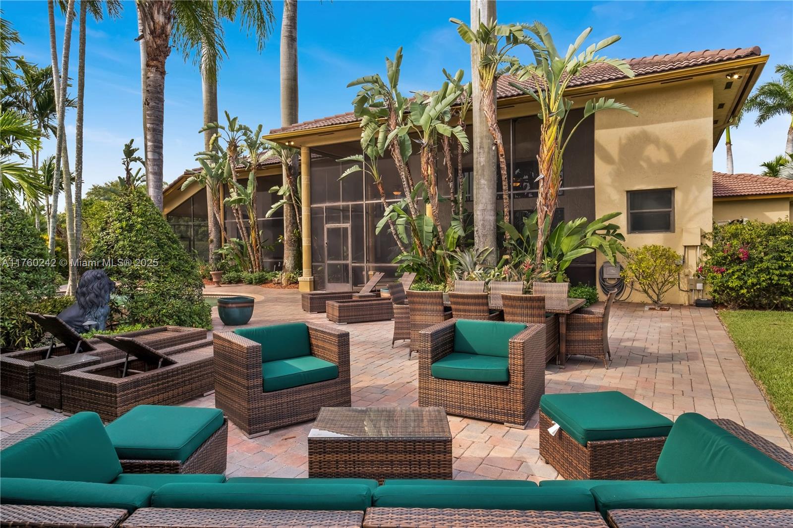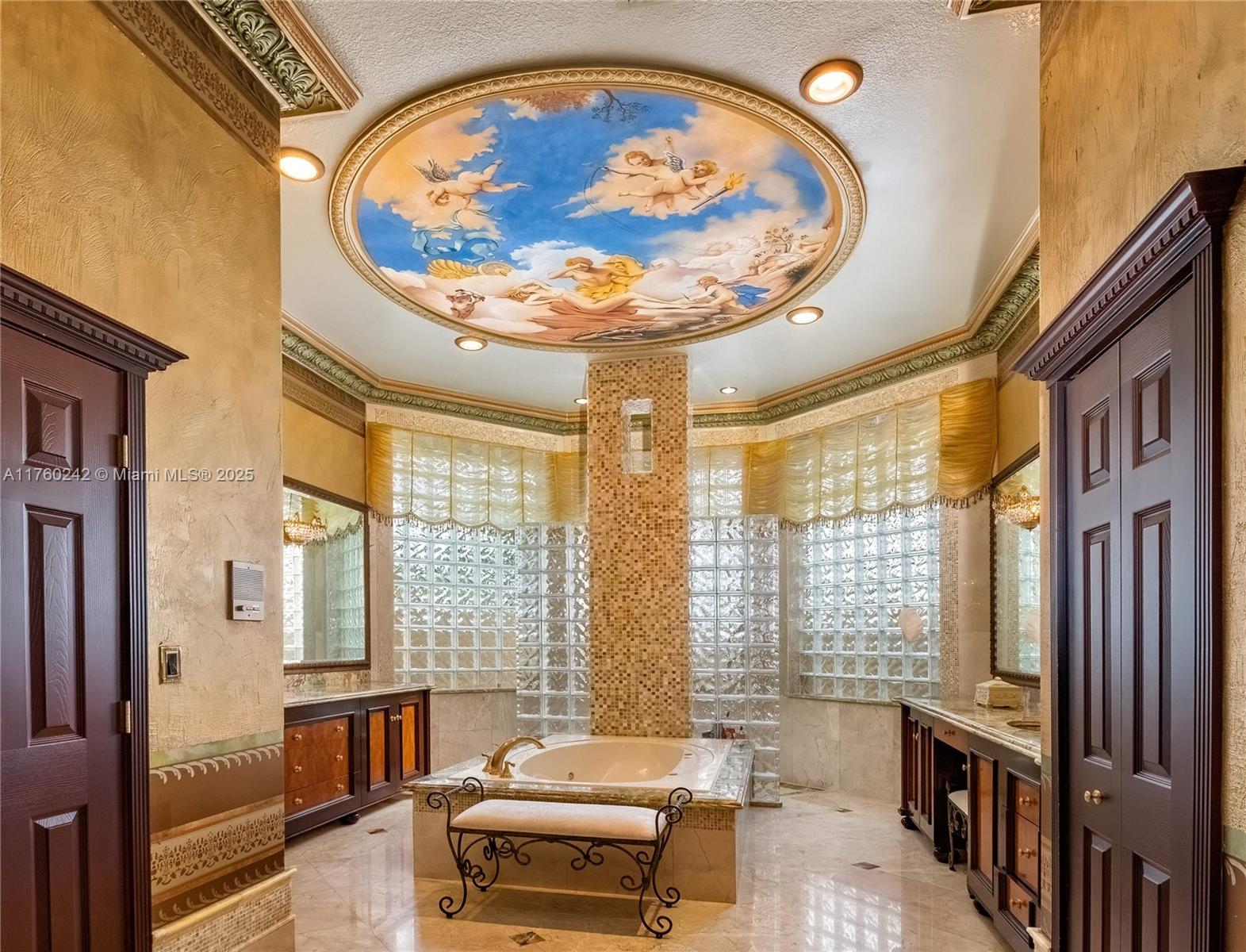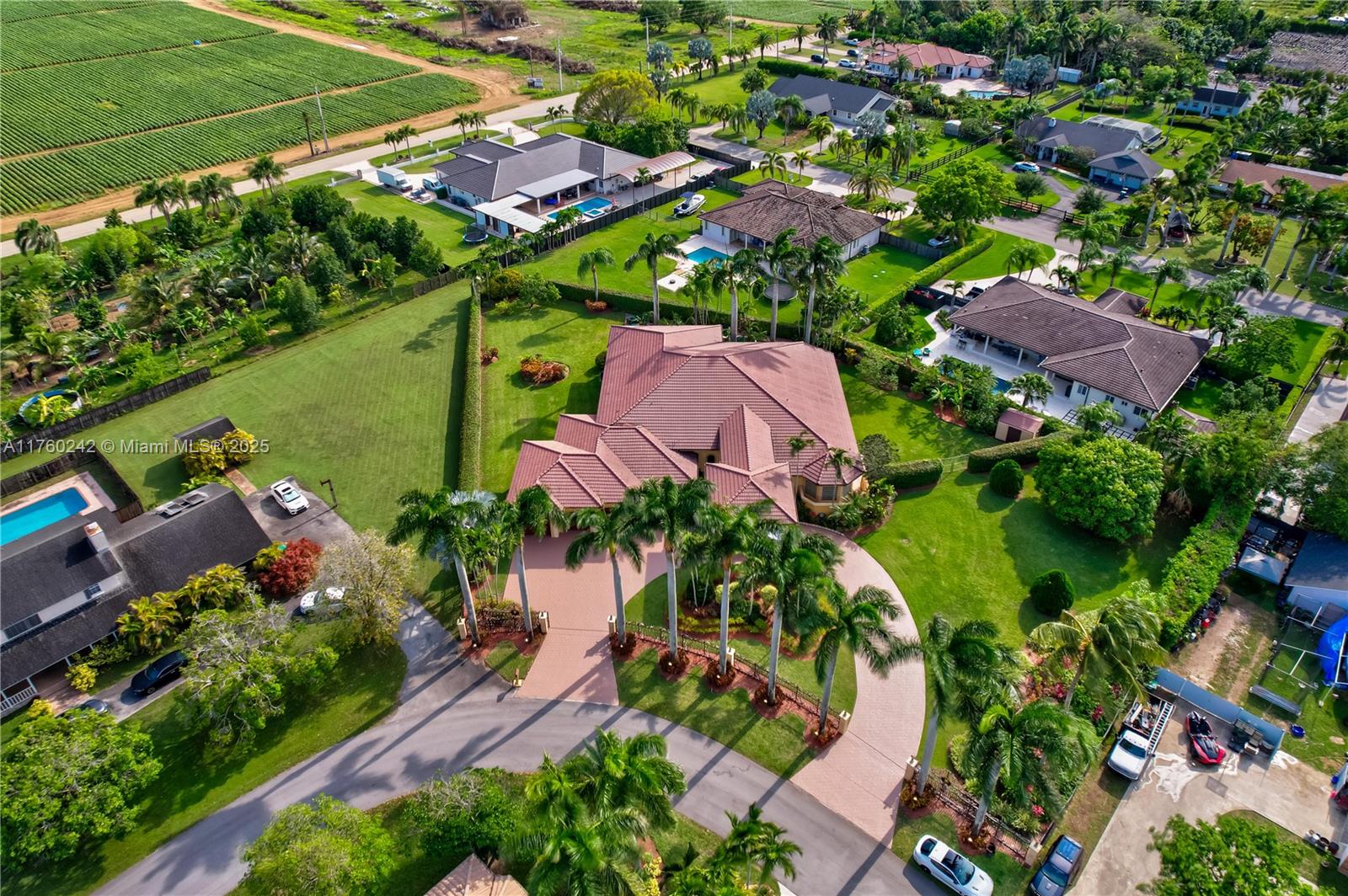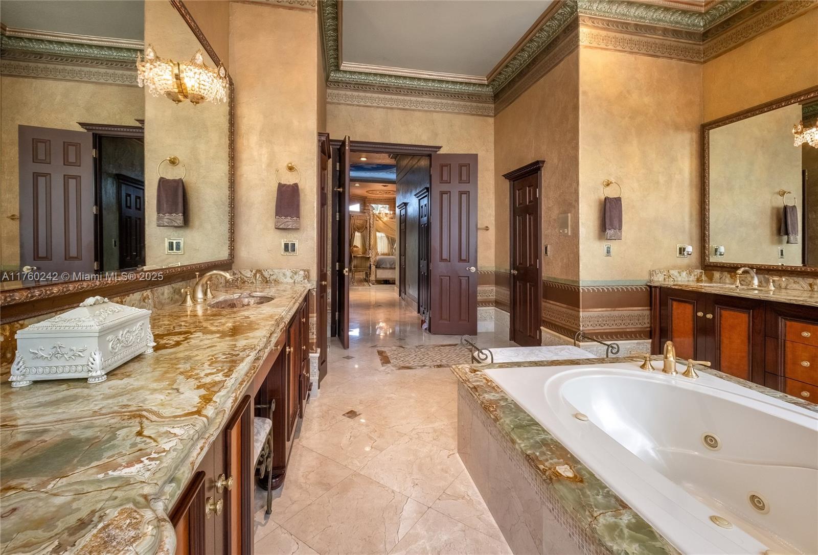 Discover a masterpiece in the Redlands! This exquisite estate features custom iron gates, a grand porte-cochere, and lush palm-lined landscaping. Inside, soaring ceilings, custom millwork, and hand-painted walls by a commissioned artist create a one-of-a-kind ambiance. Lavish window treatments, Birdseye Maple cabinetry, and opulent chandeliers, some 18K gold-plated, enhance its elegance. Offered fully furnished, this home boasts a screened lanai, lush gardens, and a sparkling pool—perfect for entertaining. A rare opportunity to own a true work of art!