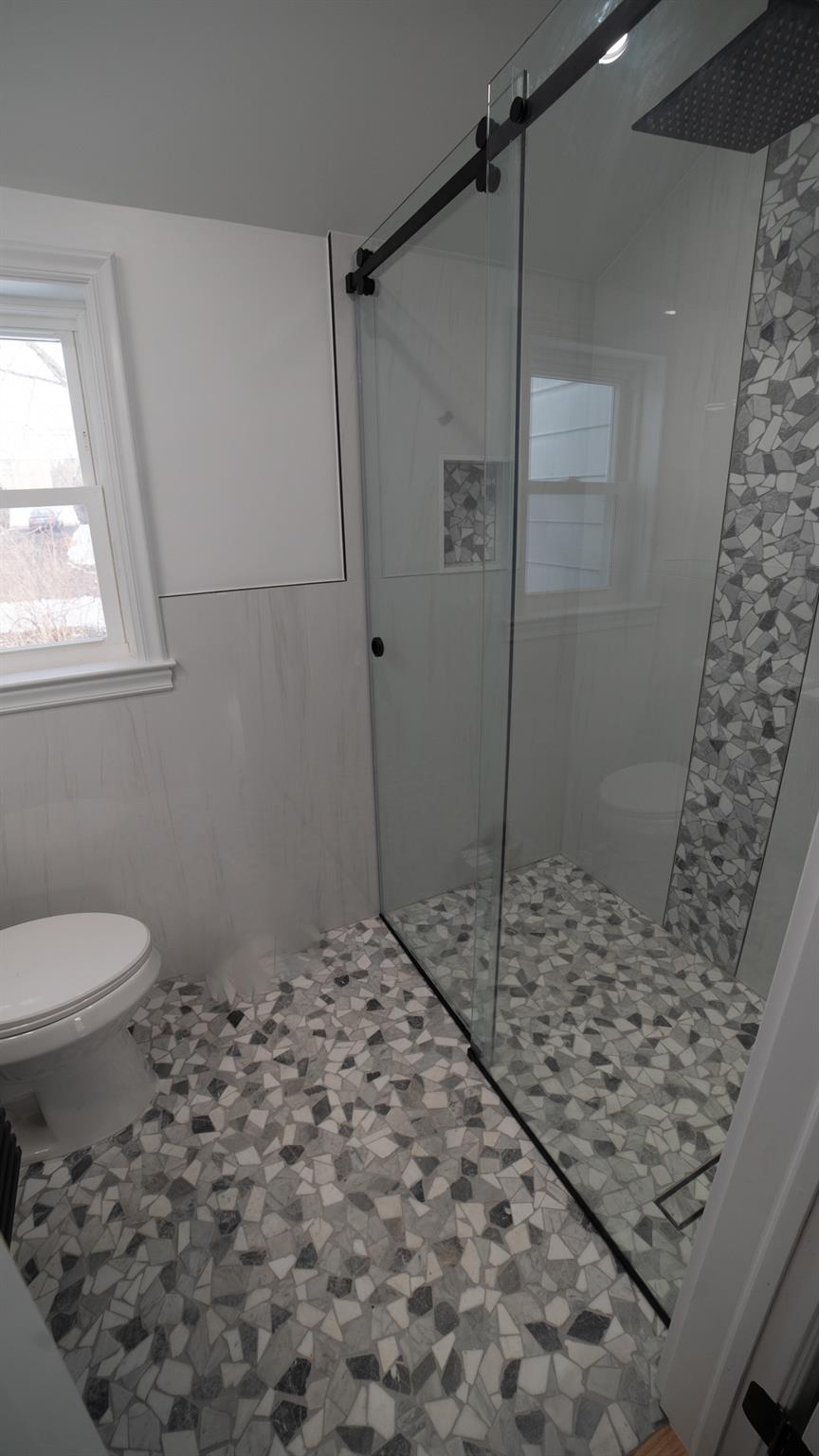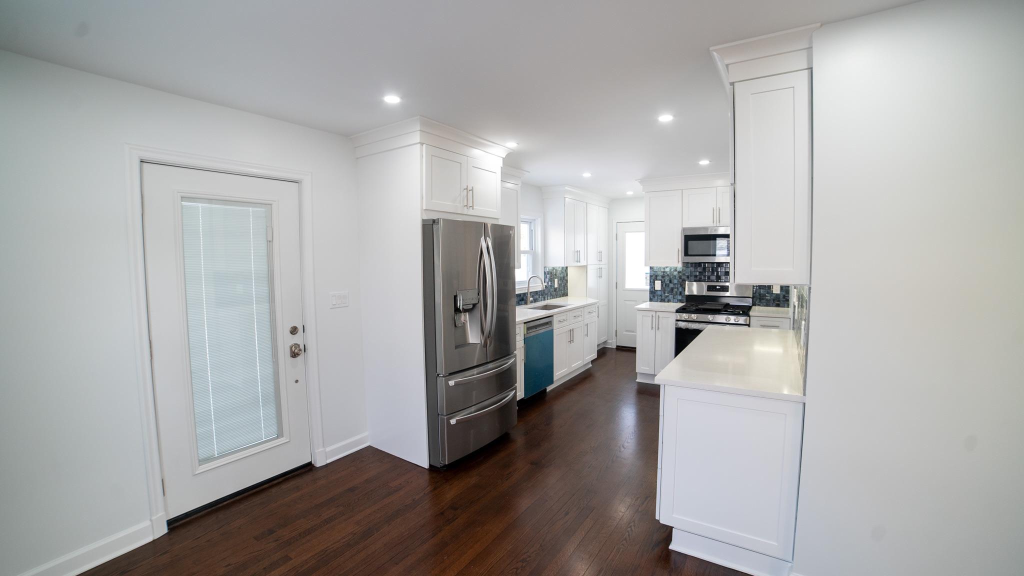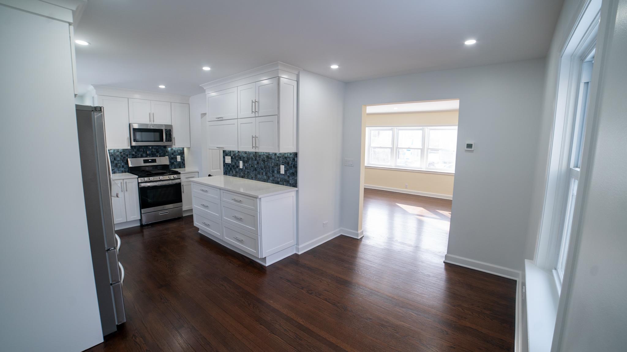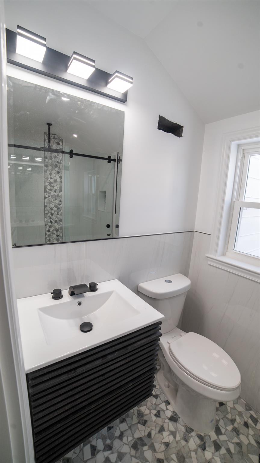 Come and see this exquisite, totally renovated 3 bedrooms/2. 5 baths home on a Cul de sac. It's as if brand new. . . featuring a new boiler and state of the art fixtures in 2. 5 bathrooms with spray jets, handheld shower sprays and rainfall shower heads. Also, fully tiled walls with seamless sliding glass doors in the showers complimented with floating vanities and quartz tops. Step into the inviting foyer area with beautiful hardwood floors continuing to the Living Room well-lit with radiant sunlight, and brand-new energy efficient windows and doors throughout the home; charmed with a rustic brick fireplace with built-ins on either side. The wall colors are soft neutrals giving a sense of elegance enhanced by the ceiling moldings. Enter the sizeable Formal Dining Room which has a door to the patio, juxtaposed to the walkthrough kitchen which has all new stainless-steel appliances, shaker wood cabinets, working counter space, glass-tiled backsplash and quartz countertops - all convenient for the Chef in your family! A door from the kitchen leads to a full unfinished, walkout basement with laundry hook-ups. Leading from the foyer up a few steps is the powder room and then on the other side to the Primary bedroom - its own full bathroom, walk-in closet and ceiling fan. There are two hall closets. Going up a few more steps are 2 sizeable bedrooms with ceiling fans. There is an upscale full hall bath with modern fixtures. This home boasts recessed lighting throughout and modern light fixtures. There is a patio area in the rear leading from the Dining Room. Lots of yard space to do some special plantings and entertaining. This home can be easily converted to Central Air conditioning as the vents are in place already. A dream house to live in!